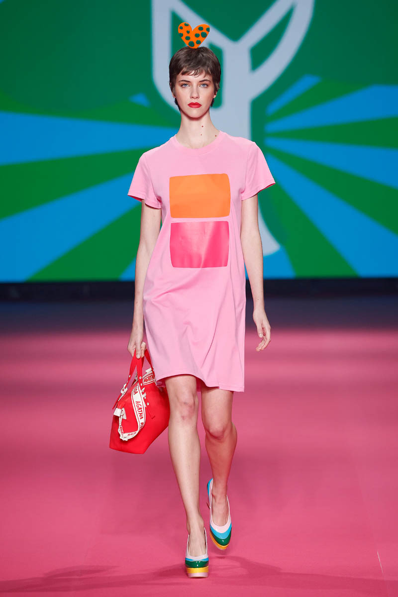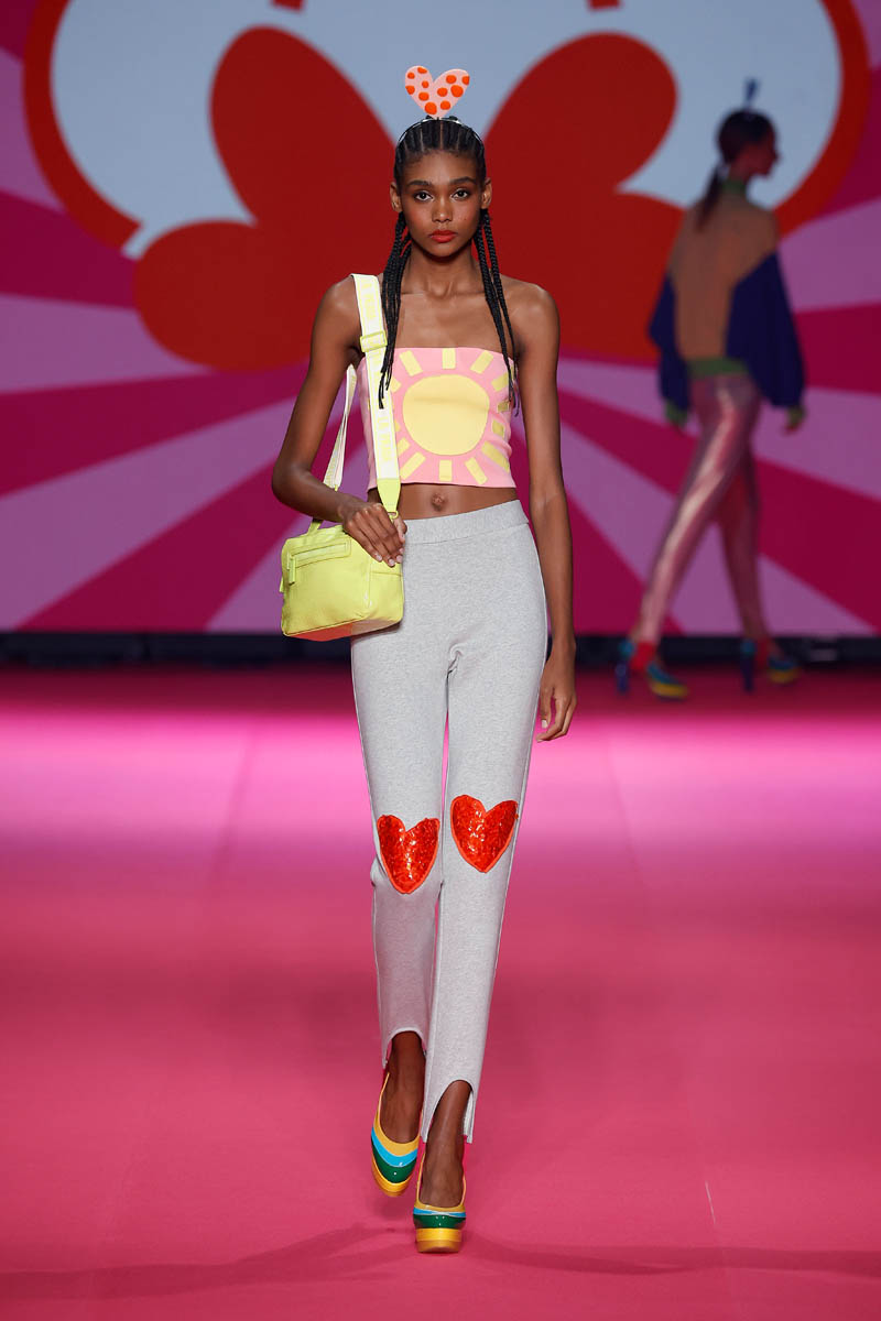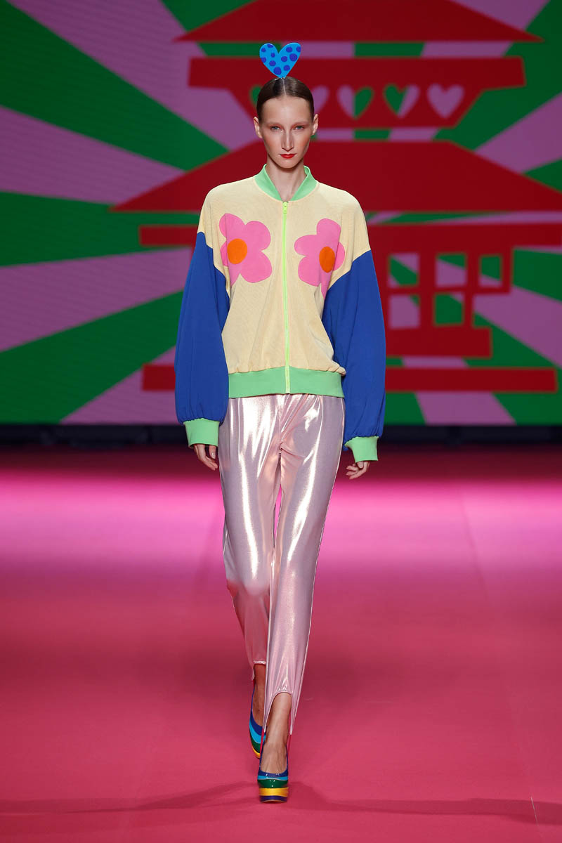 Sus archiconocidos símbolos como corazones, nubes y flores vuelven a colarse en sus propuestas plasmados en camisetas, caftanes, vestidos y pantalones fuseau. Las aplicaciones de cuadrados de tela, a modo de post-it, configuran la prendas más sofisticadas de la diseñadora para la próxima temporada.