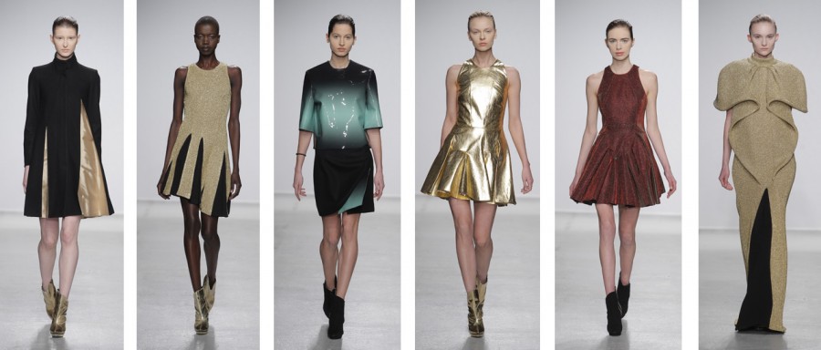 La lana, el cuero o el punto de lurex son los materiales sobre los que ha creado grandes volúmenes y formas. Pliegues concentrados en la cintura y los hombros, plisados simétricos, fuelles duales o de dos colores, brillos y tablas se presentan en tonos dorados, negro, verde, rojo o azul en una colección que expresa fuerza y poder.[:]