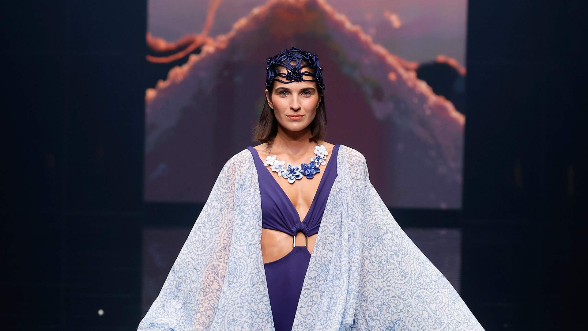 Inspirada en la fuerza sagrada del océano y en las siluetas de la Antigua Grecia, Lazuliflow encuentra en túnicas, capas y vestidos asimétricos un eco helénico reinterpretado desde la contemporaneidad. Los bordados sobre transparencias evocan flores y corales, mientras las gasas emergen como espuma marina y las organzas se abren como velas al viento. Es un recorrido donde cada textura parece hablar del movimiento del agua y de la memoria que guarda el mar.