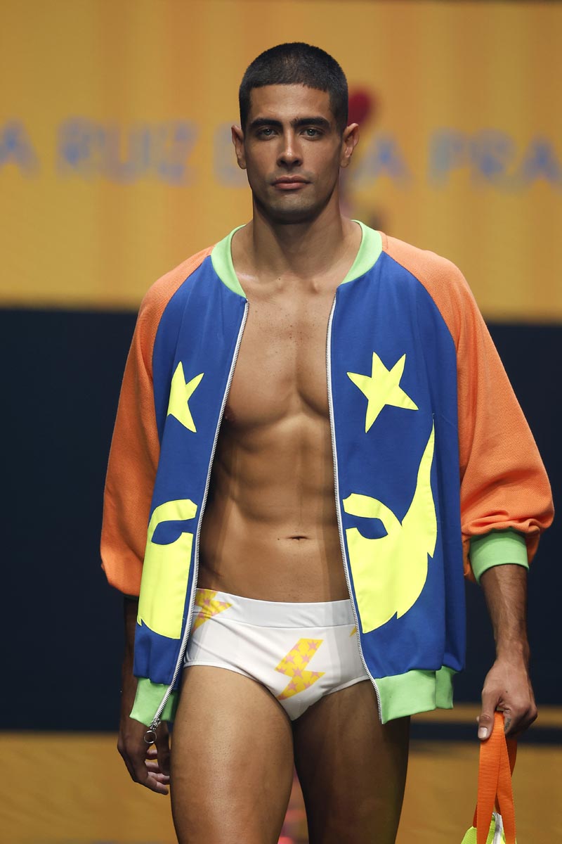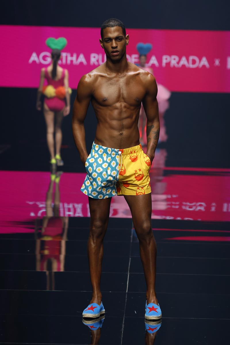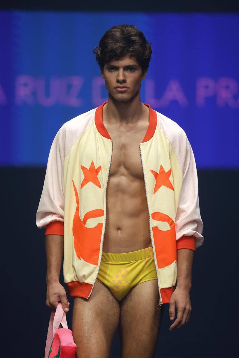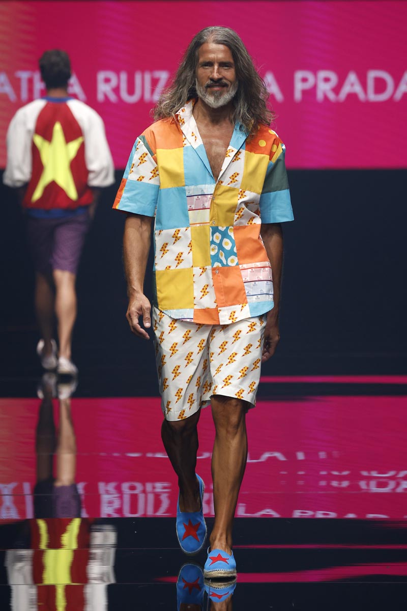 AGATHA RUIZ DE LA PRADA X BELTHO COUTURE es una colección de hombre y mujer en colores verde y naranja, bermudas, chaquetas, bomber, camisas patchwork, slips de licra, trajes de baño, maxibolsos estampados y alpargatas PICÓN.