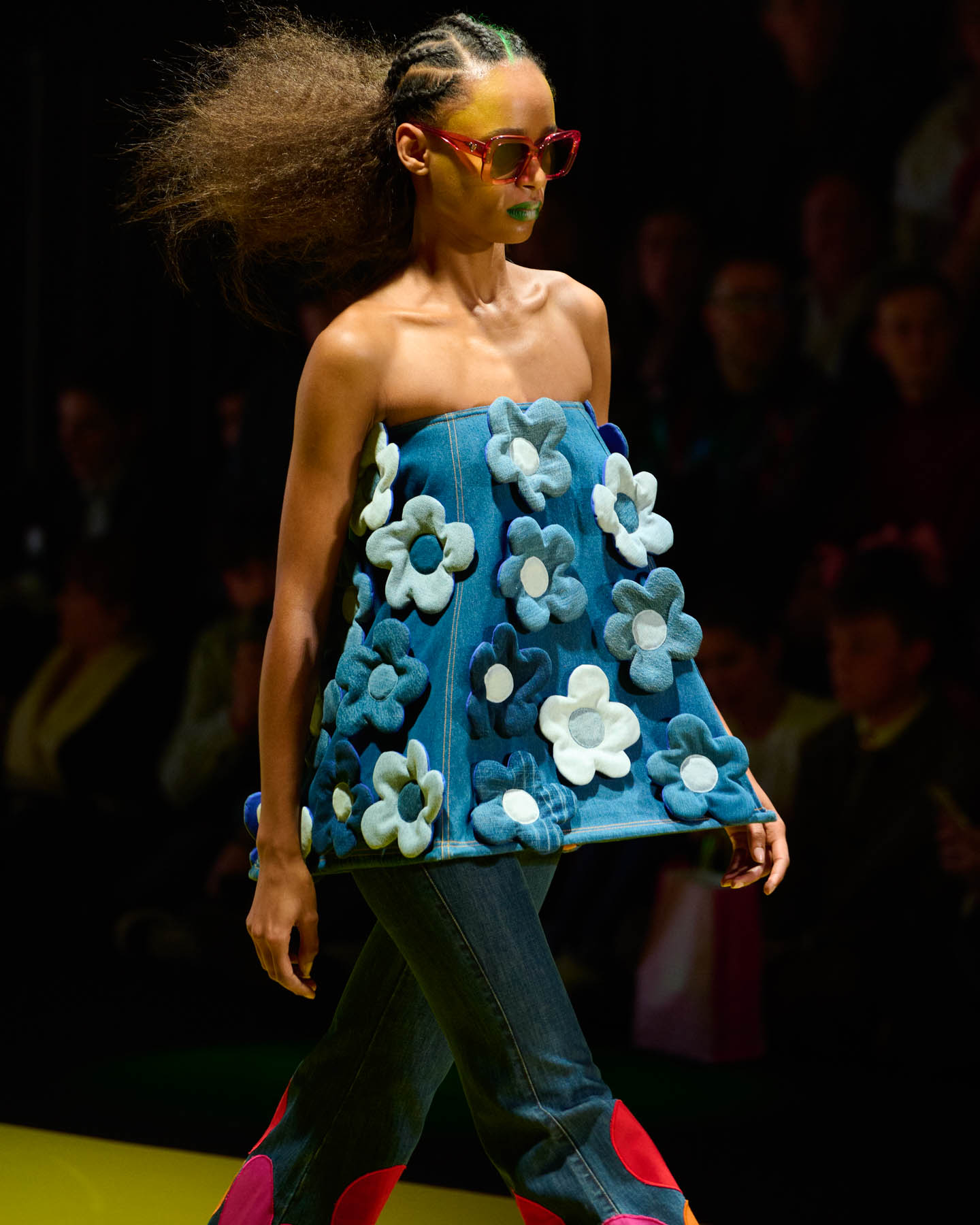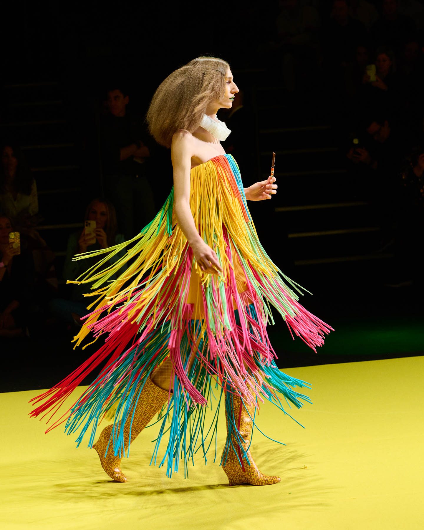 With a focus on sustainability, the firm transforms garments destined for discard into runway pieces. Shirts are reimagined into skirts, tops and dresses; cords and fabric scraps become fringes giving the dresses movement, and denim is reinvented into the firm’s iconic worm dress. The wedding dress is created from white shirts and the footwear has been rescued from archive models that have already been showcased in previous runways.