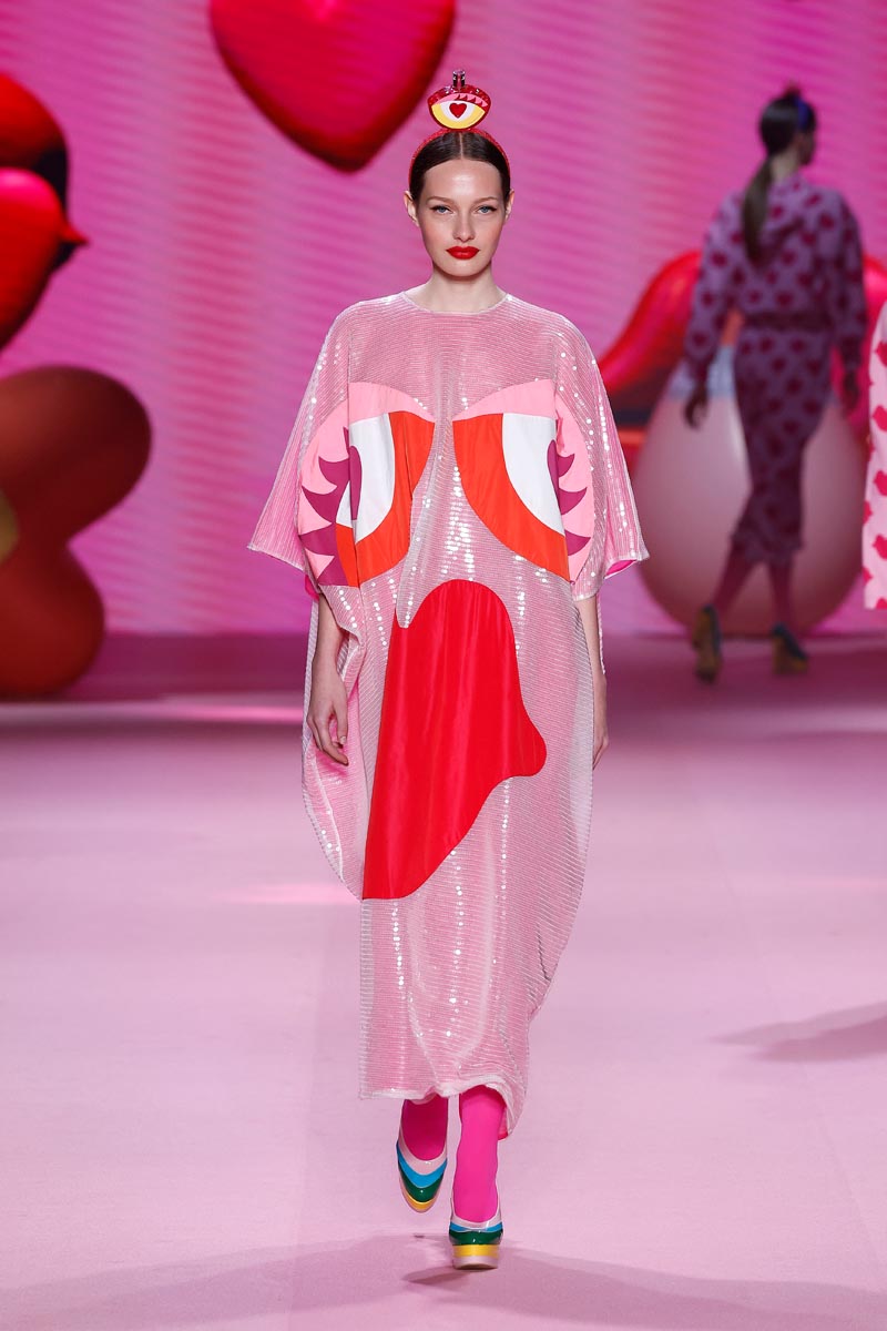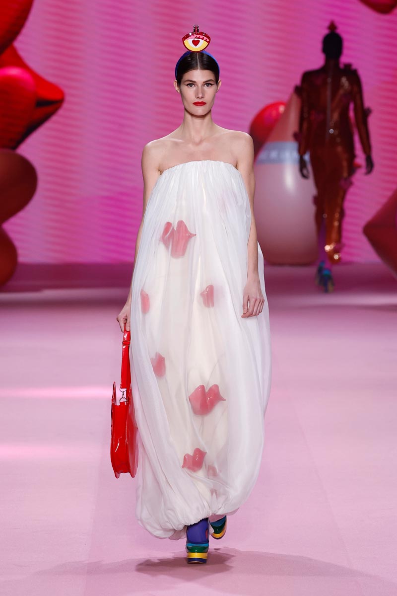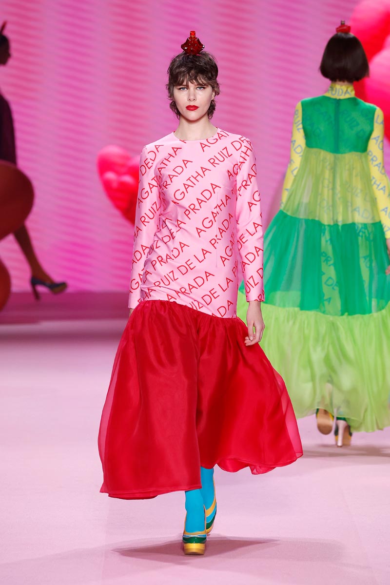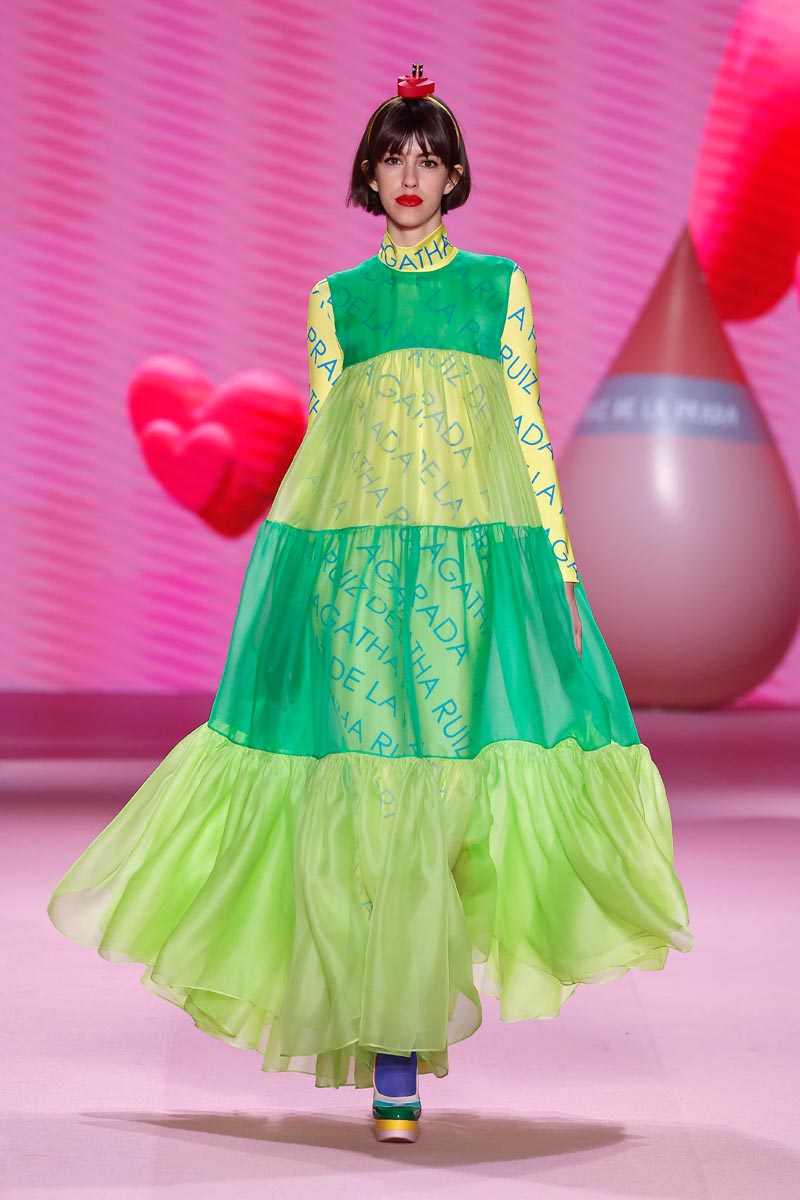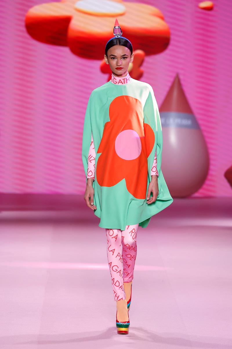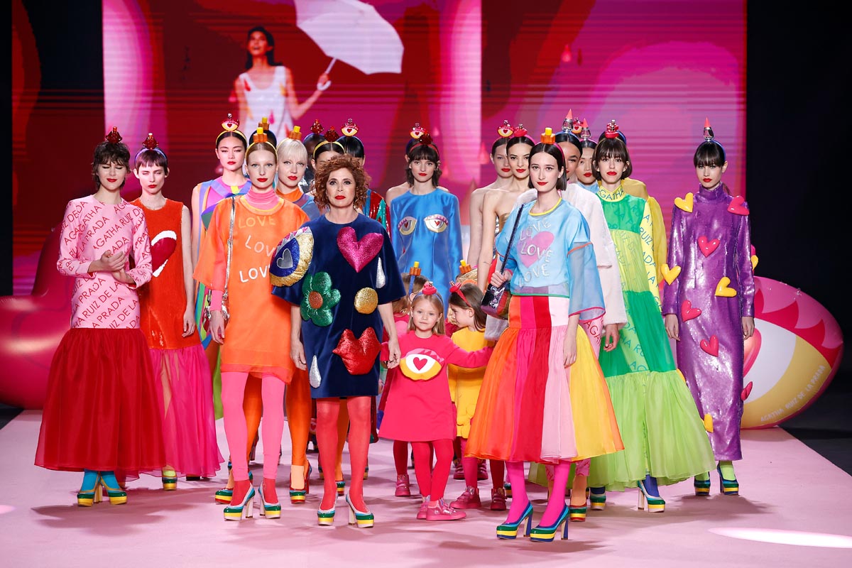 The fashion show’s five protagonist perfumes: Flor, Gotas de Color, Beso, Love and Look, materialize in flowers, swollen lips and multi-coloured raindrops that emerge among puffy dresses, kaftans, capes with large taffeta bows and strapless dresses. Transparent organza, sequins in multiple versions, Lycra, velvet and stuffed animals play with the senses ―more visual than olfactory― of an ‘agathized’ public.