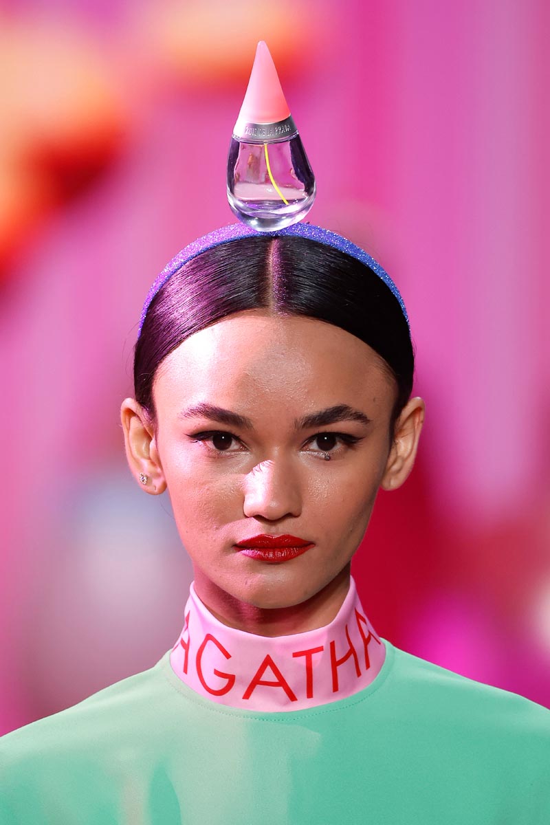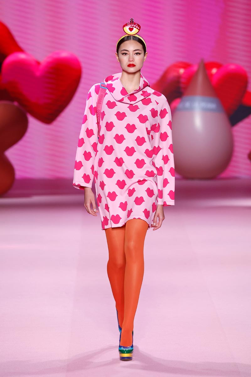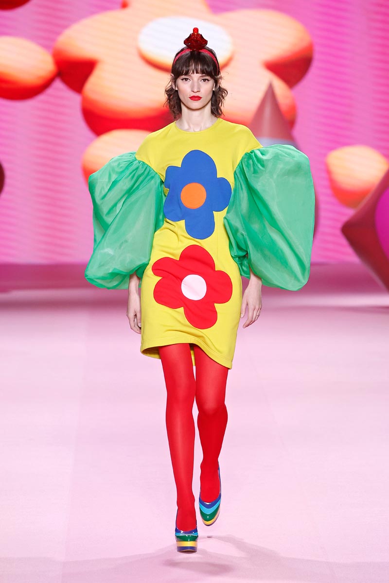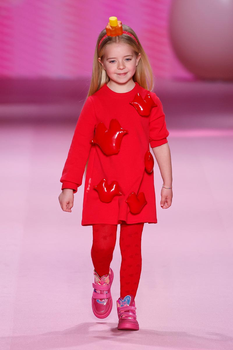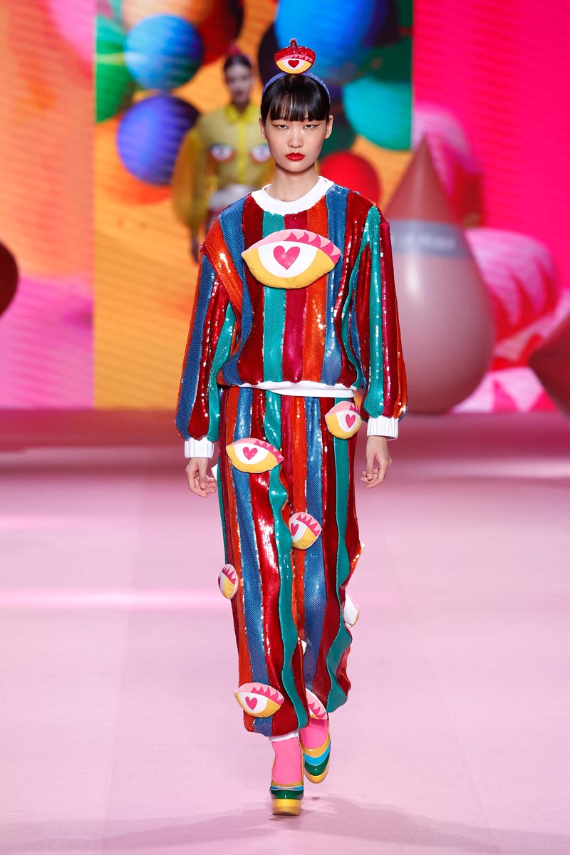 The fashion show’s five protagonist perfumes: Flor, Gotas de Color, Beso, Love and Look, materialize in flowers, swollen lips and multi-coloured raindrops that emerge among puffy dresses, kaftans, capes with large taffeta bows and strapless dresses. Transparent organza, sequins in multiple versions, Lycra, velvet and stuffed animals play with the senses ―more visual than olfactory― of an ‘agathized’ public.