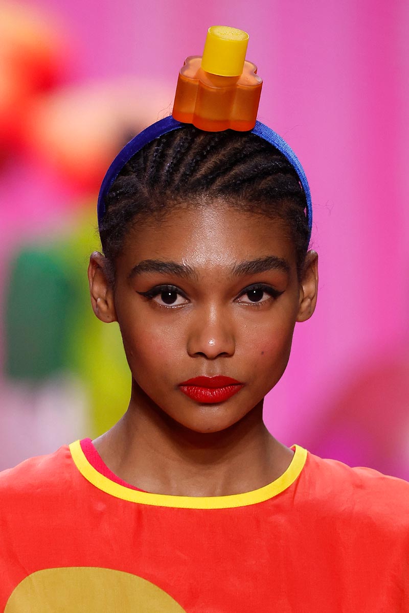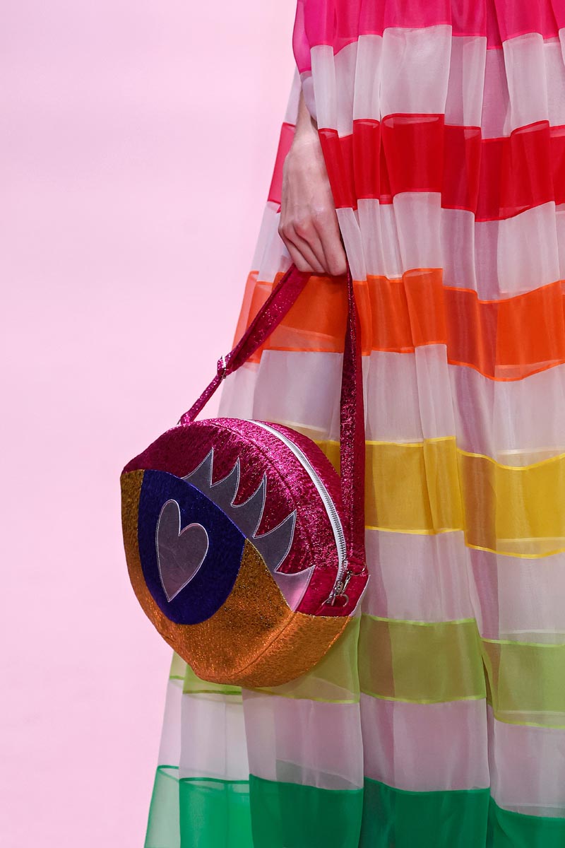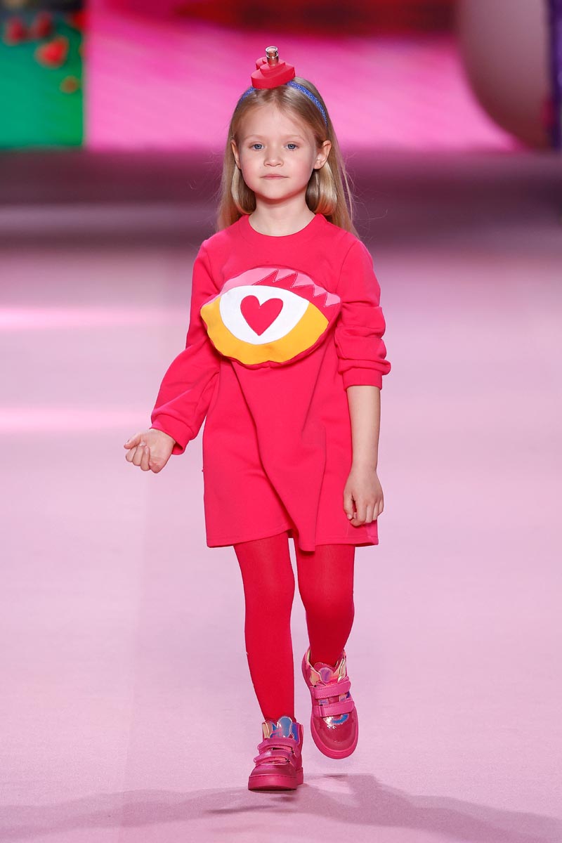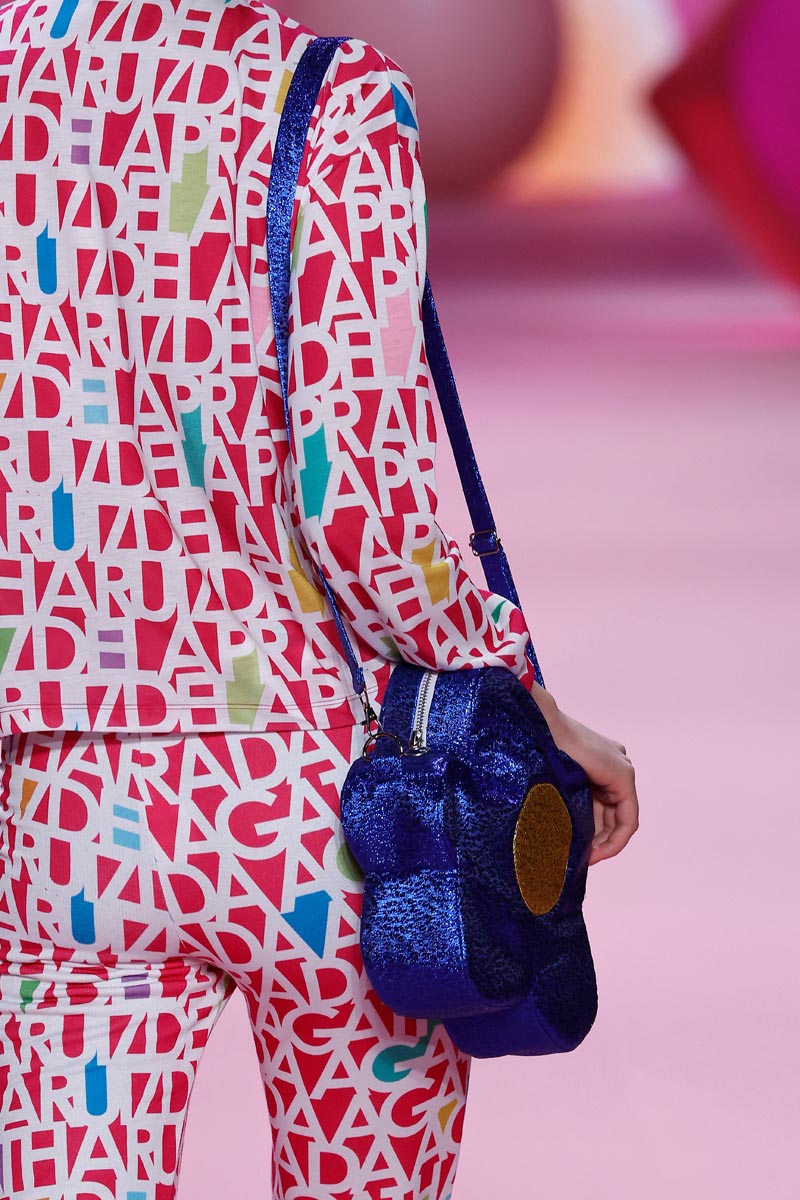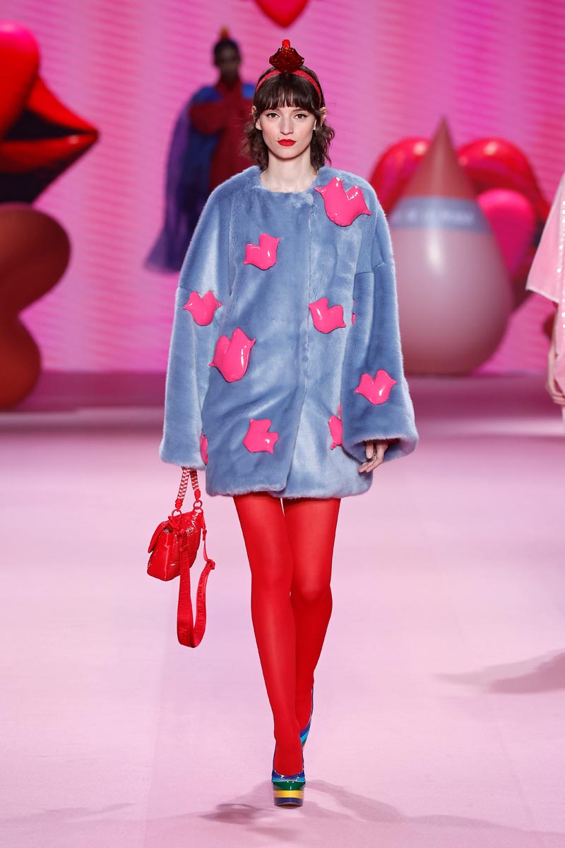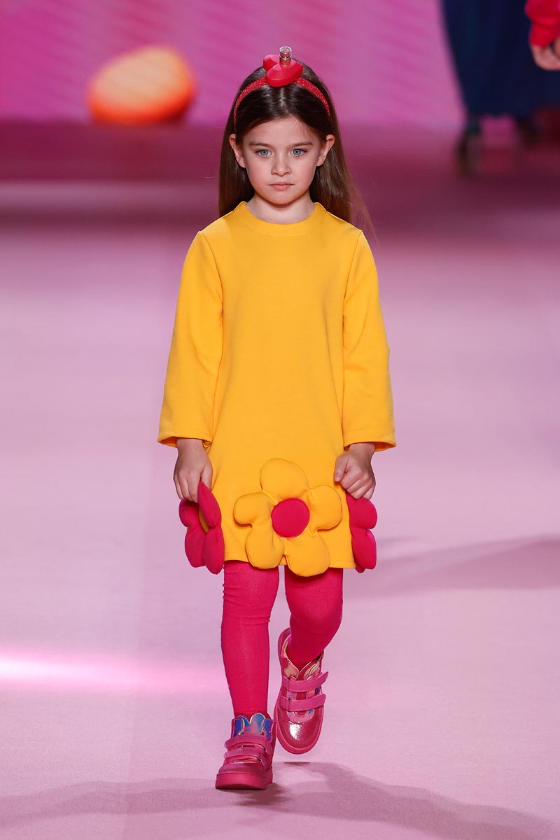 The fashion show’s five protagonist perfumes: Flor, Gotas de Color, Beso, Love and Look, materialize in flowers, swollen lips and multi-coloured raindrops that emerge among puffy dresses, kaftans, capes with large taffeta bows and strapless dresses. Transparent organza, sequins in multiple versions, Lycra, velvet and stuffed animals play with the senses ―more visual than olfactory― of an ‘agathized’ public.