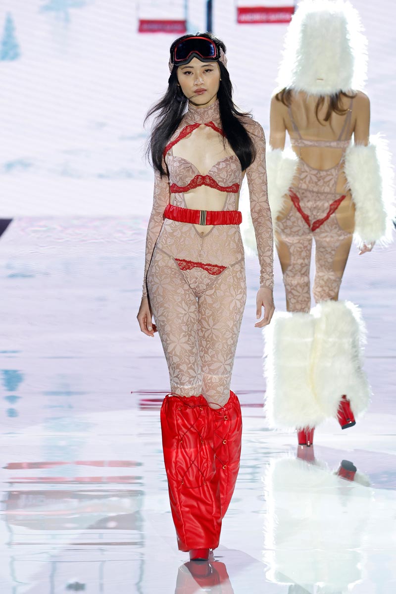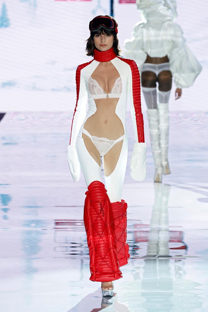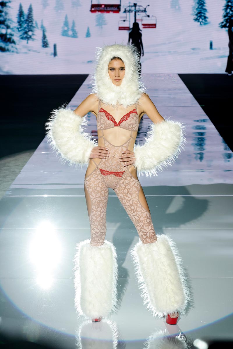 The fashion brand presents looks to sky all day long. For the morning, Sardá proposes all kinds of lingerie-inspired garments based on silver French embroidery combined with satin, embroideries with animal print motifs, golden tulle and Swarovski crystal. To glide down the snow-covered slopes, lace garments appear on the catwalk in contrast with more sporty pieces, predominantly red and white. To spend the afternoon in a mountain setting, the Catalan firm presents their own version of down jackets and sartorial suits. And finally, for the evening, Sardá suggests synthetic leather garments in vibrant colours that contrast with sets of underwear made in Lycra and lace. Metallic dresses and a white satin suit with Swarovski crystal close the brand’s most wintery presentation.