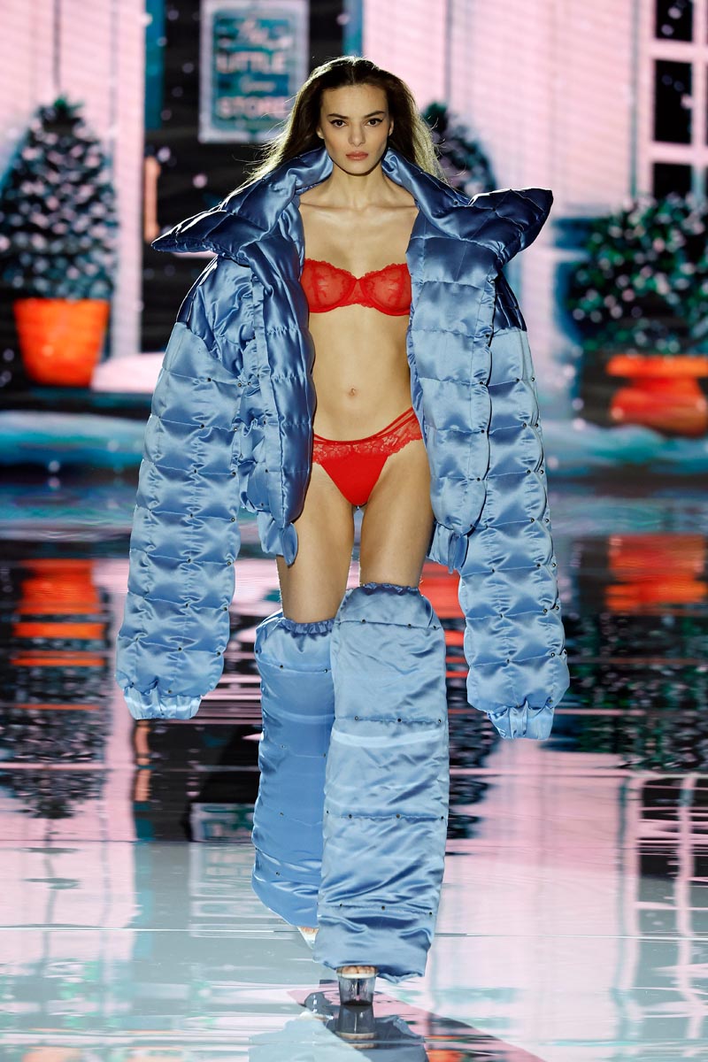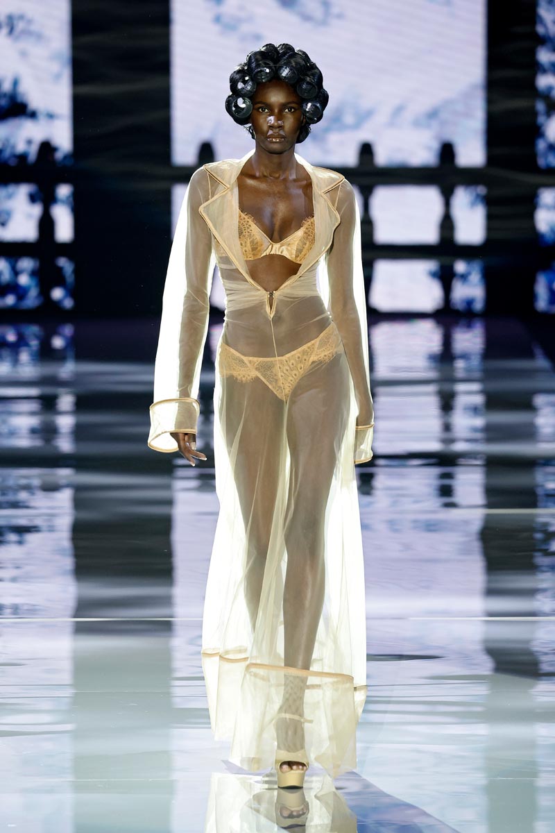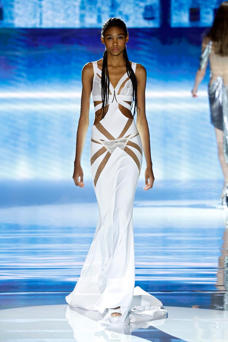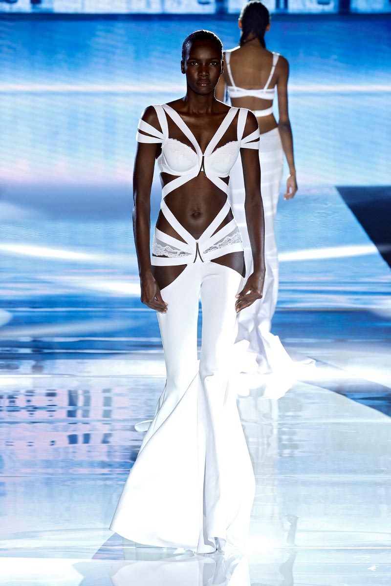 The fashion brand presents looks to sky all day long. For the morning, Sardá proposes all kinds of lingerie-inspired garments based on silver French embroidery combined with satin, embroideries with animal print motifs, golden tulle and Swarovski crystal. To glide down the snow-covered slopes, lace garments appear on the catwalk in contrast with more sporty pieces, predominantly red and white. To spend the afternoon in a mountain setting, the Catalan firm presents their own version of down jackets and sartorial suits. And finally, for the evening, Sardá suggests synthetic leather garments in vibrant colours that contrast with sets of underwear made in Lycra and lace. Metallic dresses and a white satin suit with Swarovski crystal close the brand’s most wintery presentation.