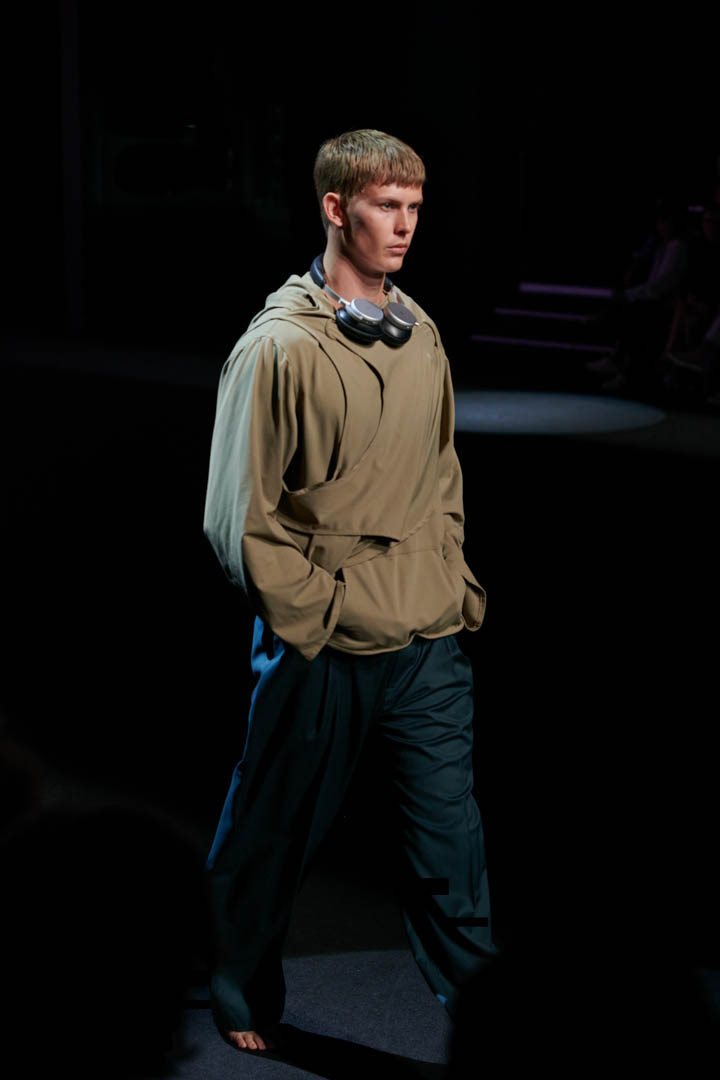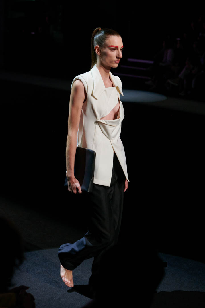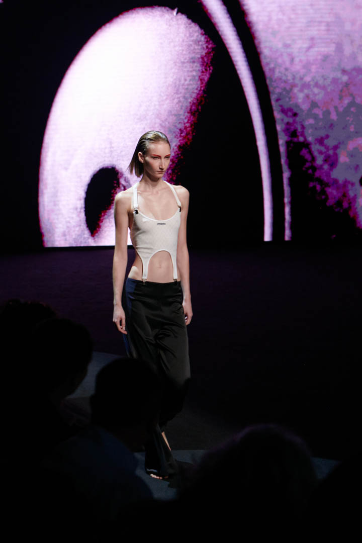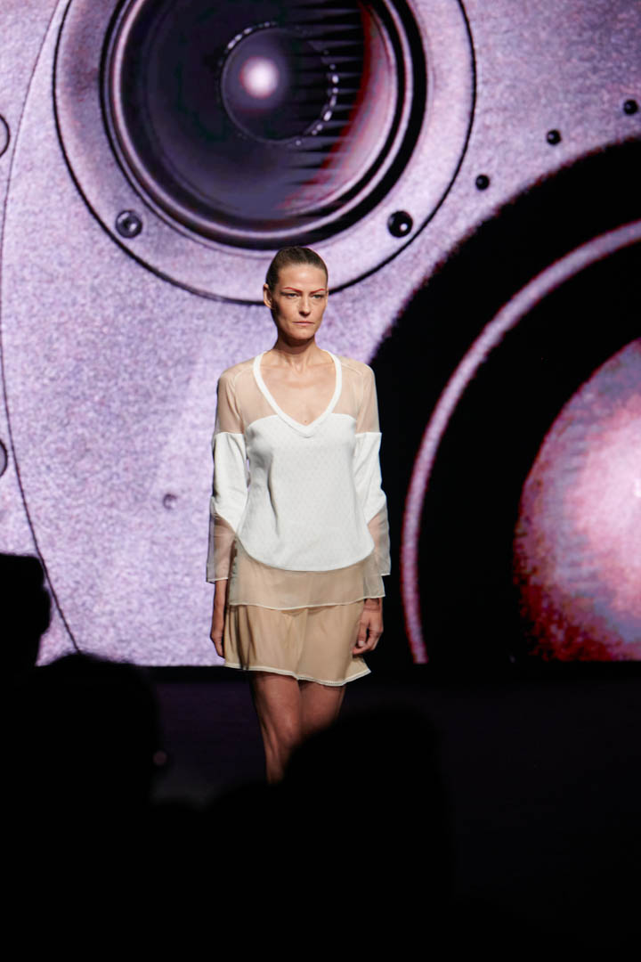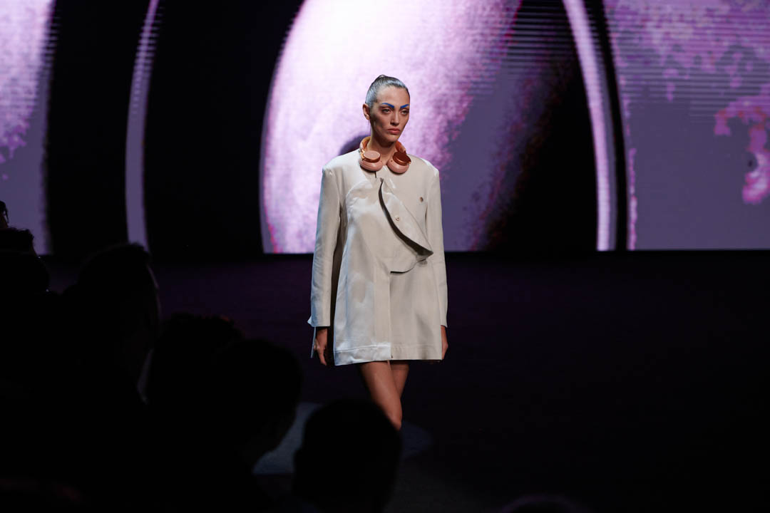 The circle, together with perfection are the central themes of Bernhayer’s new collection presented at Mercedes-Benz Fashion Week Madrid. Technology, as a fashion accessory, is ubiquitous through Bang & Olufsen’s gadgets – the high-end sound technology brand has collaborated with luxury Houses such as Balenciaga or Saint Laurent. The collection’s silhouettes and patterns are a continuity of Berhanyer‘s evolution through over evasé shapes full of curves and circles. These elements create visual games of opacity and transparency that enhance sensuality. Sergio de Lázaro, creative director of the fashion brand, also proposes a mix of natural and technological textures in a constant balance between tradition and a glimpse to the future. Cotton poplin and cold wool are intertwined with metallic finishes technical fabrics, while silk organza and iridescent denim add high doses of sophistication. The colour palette is inspired by limestone and the Mediterranean’s blue tones.