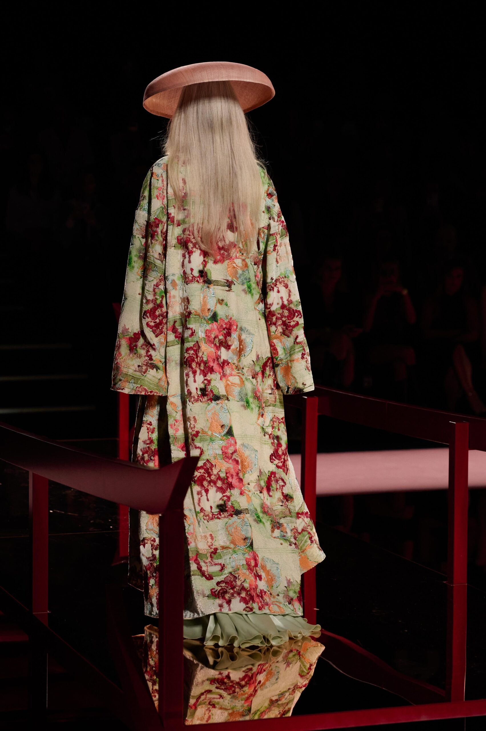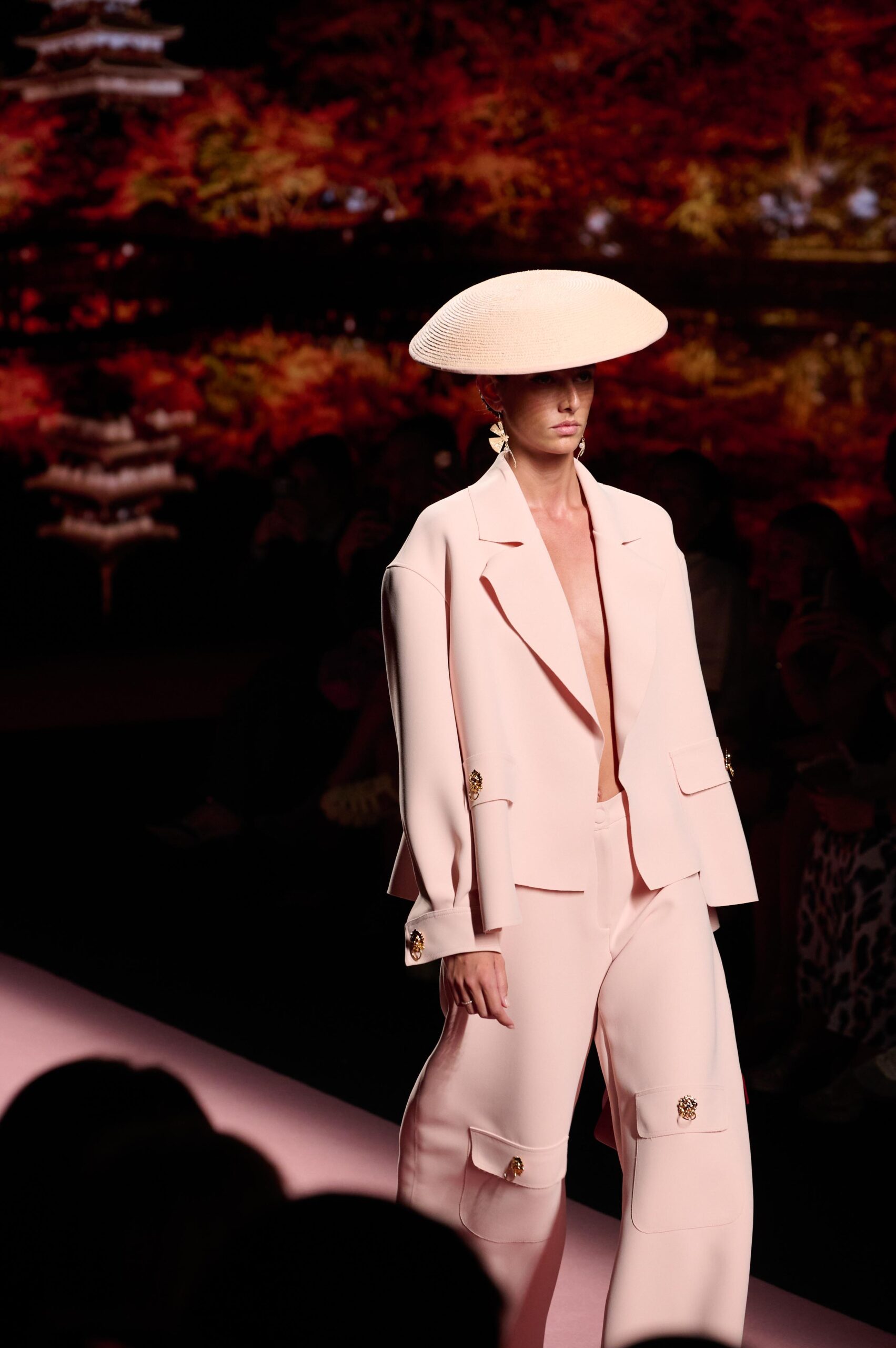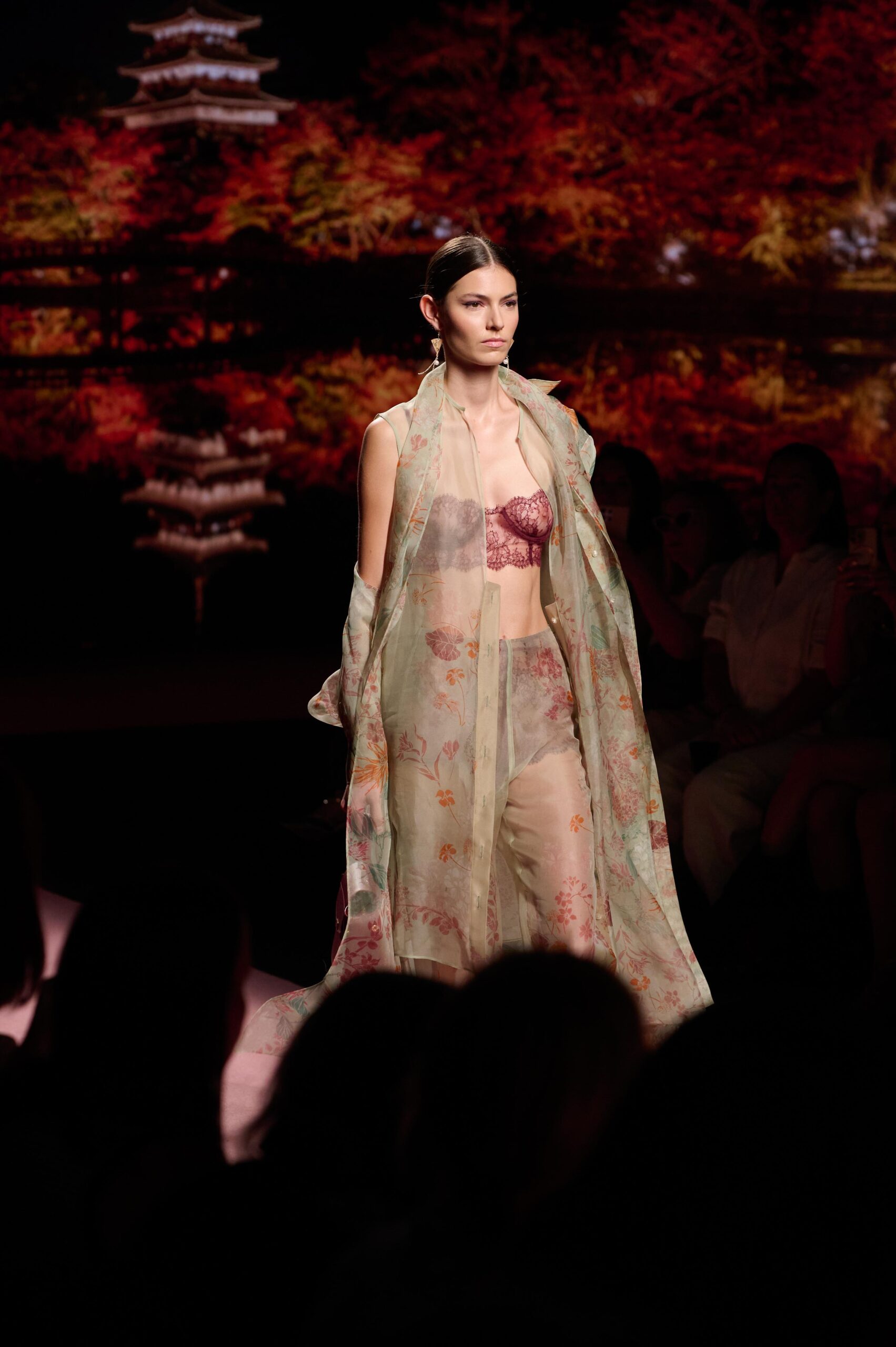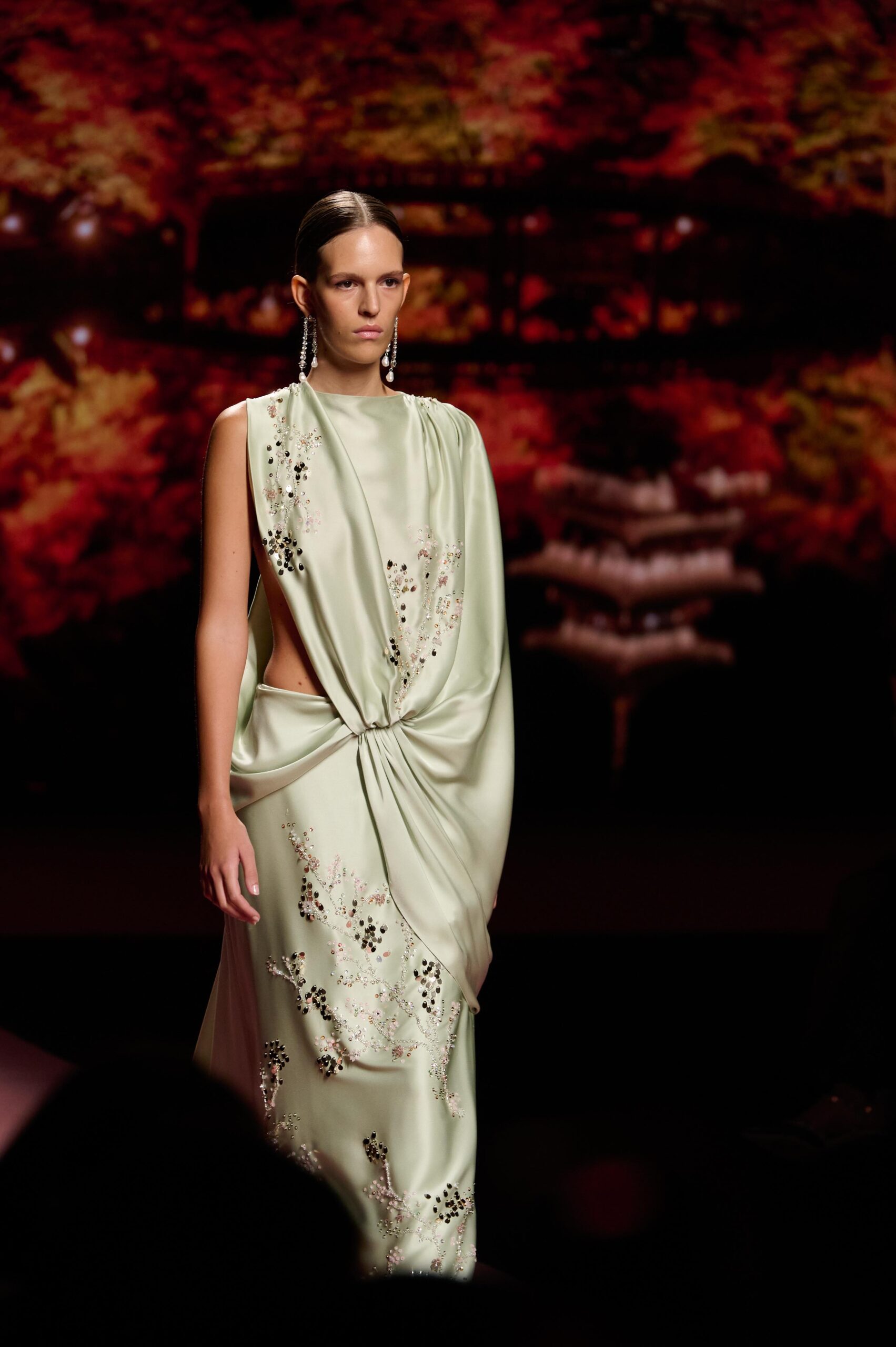 Inspired by ash trees and Japanese murals, the collection features fabrics with prints and embroideries that evoke a natural and cultural imagery, reinterpreted with contemporary sensibility. Soft greens, oranges, and pinks adorn flowing dresses and ready-to-wear pieces, where delicate, handcrafted pleats enhance movement.