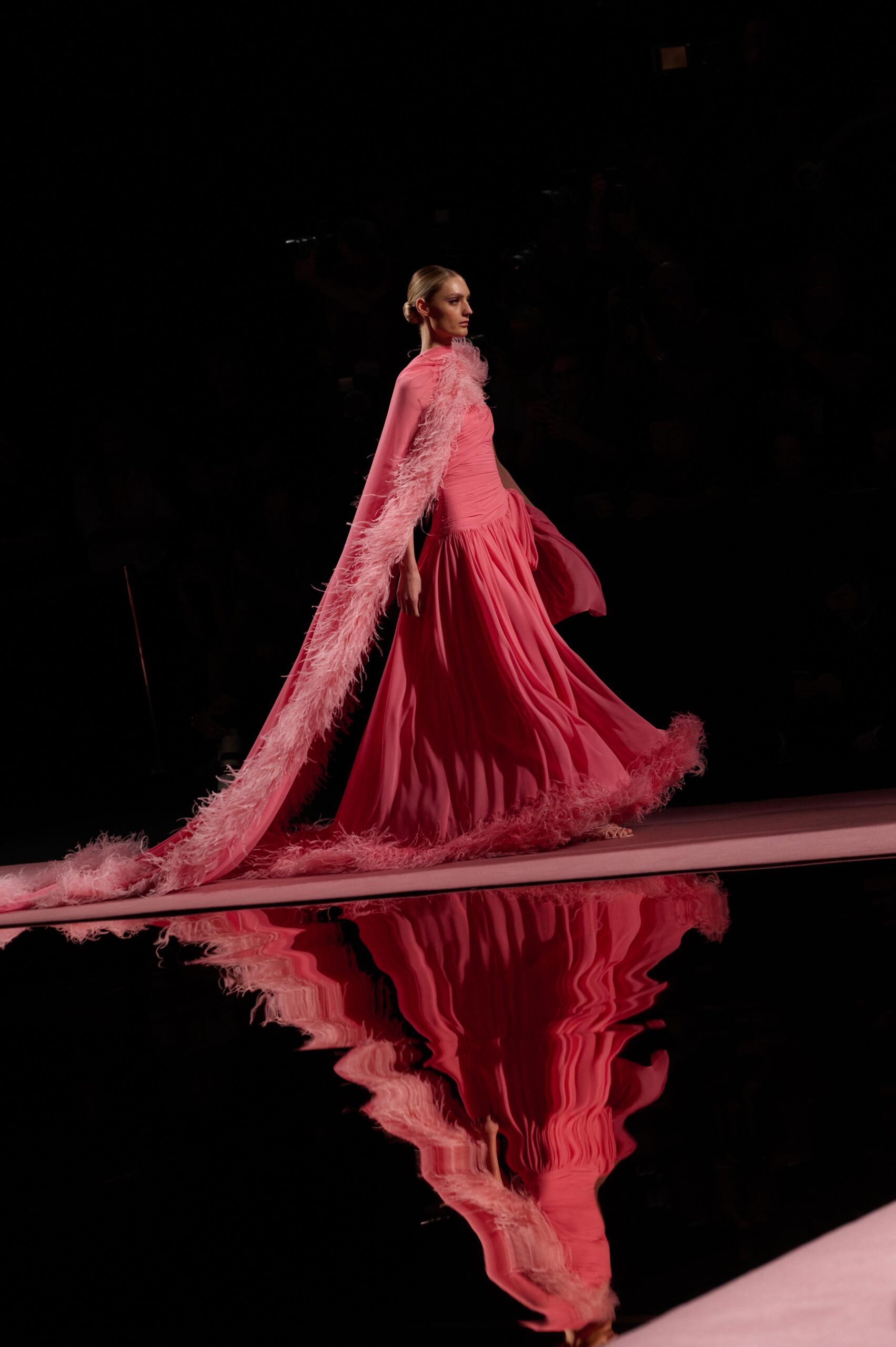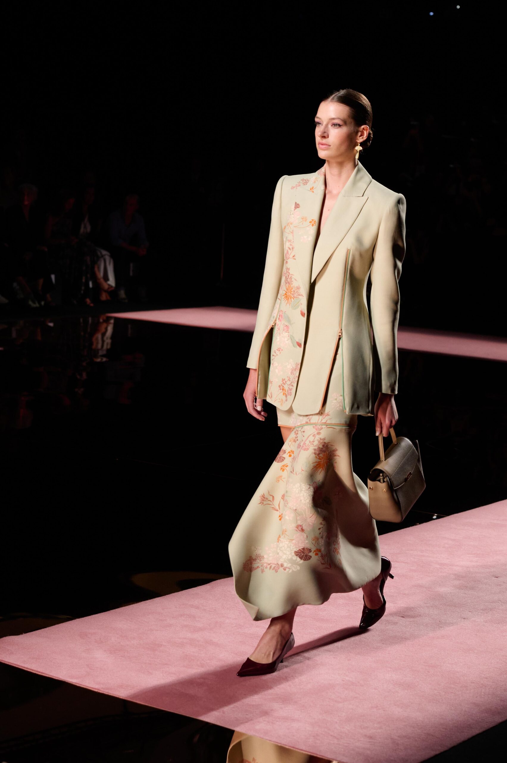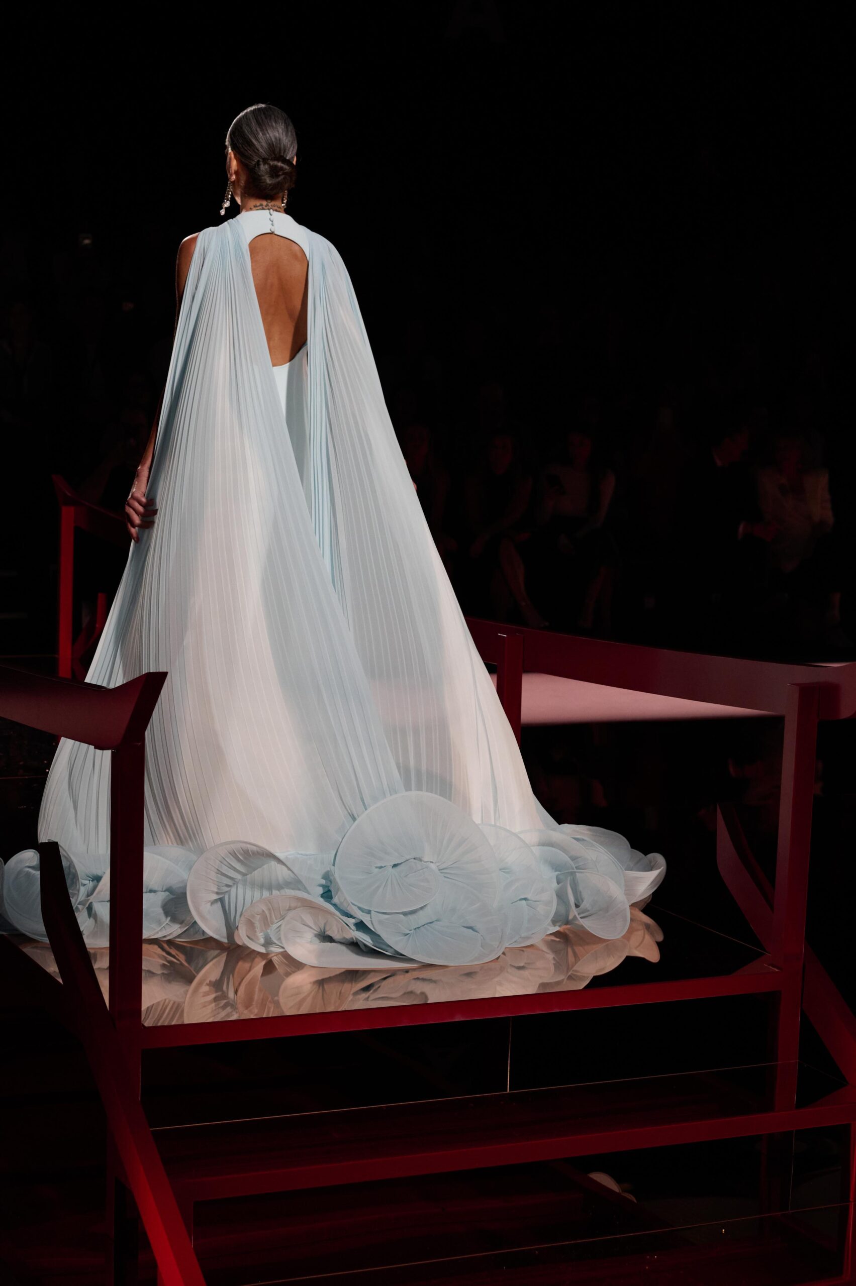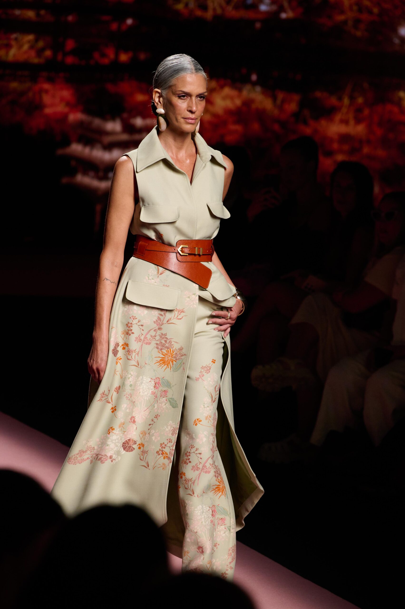 Inspired by ash trees and Japanese murals, the collection features fabrics with prints and embroideries that evoke a natural and cultural imagery, reinterpreted with contemporary sensibility. Soft greens, oranges, and pinks adorn flowing dresses and ready-to-wear pieces, where delicate, handcrafted pleats enhance movement.