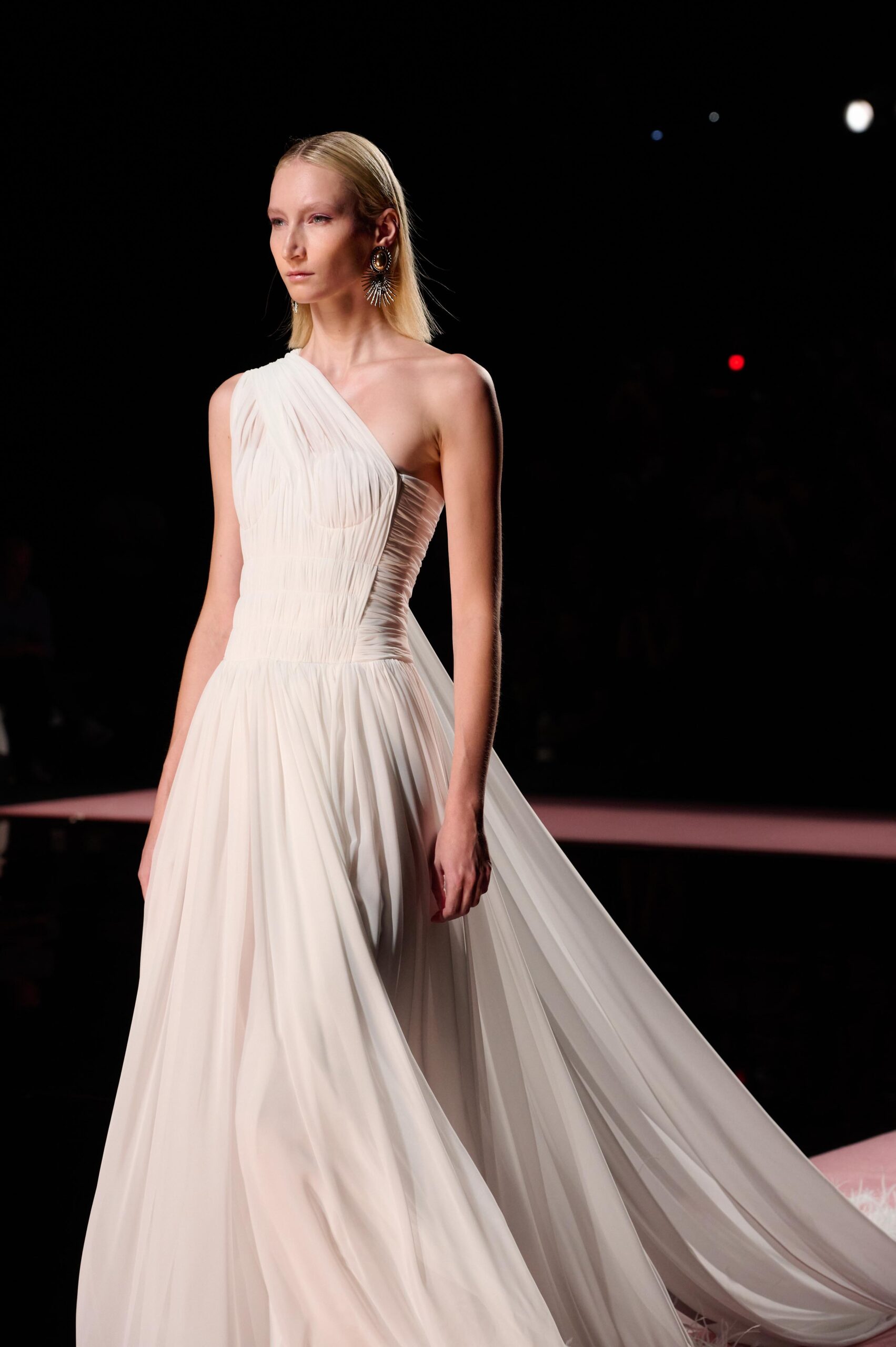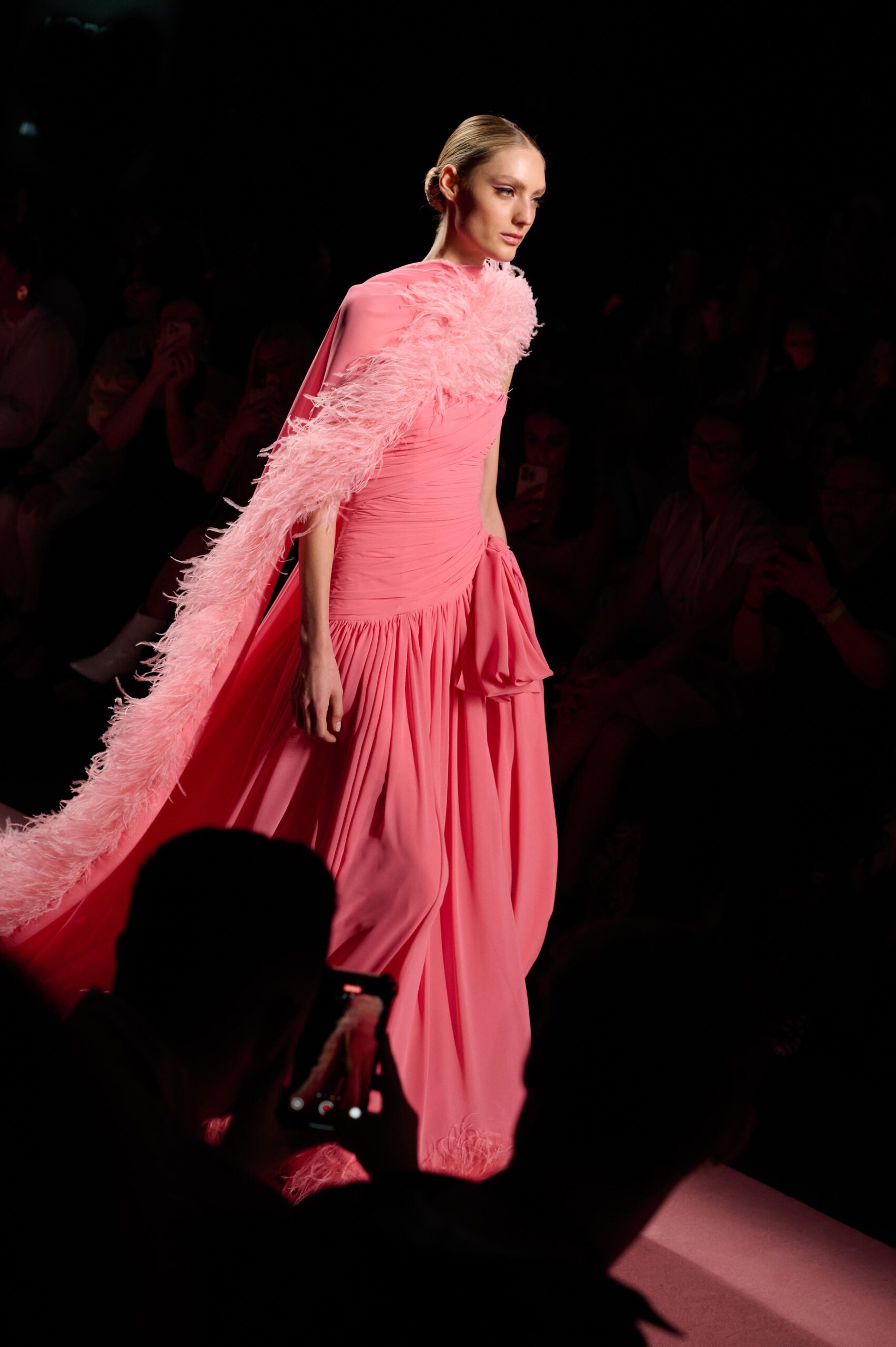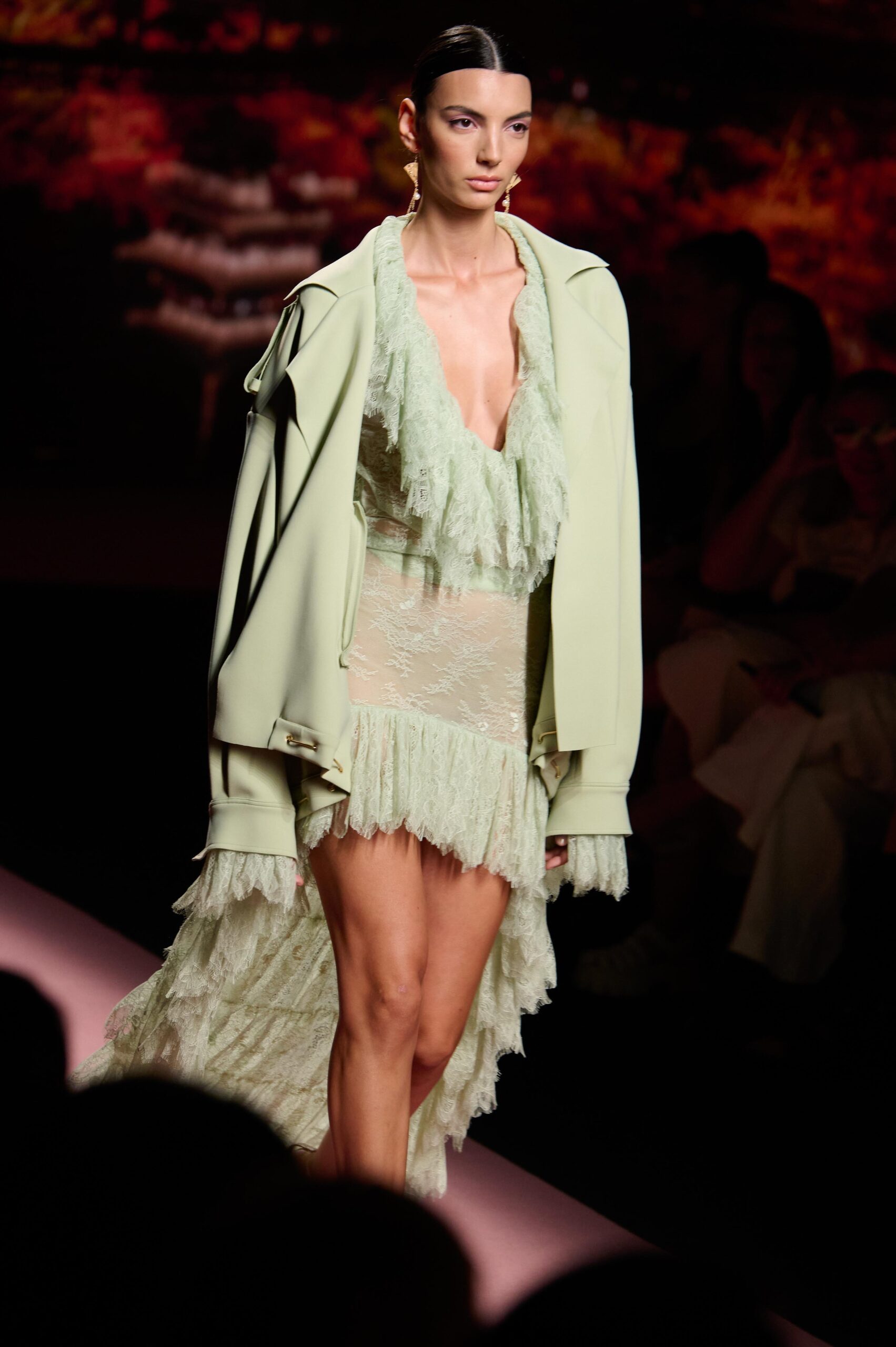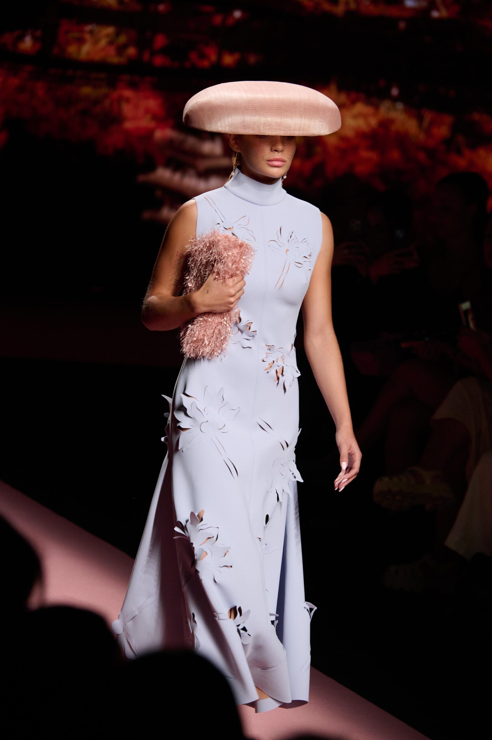 Inspired by ash trees and Japanese murals, the collection features fabrics with prints and embroideries that evoke a natural and cultural imagery, reinterpreted with contemporary sensibility. Soft greens, oranges, and pinks adorn flowing dresses and ready-to-wear pieces, where delicate, handcrafted pleats enhance movement.