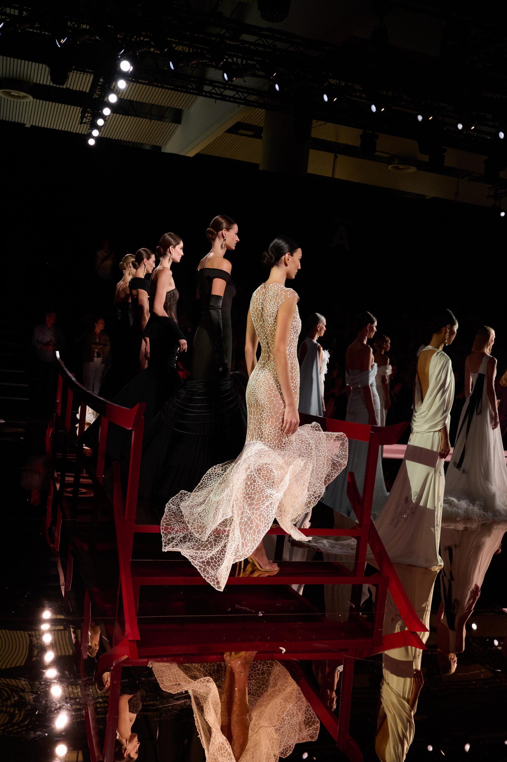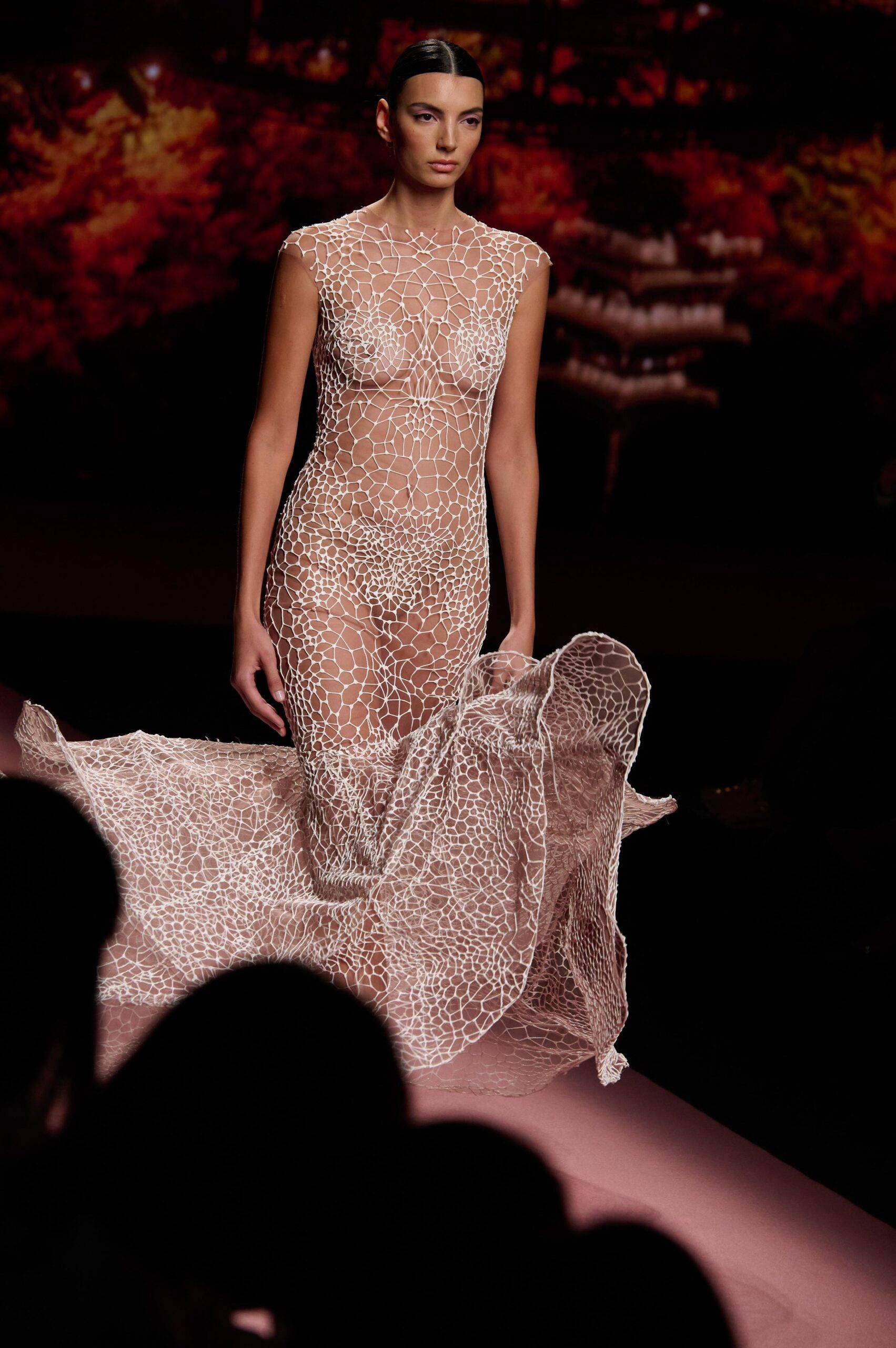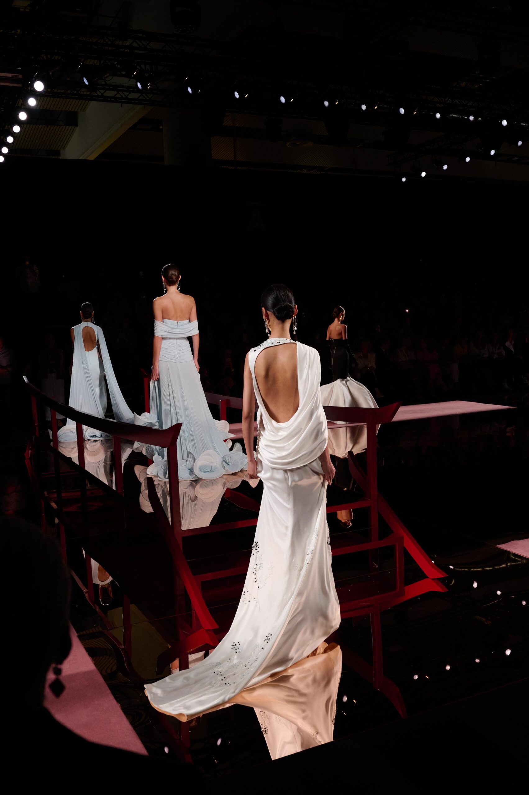 The finale, characterized by the understated elegance of black and white, reinforces the fashion brand’s identity and projects an added experimental vision. Geometric embroideries, seamless, sculpted dresses, and 3D-printed floral motifs interact with silicone garments that evoke timeless quality. The collection thus reaffirms the fruitful tension between the organic and the technological.