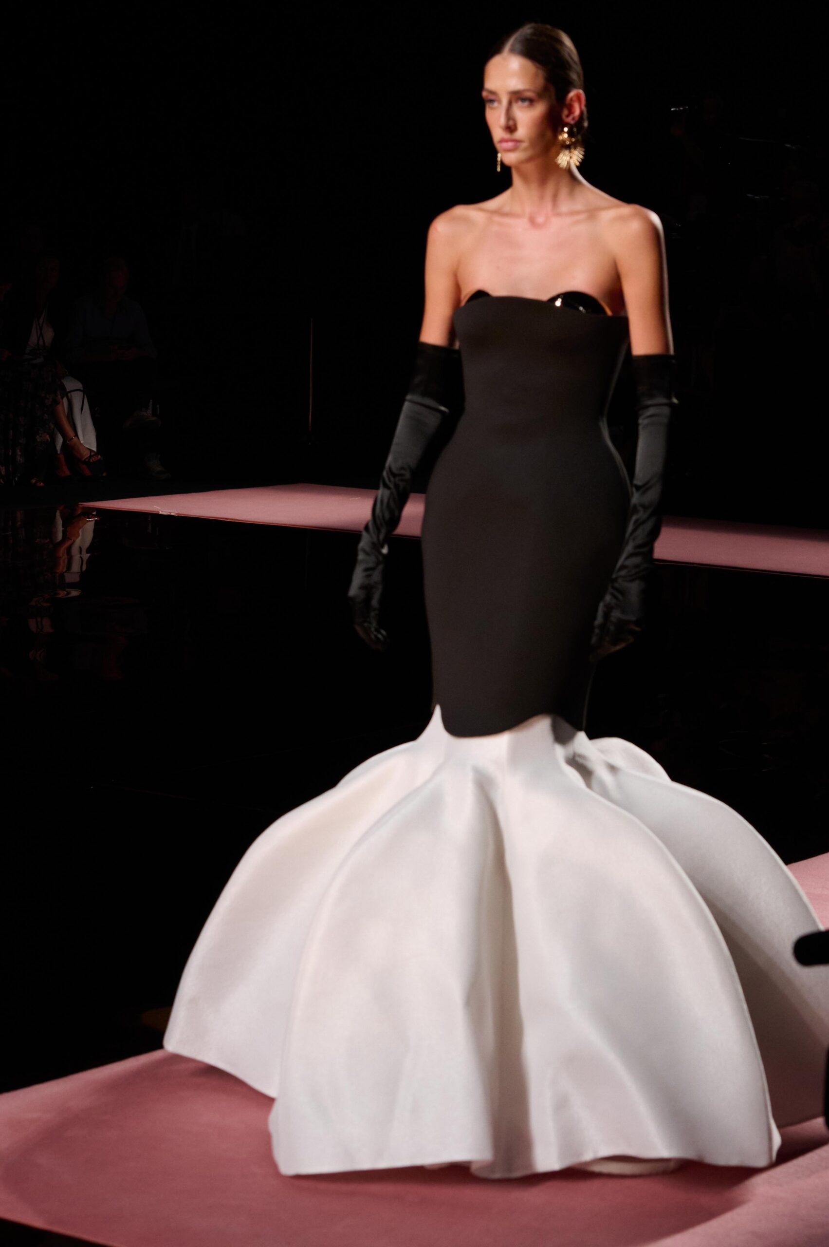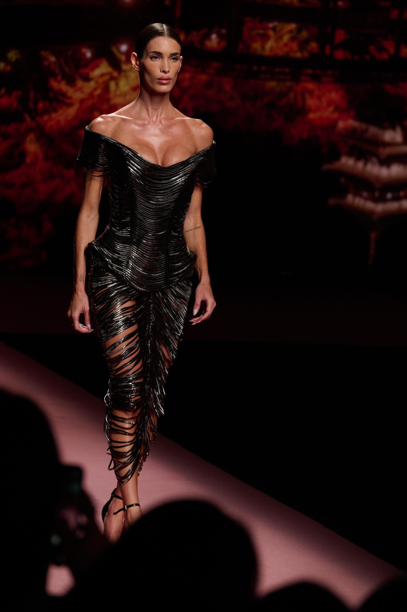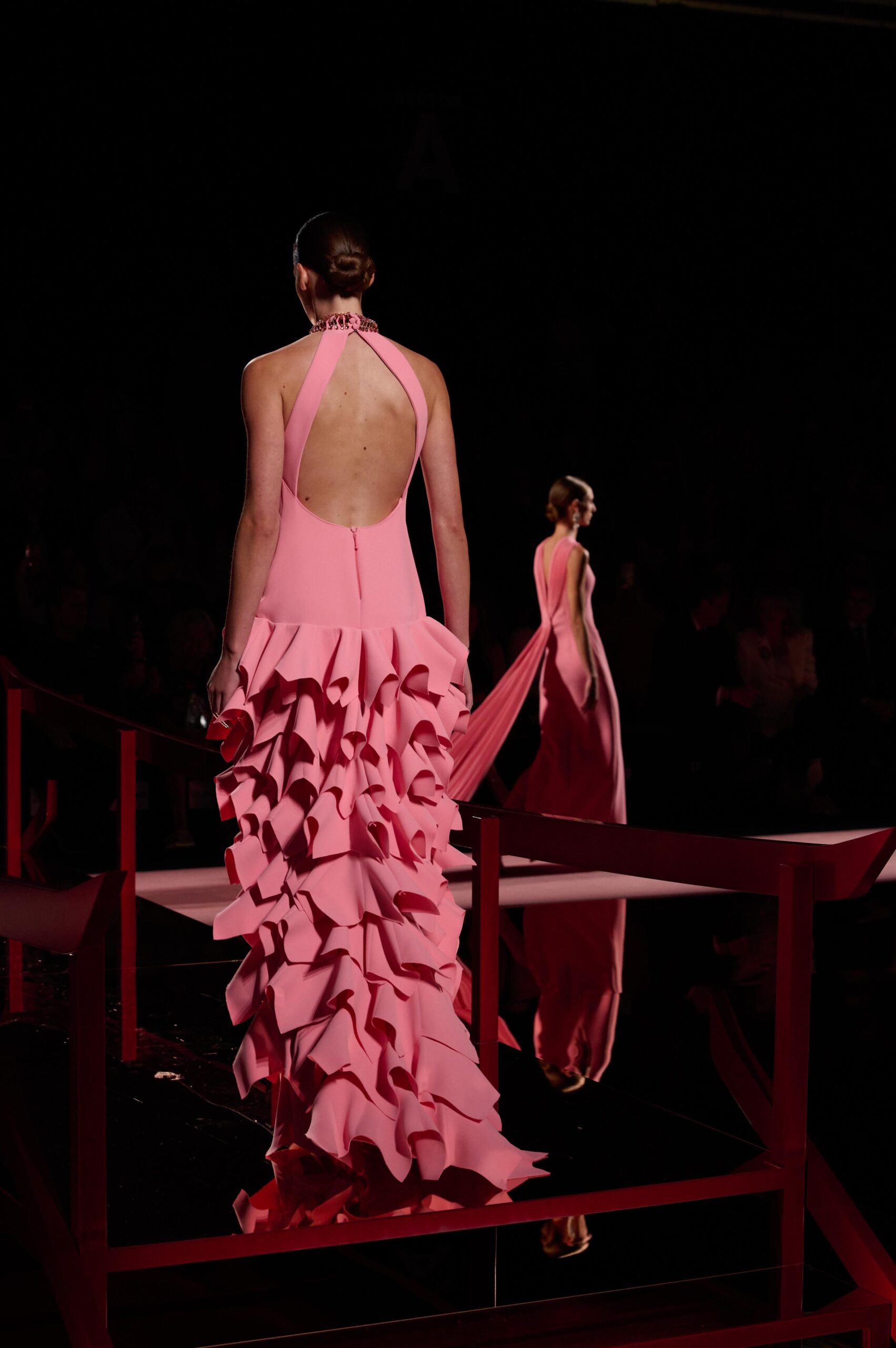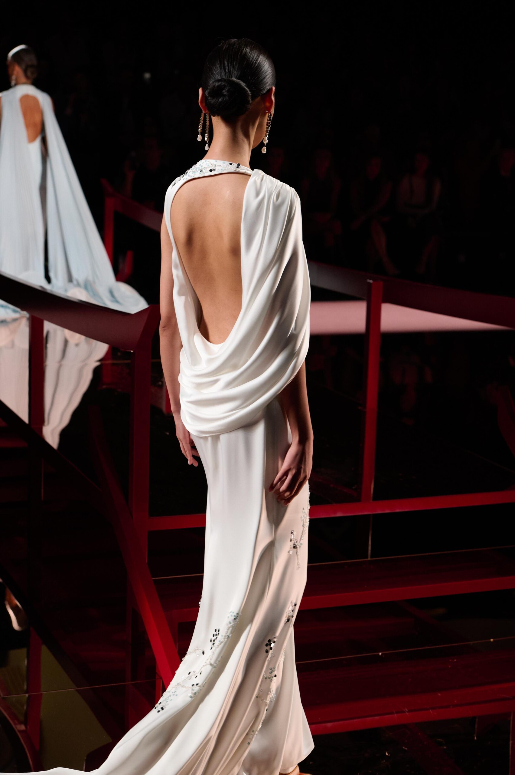 The finale, characterized by the understated elegance of black and white, reinforces the fashion brand’s identity and projects an added experimental vision. Geometric embroideries, seamless, sculpted dresses, and 3D-printed floral motifs interact with silicone garments that evoke timeless quality. The collection thus reaffirms the fruitful tension between the organic and the technological.