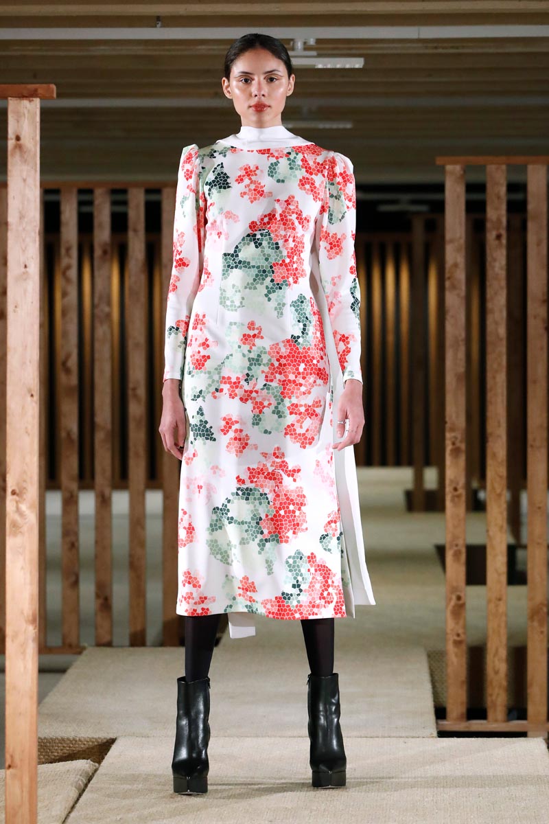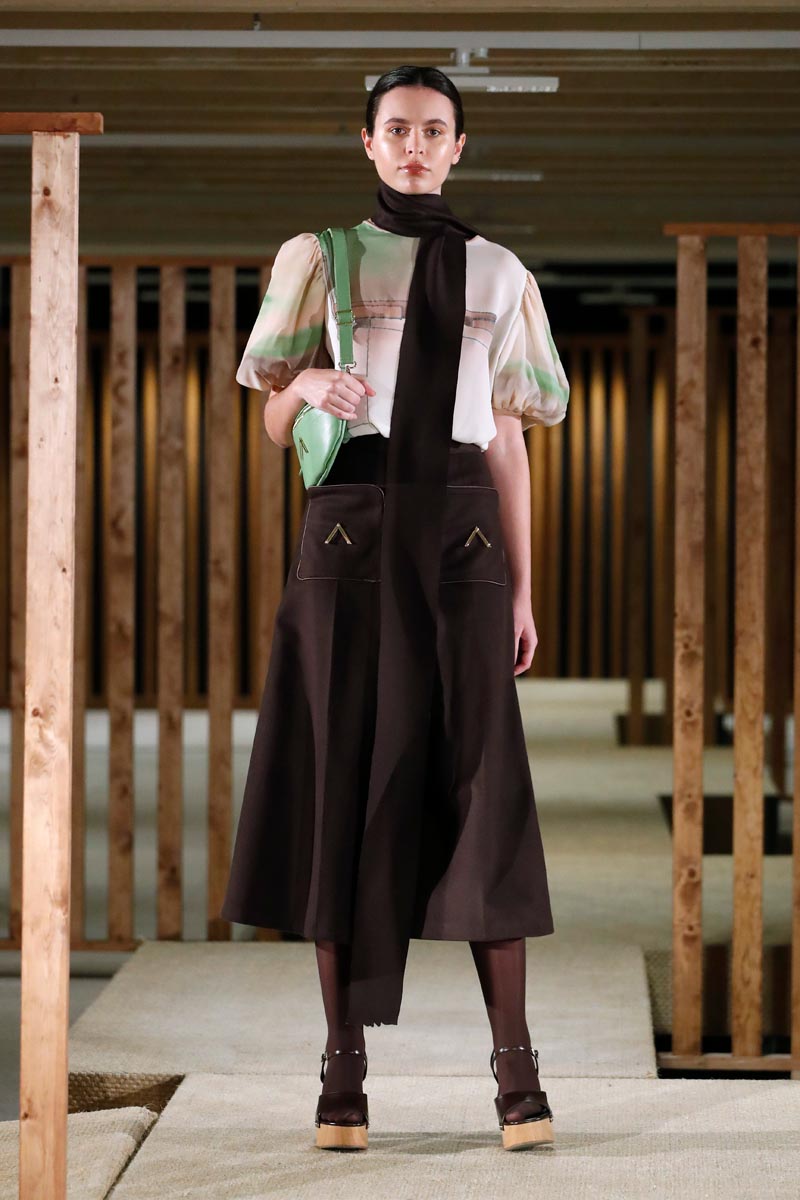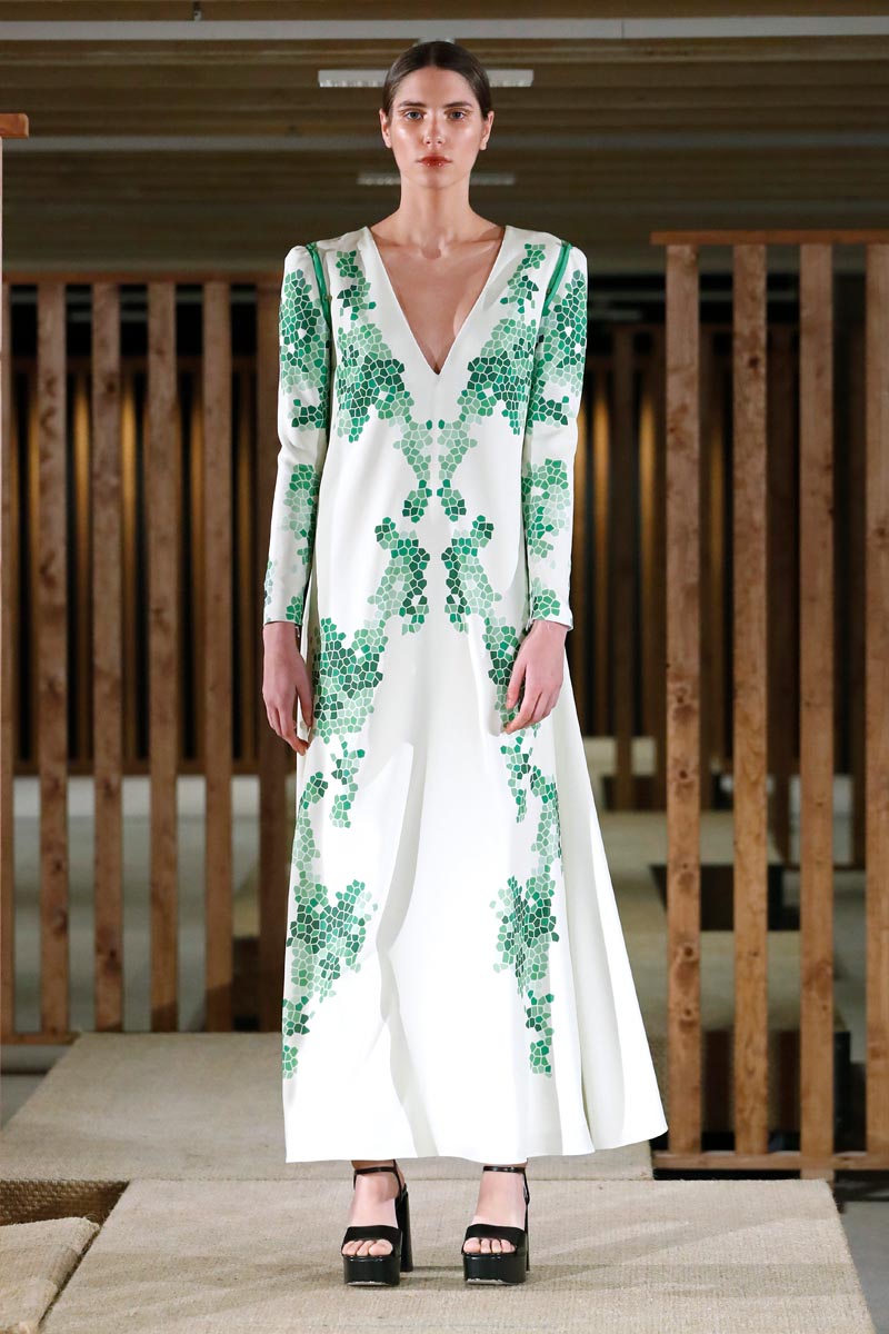 The recycled fabrics result in double-sided, canvas, crepe, washed satin, natural silk, vegan sheepskin and corduroy in a range of colours, from chocolate brown to eggshell, emerald green and pink shrimp. All this combined with intentional tributes to the traditional stripes of the Alpujarra fabrics together with digital prints that evoke the landscape of Granada, the fashion designer’s hometown.