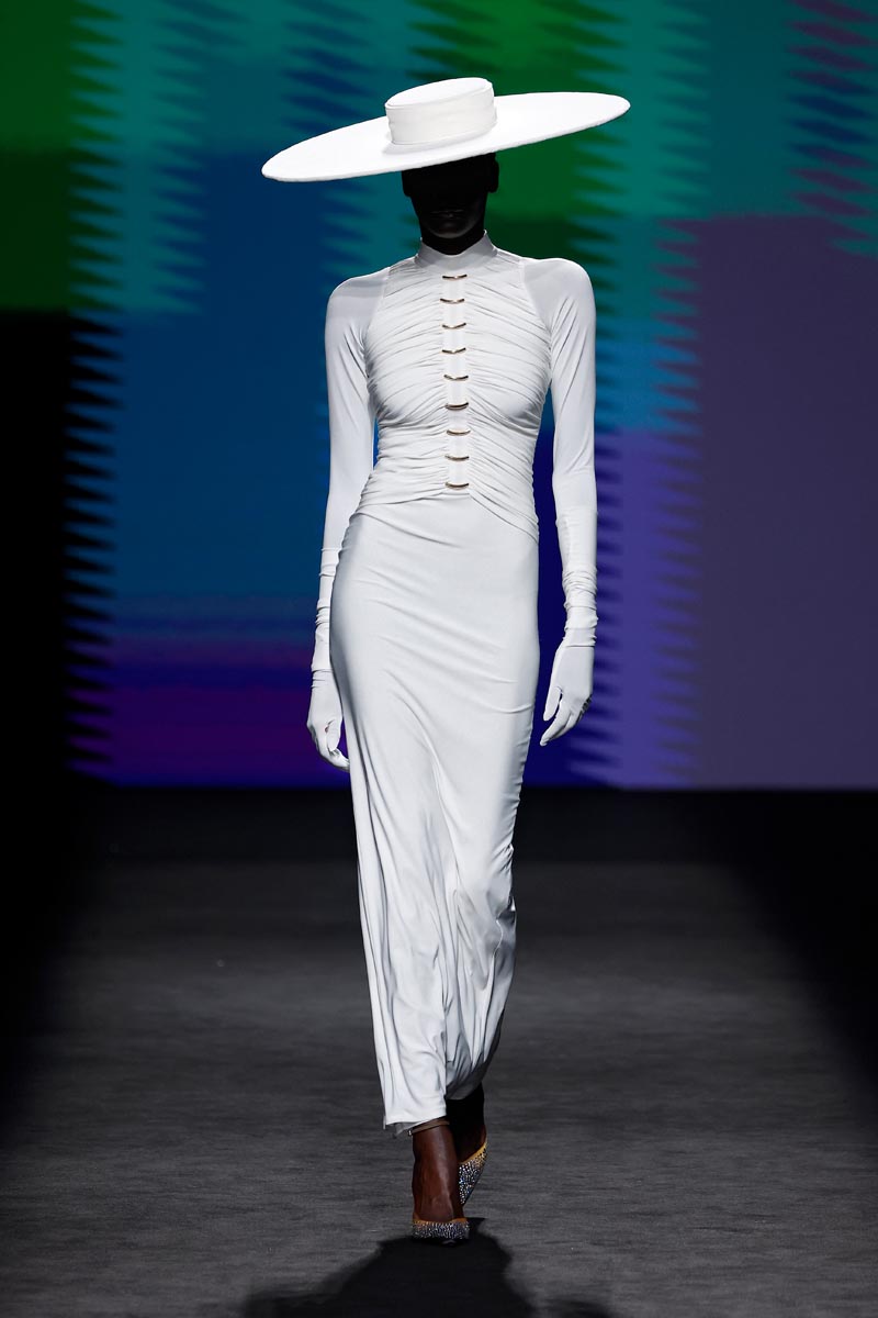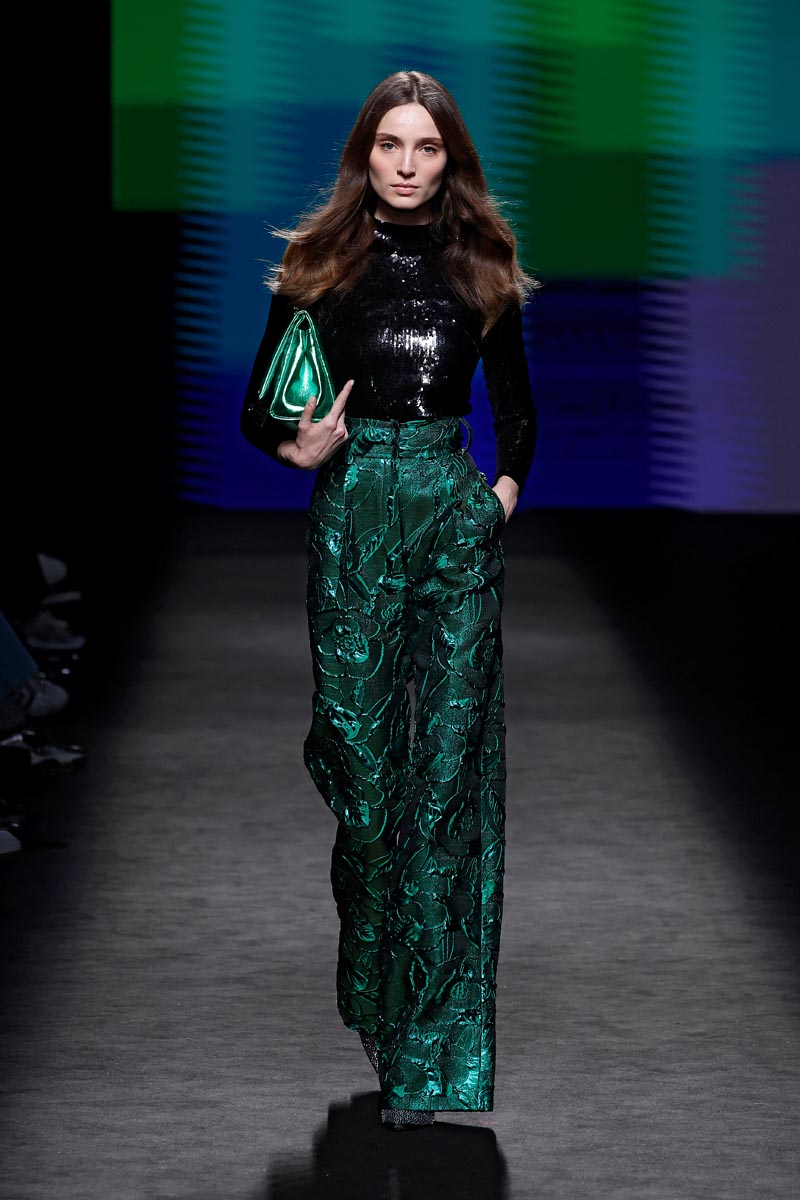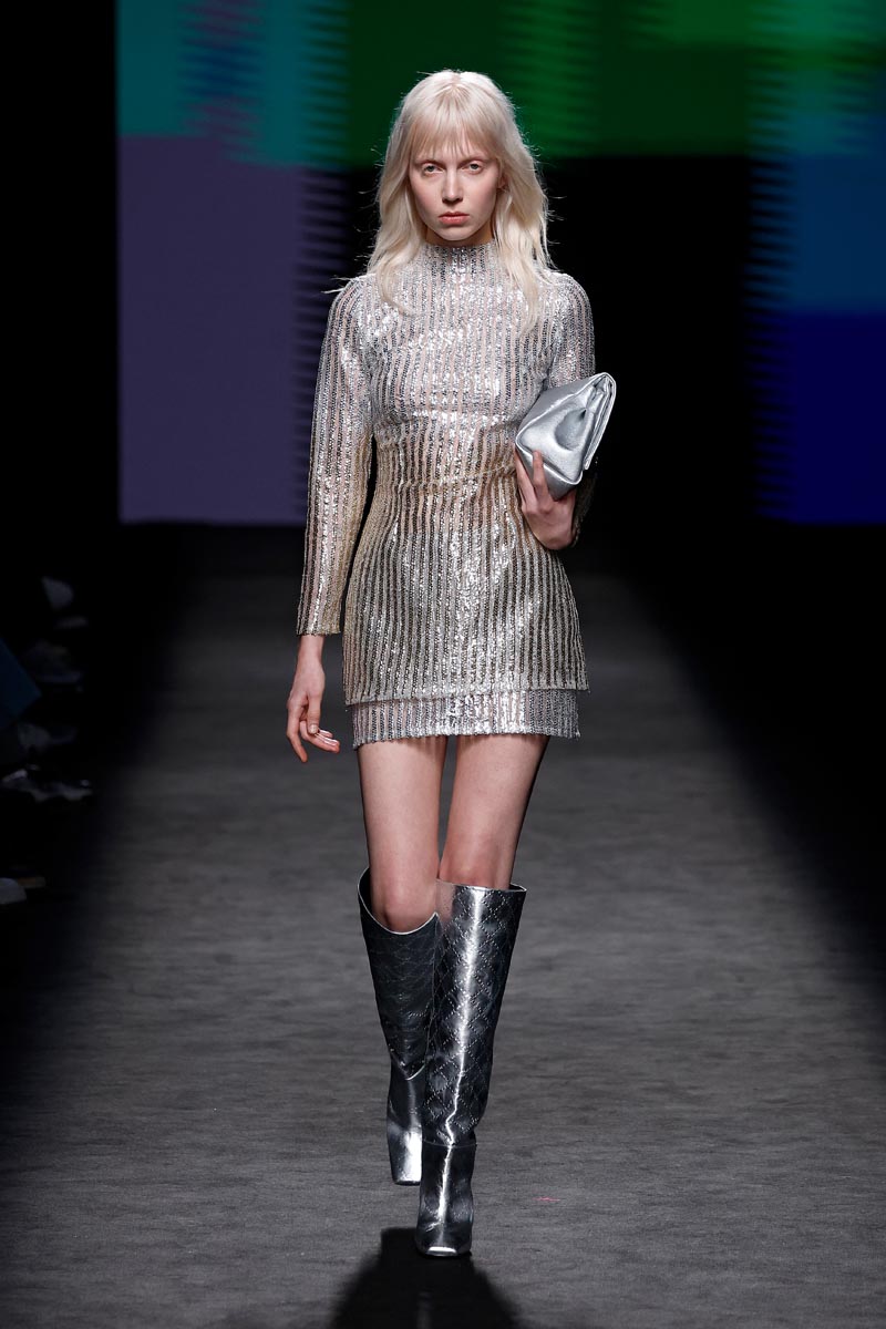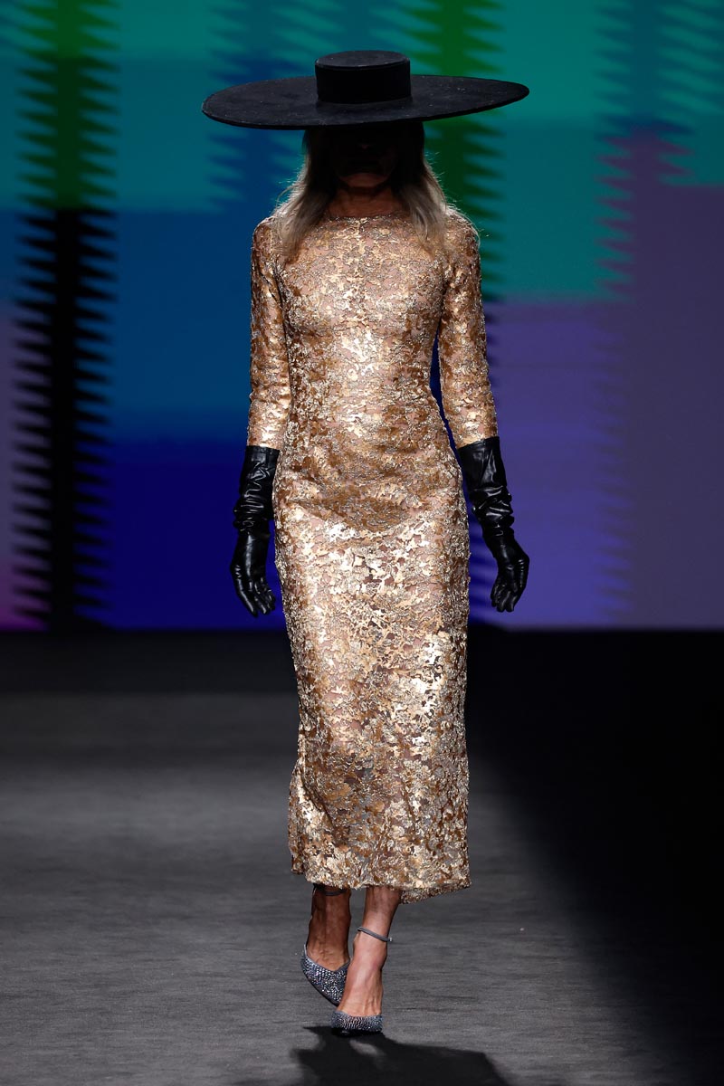 The chosen fabrics are: Mikado, brass, brocaded organza, silk knit, taffeta, synthetic leather, latex lace and printed, gradient sequins. As for shapes and silhouettes, the creative duo proposes pencil silhouette dresses, sartorial suits, oversized coats, miniskirts and 3D structures. Regarding accessories: velvet maxi hats, brass jewellery, ankle bracelet shoes, boots and XL metallic gloves.