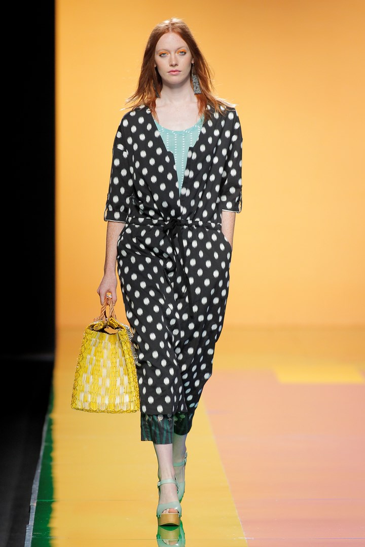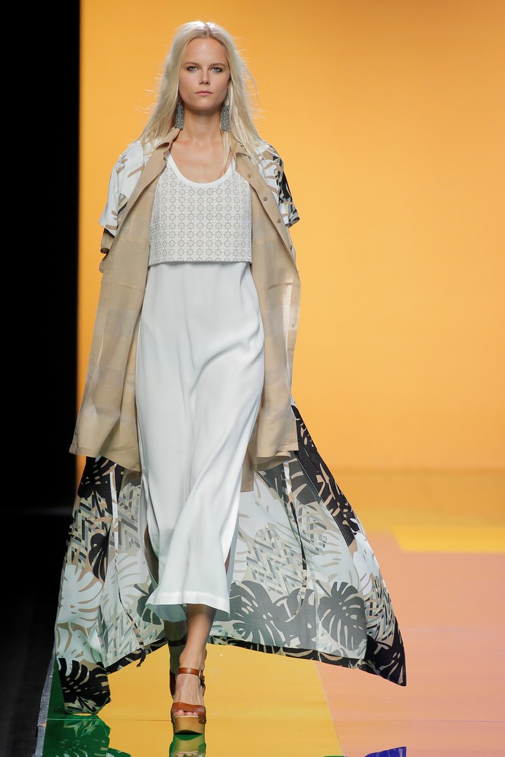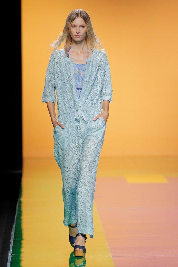 Devota & Lomba takes as the origin of his inspiration the East, the architecture and the geometry. The Japanese tradition of origami, a constant of the creative universe of the label directed by Modesto Lomba, emerges as the great protagonist of the garments for next spring-summer 2016. Earth tones and off-white are the basis of the collection, which fills up with straight lines dyed in red and blue alternating with daring doses of fluor colours in garments of complex patterns.