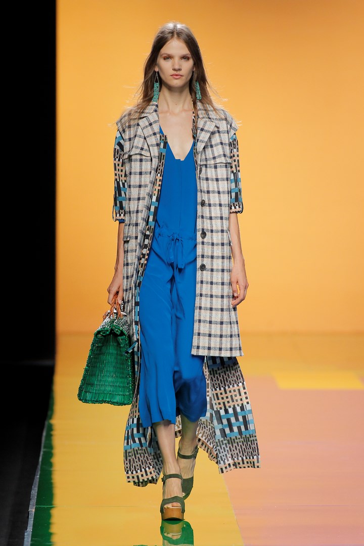 The Ailanto label kicks off from the Hall 14 of IFEMA in the 62nd edition of Mercedes-Benz Fashion Week. Their collection, inspired by the paintings of British artist David Hockney, takes us to California in the 70s through surfer style looks, caftans and folk strokes. The prints, a hallmark of the Muñoz brothers, are composed of three coloured lines, small fishes and leaves are stamped in fresh fabrics such as silk and linen. Highlighted are the accessories with large hand bags made of artisan braided wicker and sculptural enamel jewels.