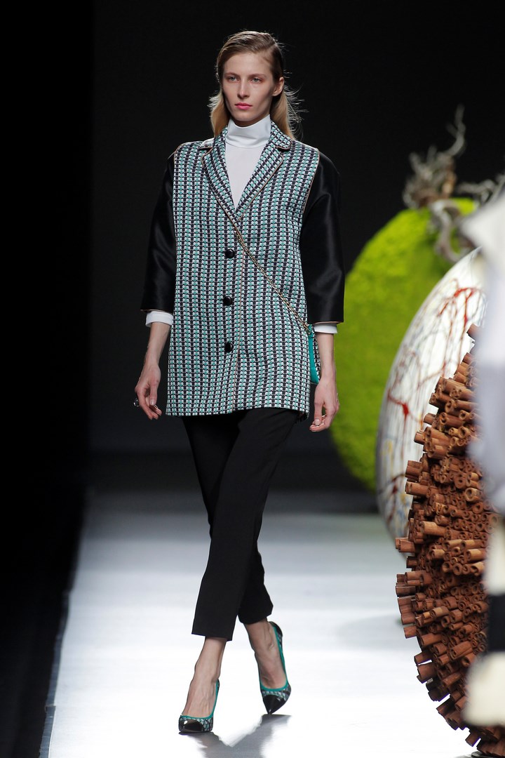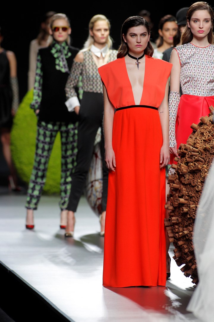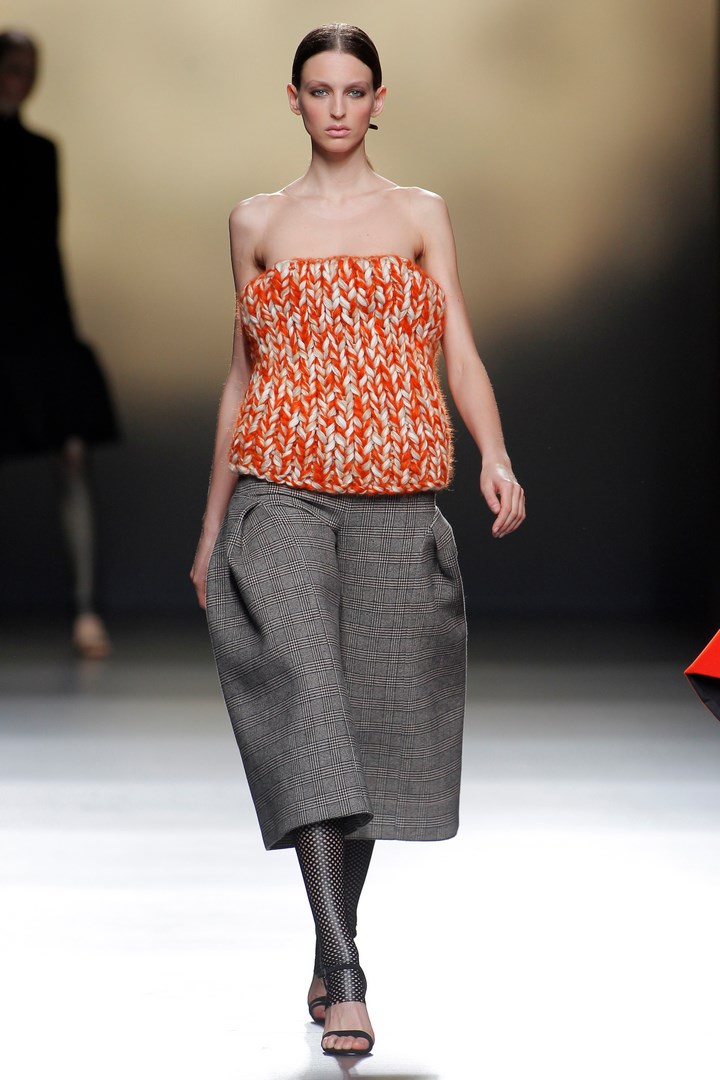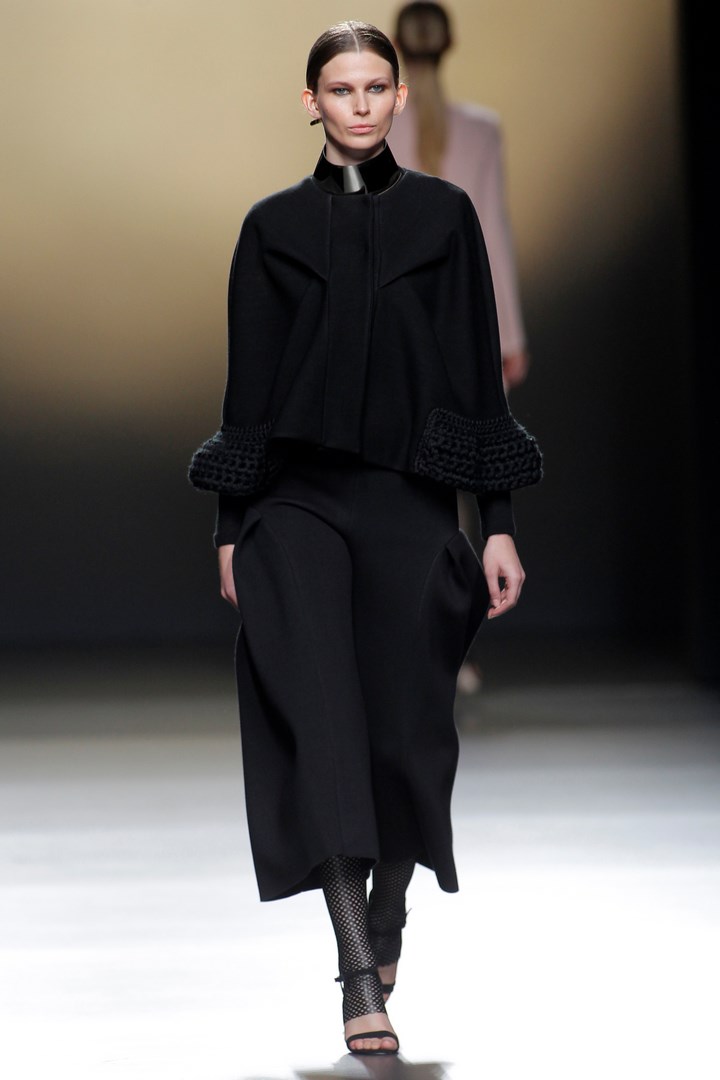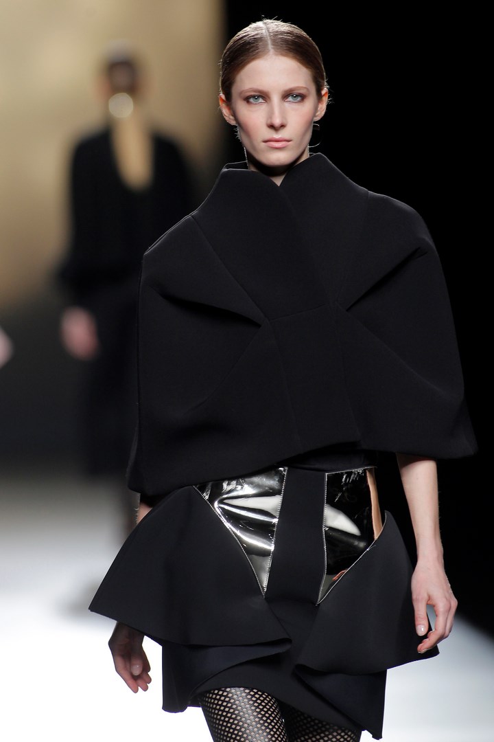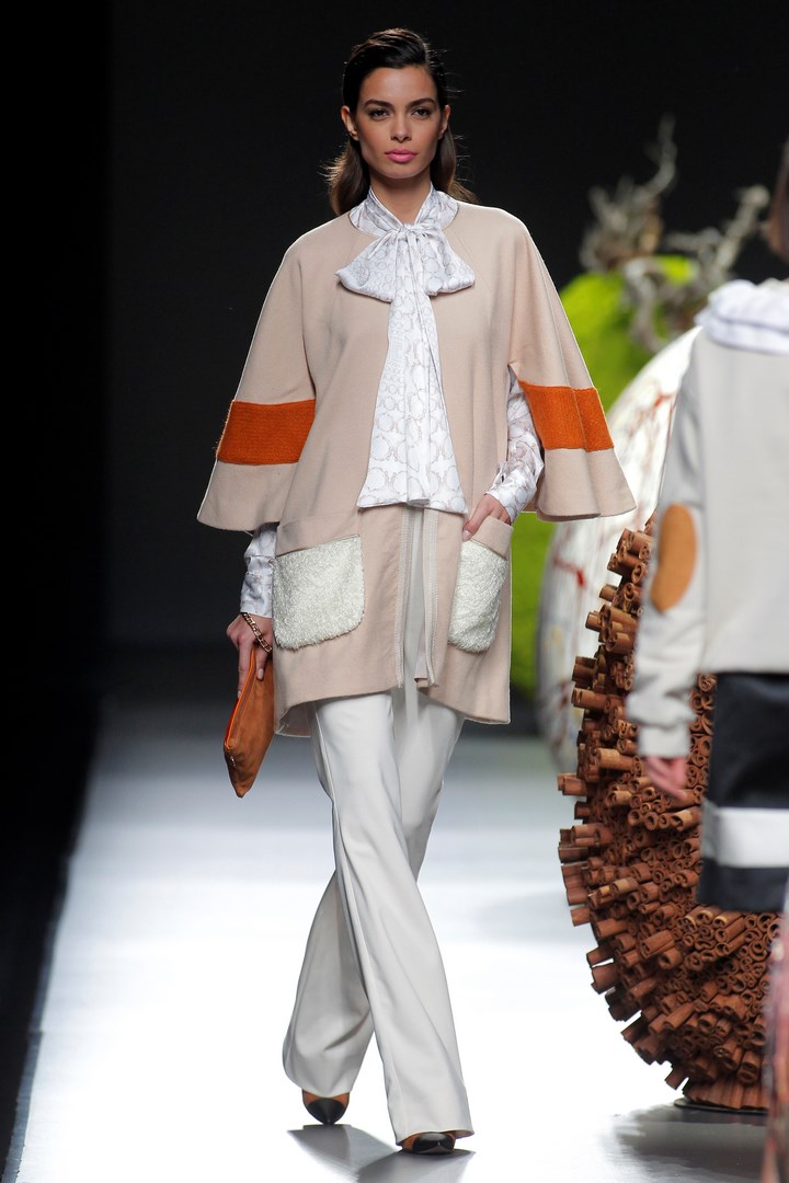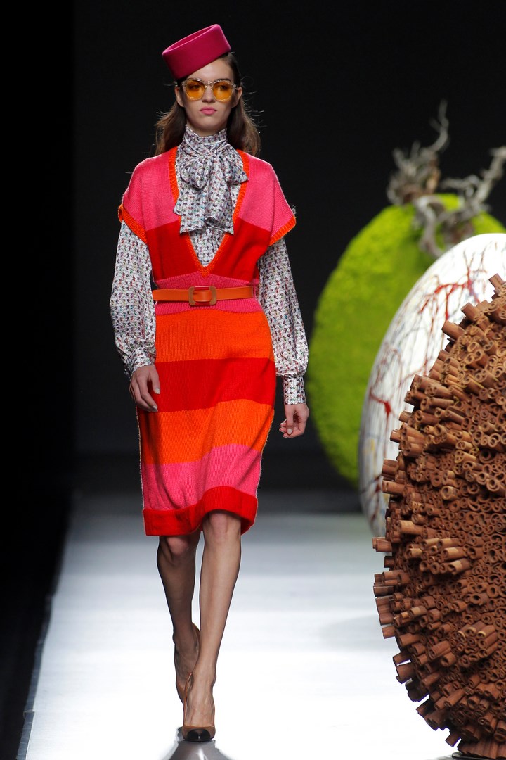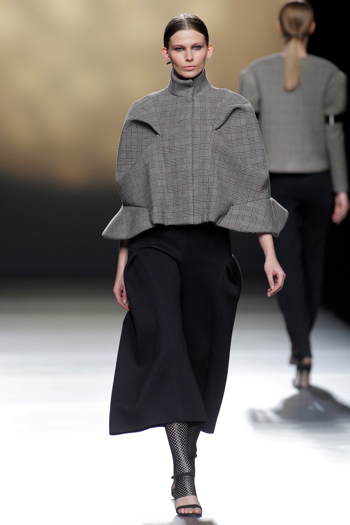 With her collection for next winter Amaya Arzuaga reveals her fascination with outer space. Her proposal explores the planetary gravitation by surrounding shapes and suspended volumes. Black is the basis of her creations tinted in orange, dusty pink, raw and petrol green. The designer from Burgos showcases once again with this collection her star fabrics, showing majestic pieces in thick hand made knit, foam wool and cloth with Prince of Wales plaid.