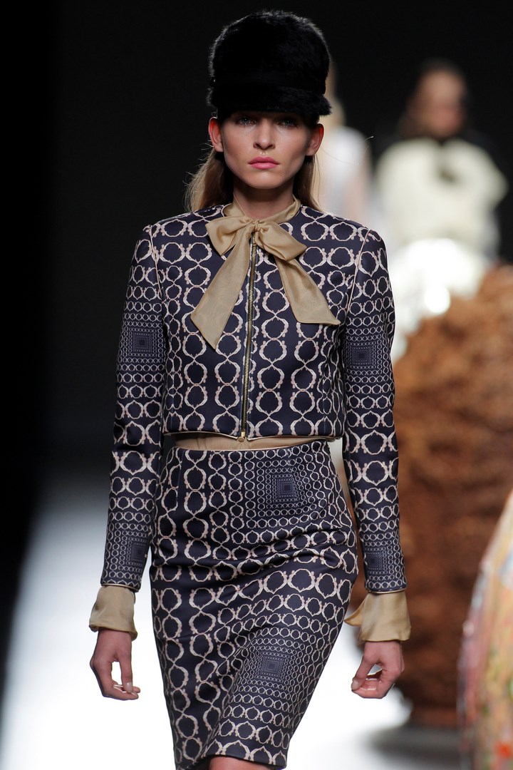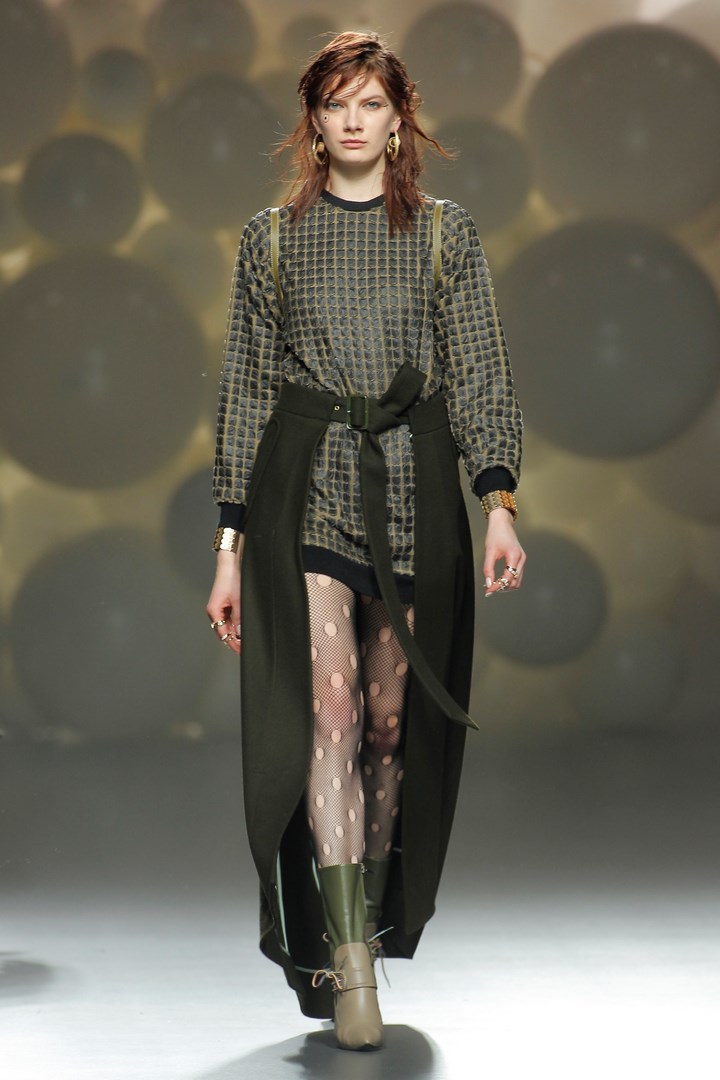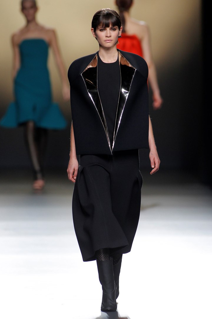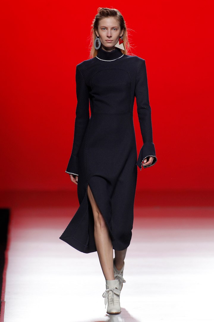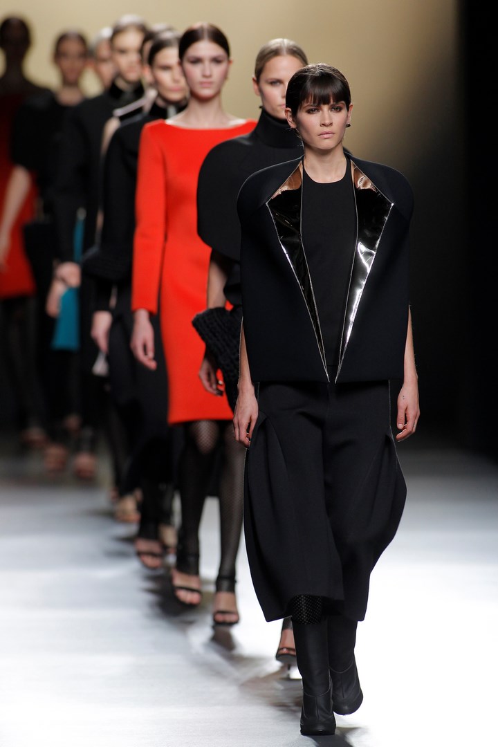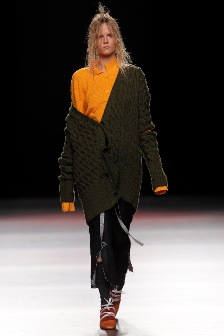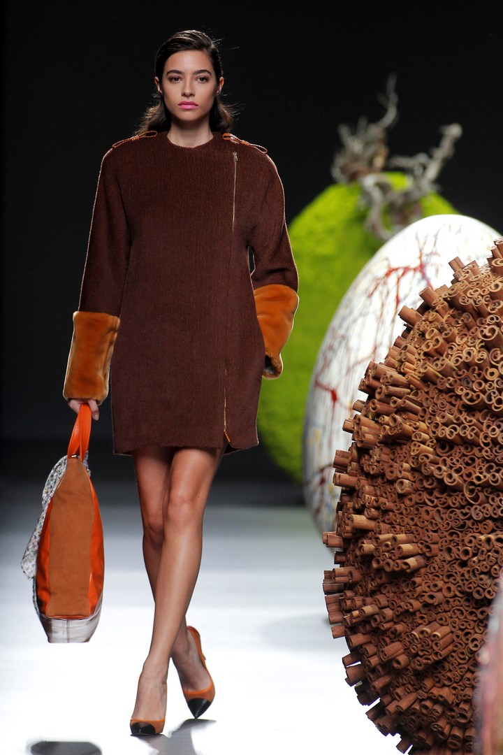 With her collection for next winter Amaya Arzuaga reveals her fascination with outer space. Her proposal explores the planetary gravitation by surrounding shapes and suspended volumes. Black is the basis of her creations tinted in orange, dusty pink, raw and petrol green. The designer from Burgos showcases once again with this collection her star fabrics, showing majestic pieces in thick hand made knit, foam wool and cloth with Prince of Wales plaid.