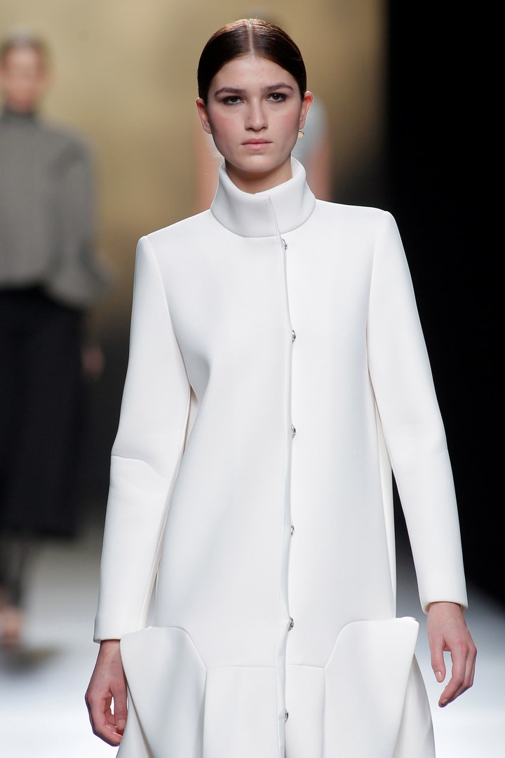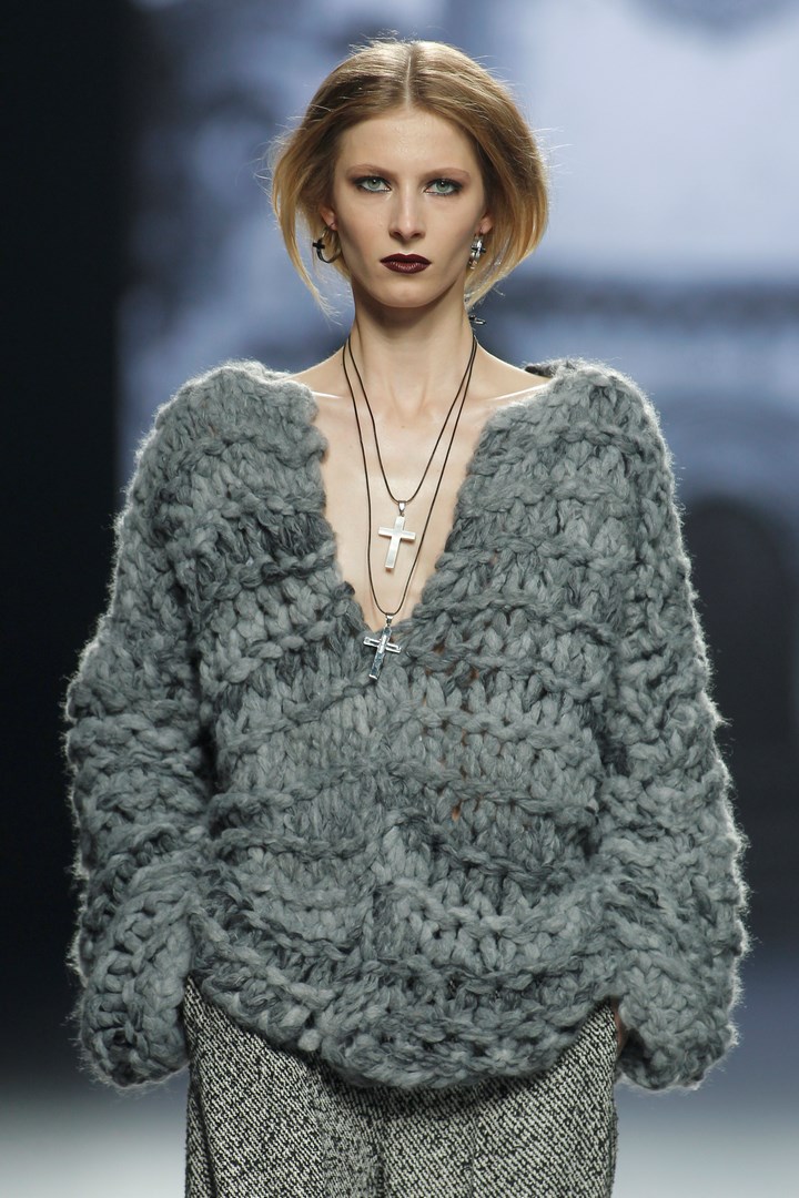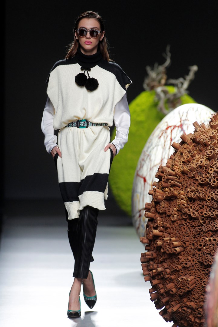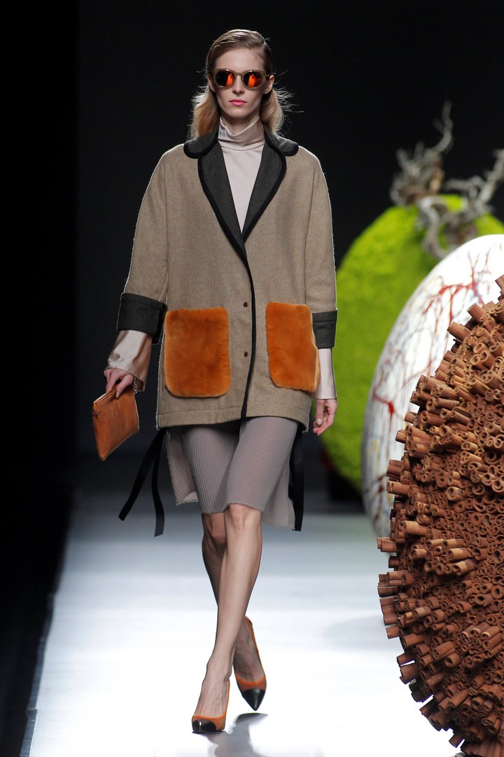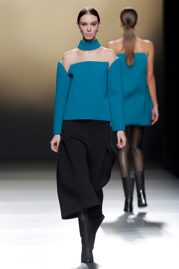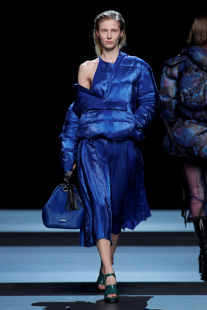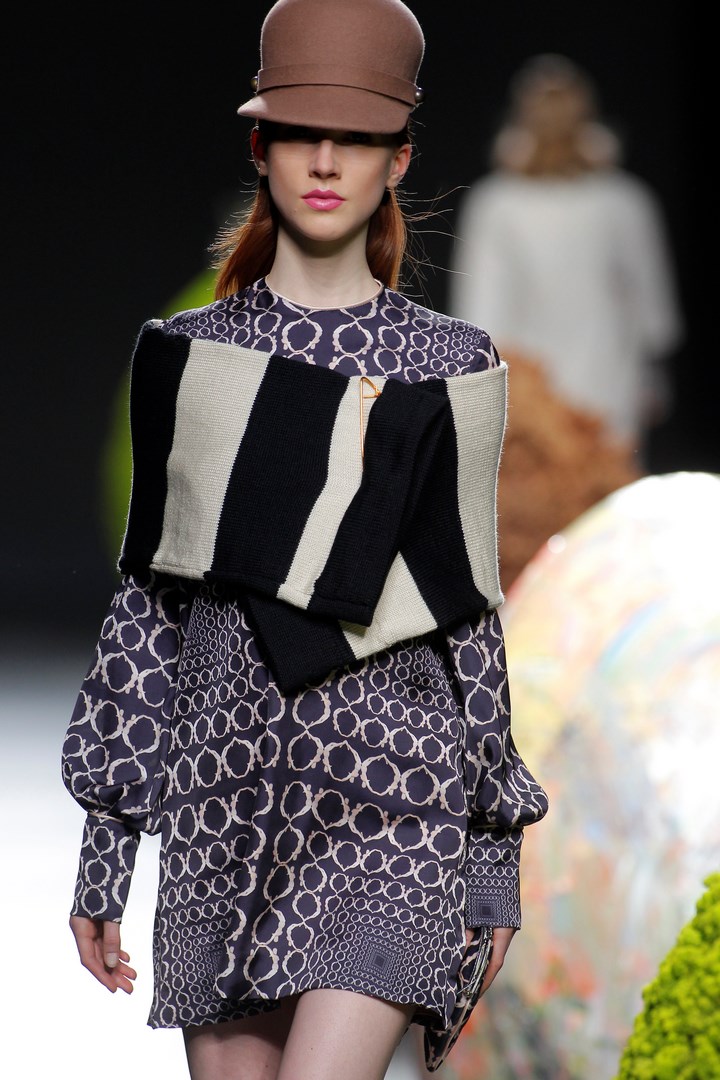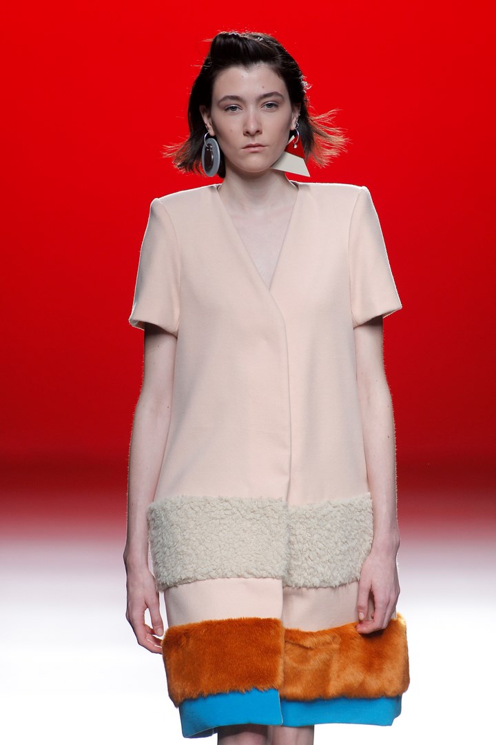 With her collection for next winter Amaya Arzuaga reveals her fascination with outer space. Her proposal explores the planetary gravitation by surrounding shapes and suspended volumes. Black is the basis of her creations tinted in orange, dusty pink, raw and petrol green. The designer from Burgos showcases once again with this collection her star fabrics, showing majestic pieces in thick hand made knit, foam wool and cloth with Prince of Wales plaid.
