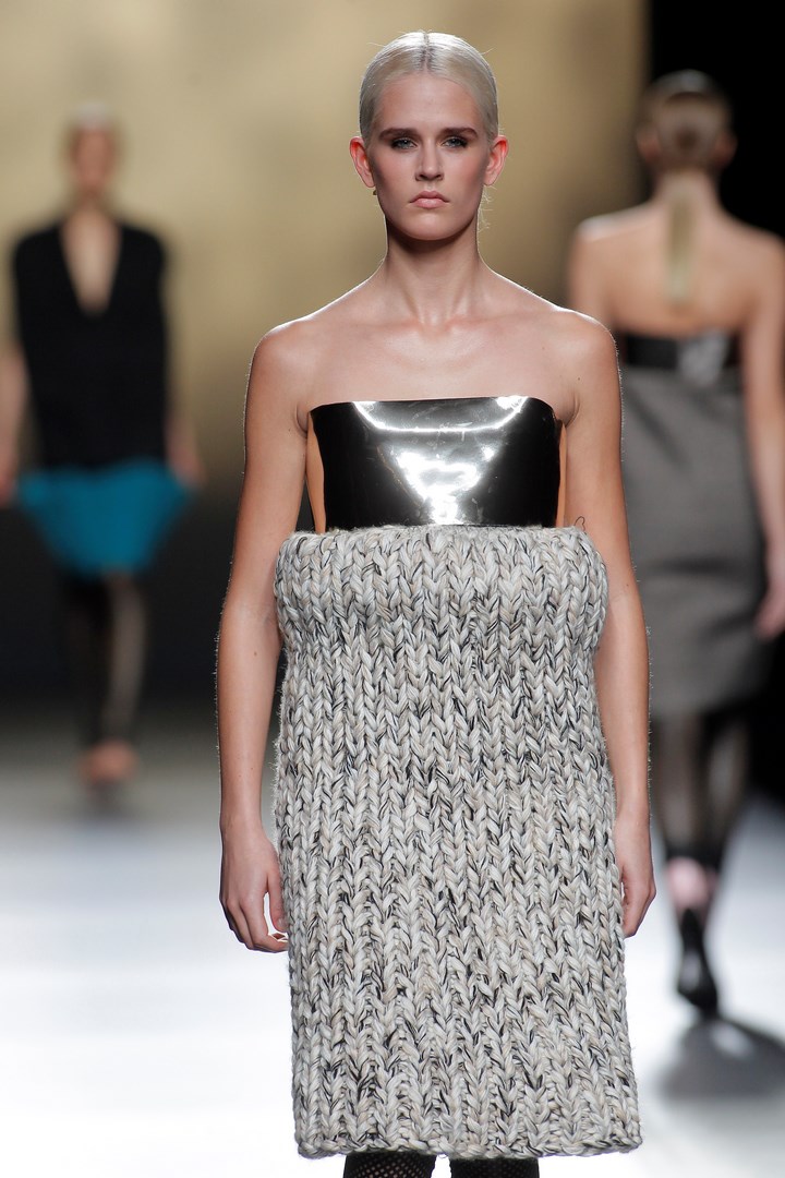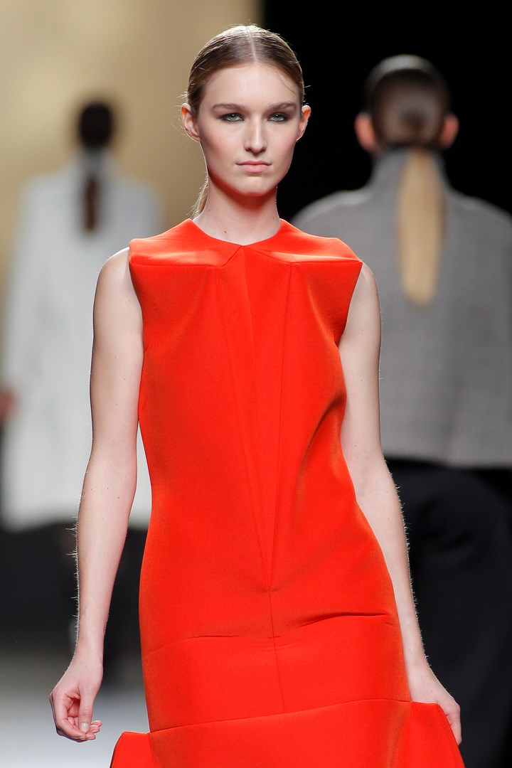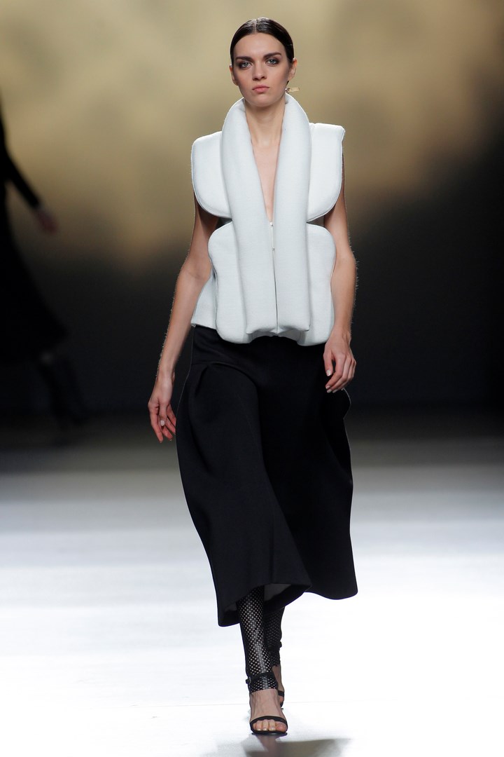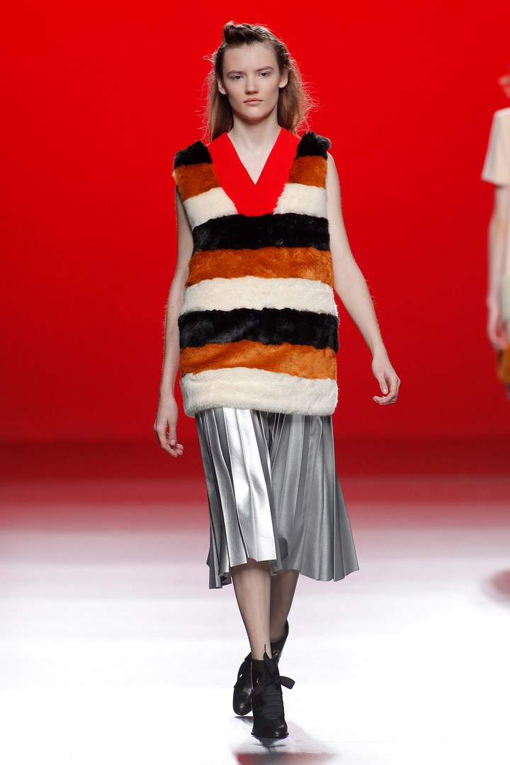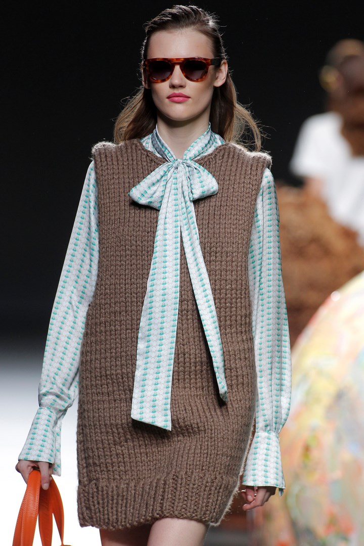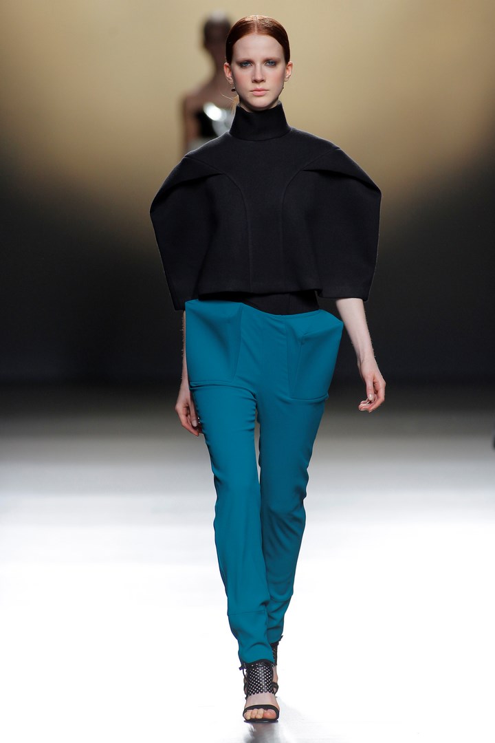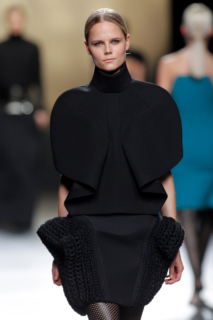 With her collection for next winter Amaya Arzuaga reveals her fascination with outer space. Her proposal explores the planetary gravitation by surrounding shapes and suspended volumes. Black is the basis of her creations tinted in orange, dusty pink, raw and petrol green. The designer from Burgos showcases once again with this collection her star fabrics, showing majestic pieces in thick hand made knit, foam wool and cloth with Prince of Wales plaid.