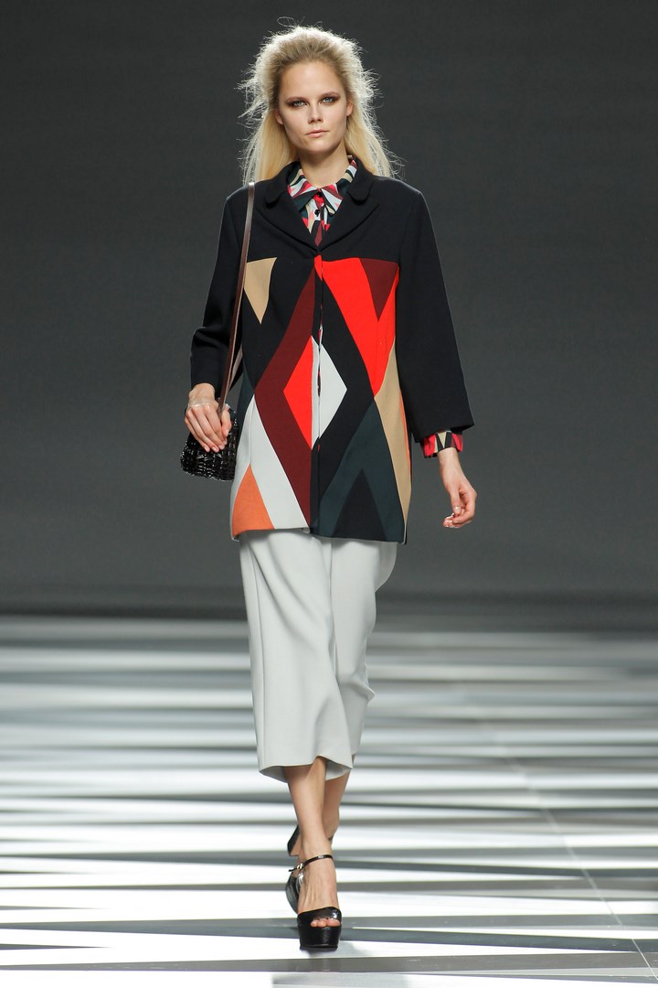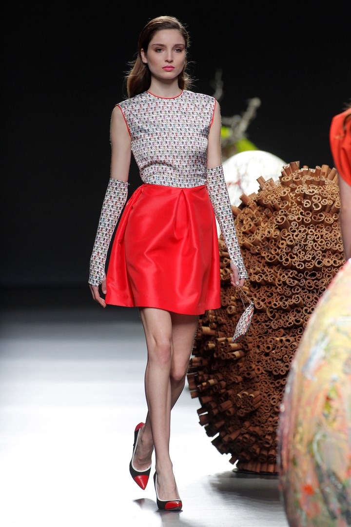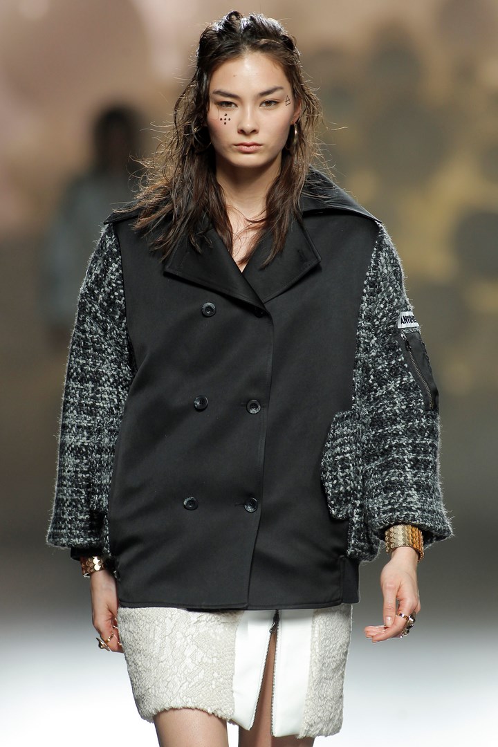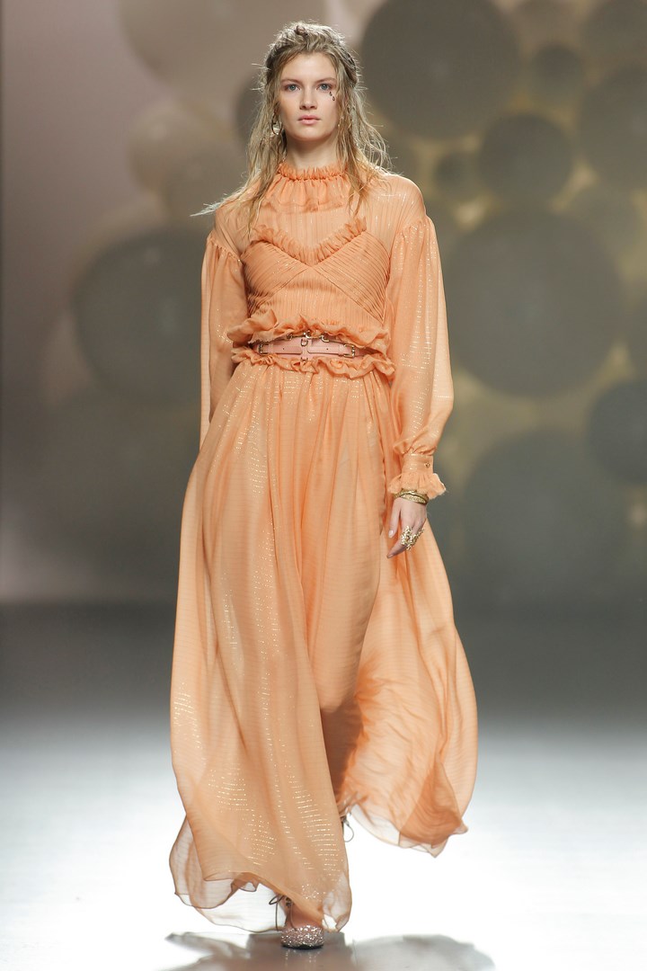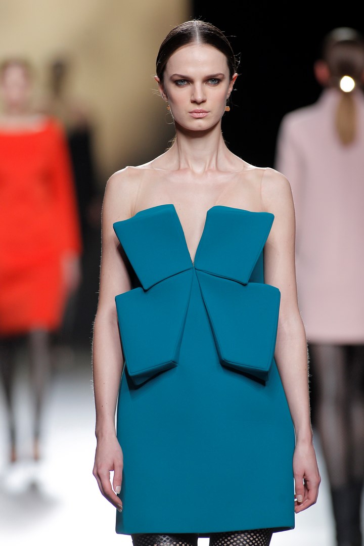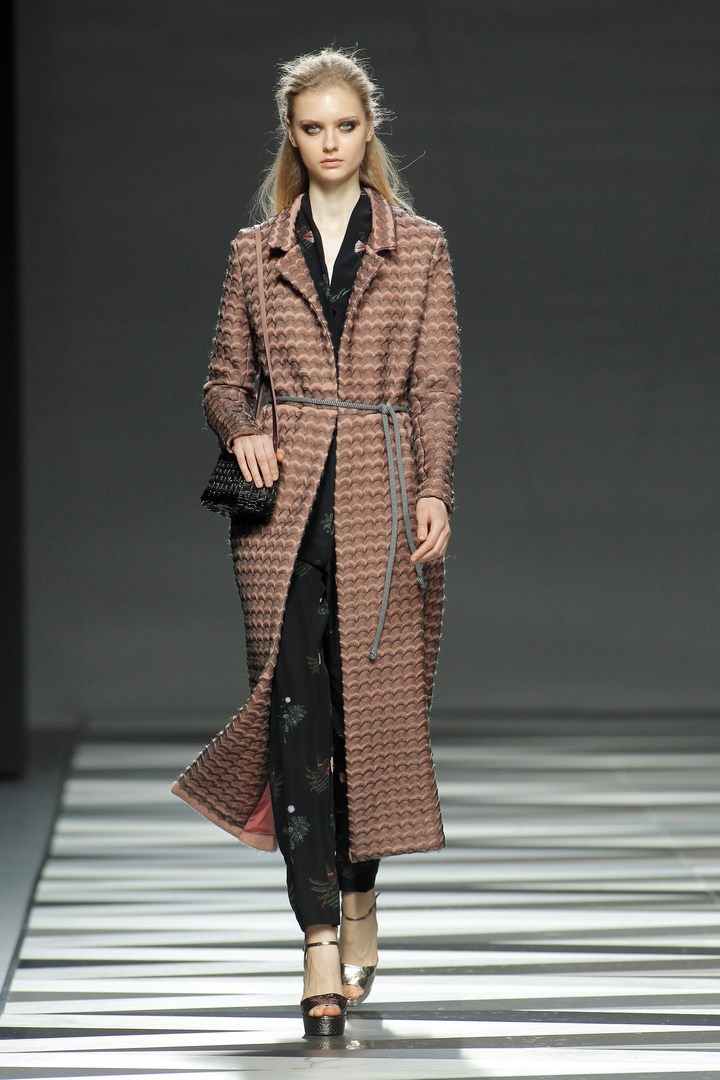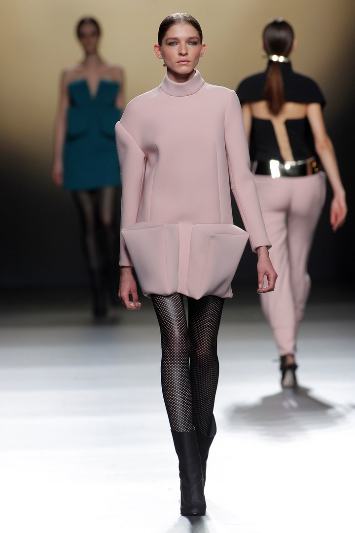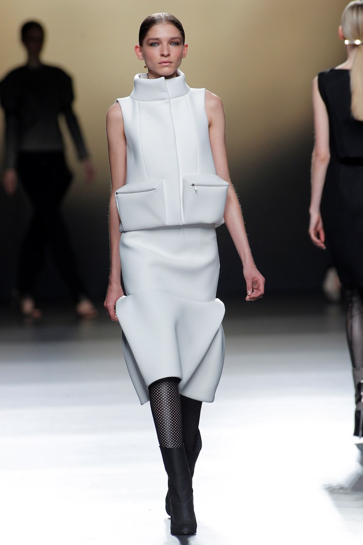 With her collection for next winter Amaya Arzuaga reveals her fascination with outer space. Her proposal explores the planetary gravitation by surrounding shapes and suspended volumes. Black is the basis of her creations tinted in orange, dusty pink, raw and petrol green. The designer from Burgos showcases once again with this collection her star fabrics, showing majestic pieces in thick hand made knit, foam wool and cloth with Prince of Wales plaid.