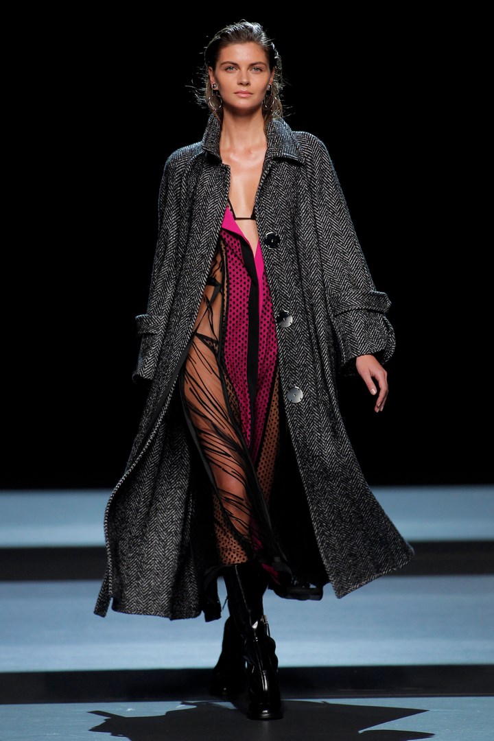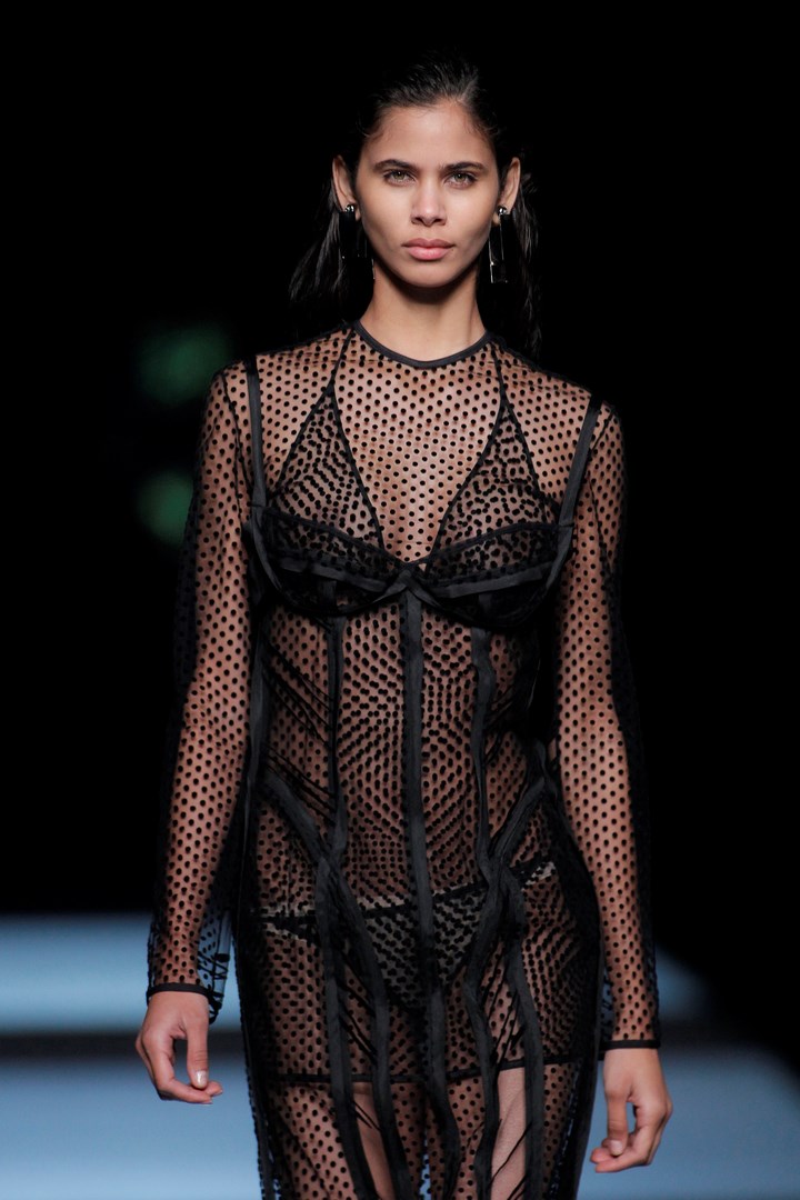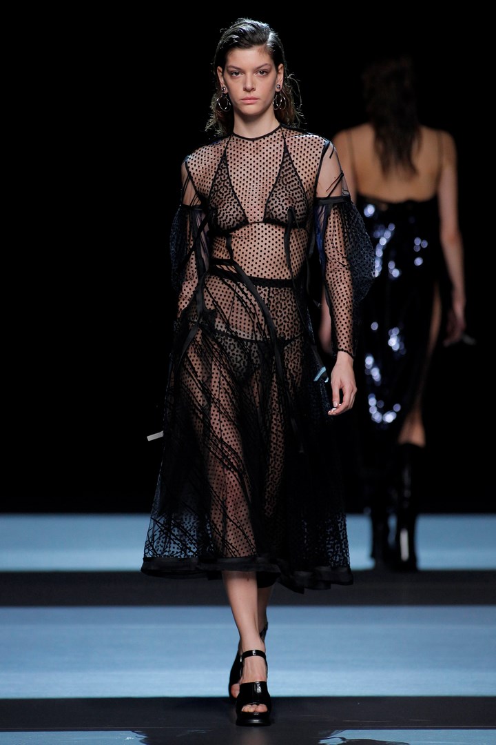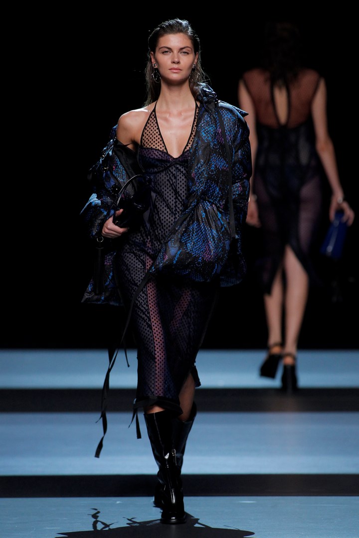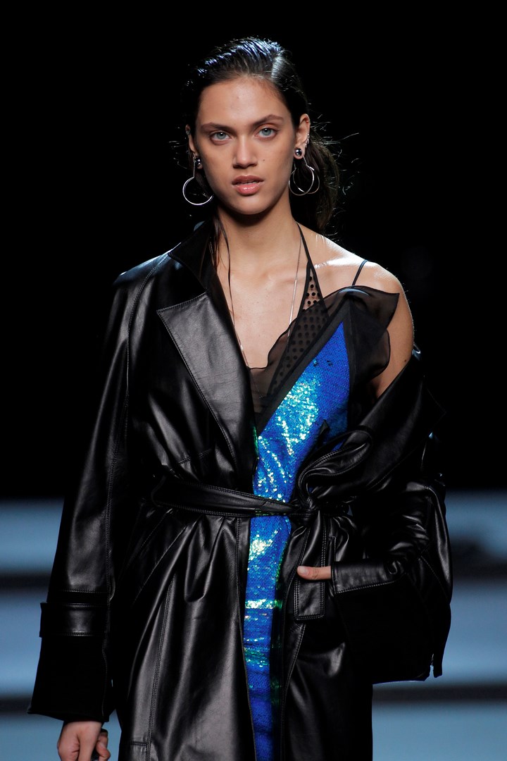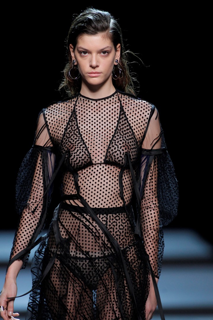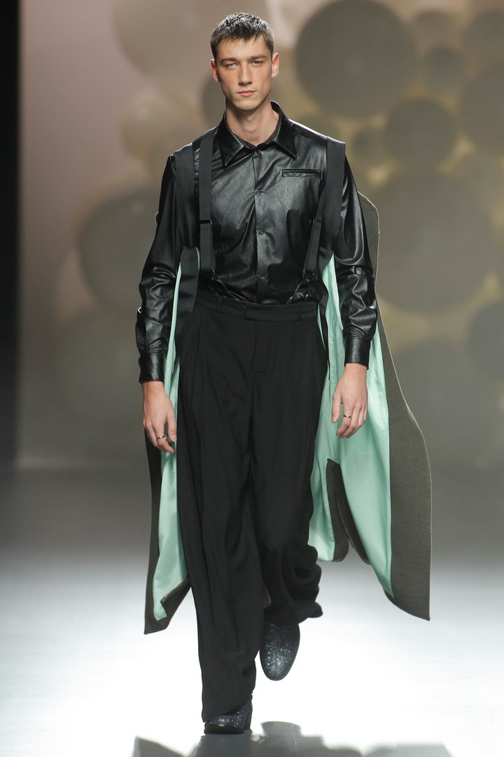 Juan Vidal presents us with a transgressive "Linda". Sensual and daring, the collection takes its name from the porn star Linda Lovelace. Fetishism and films like "Young and Beautiful" and "Dressed to Kill" inspire the Alicante designer in a proposal that seeks to create confusion between right and wrong. Transparencies are protagonists in looks where sports garments sneak in, which are coated in gloss to acquire new meaning and for which the transition between day and night is diluted with a dark chromatic range.