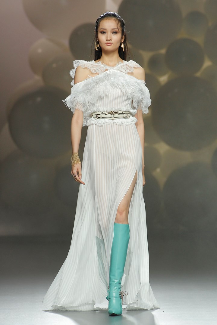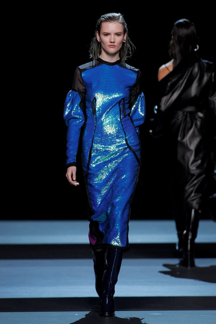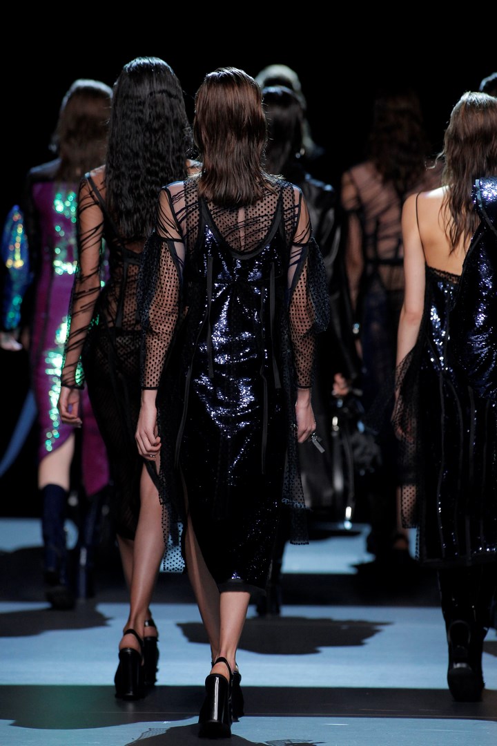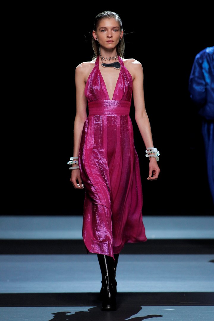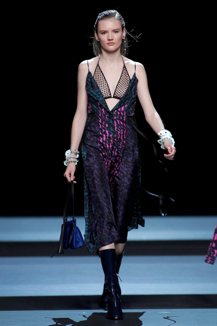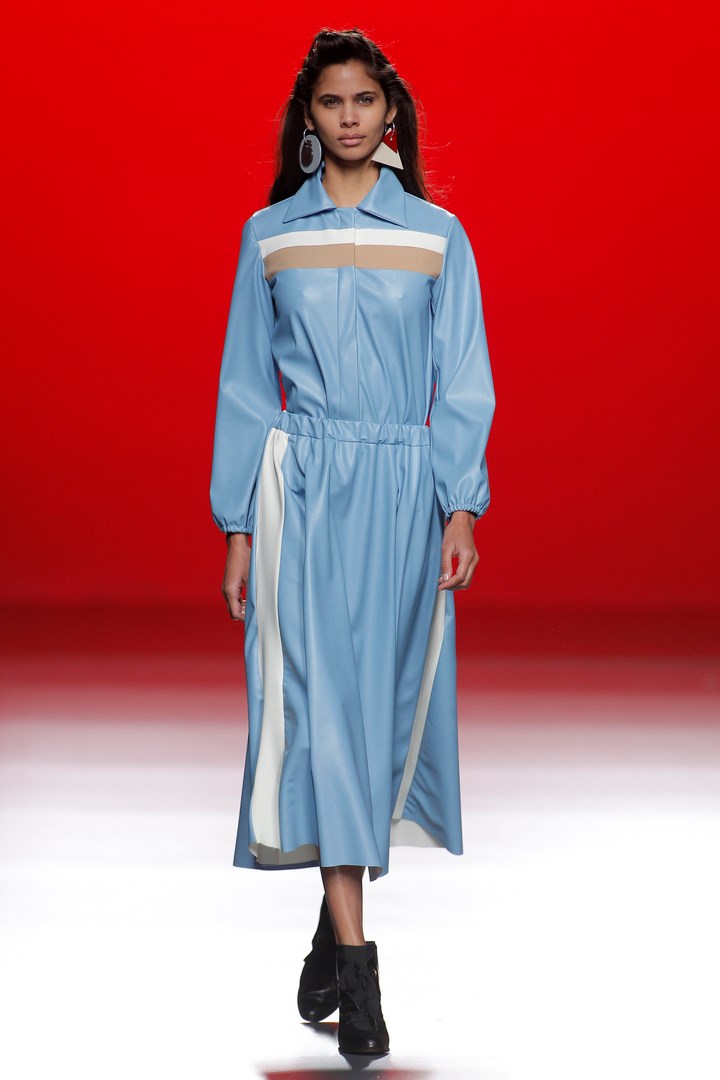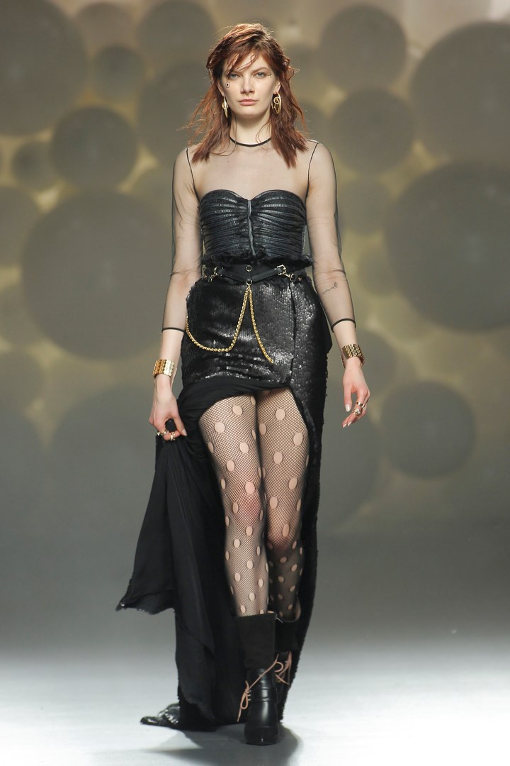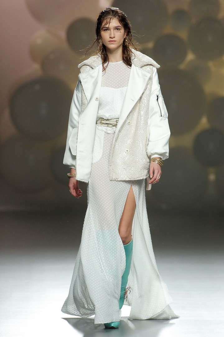 Juan Vidal presents us with a transgressive "Linda". Sensual and daring, the collection takes its name from the porn star Linda Lovelace. Fetishism and films like "Young and Beautiful" and "Dressed to Kill" inspire the Alicante designer in a proposal that seeks to create confusion between right and wrong. Transparencies are protagonists in looks where sports garments sneak in, which are coated in gloss to acquire new meaning and for which the transition between day and night is diluted with a dark chromatic range.