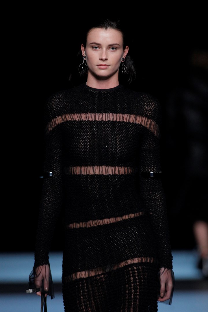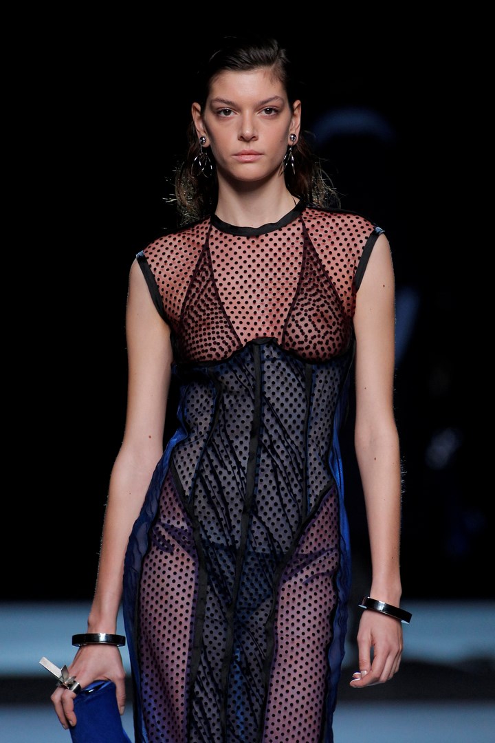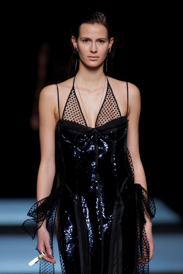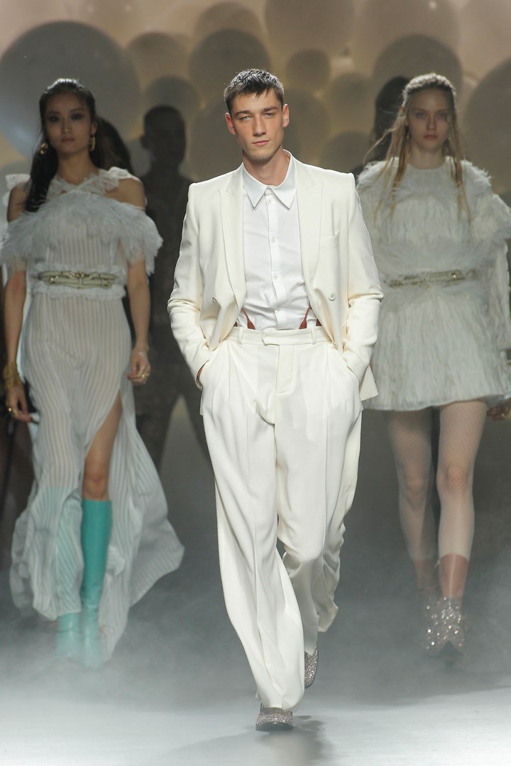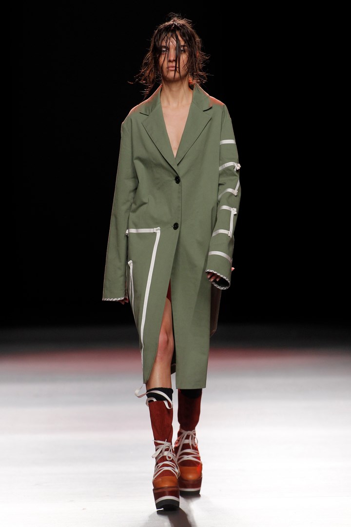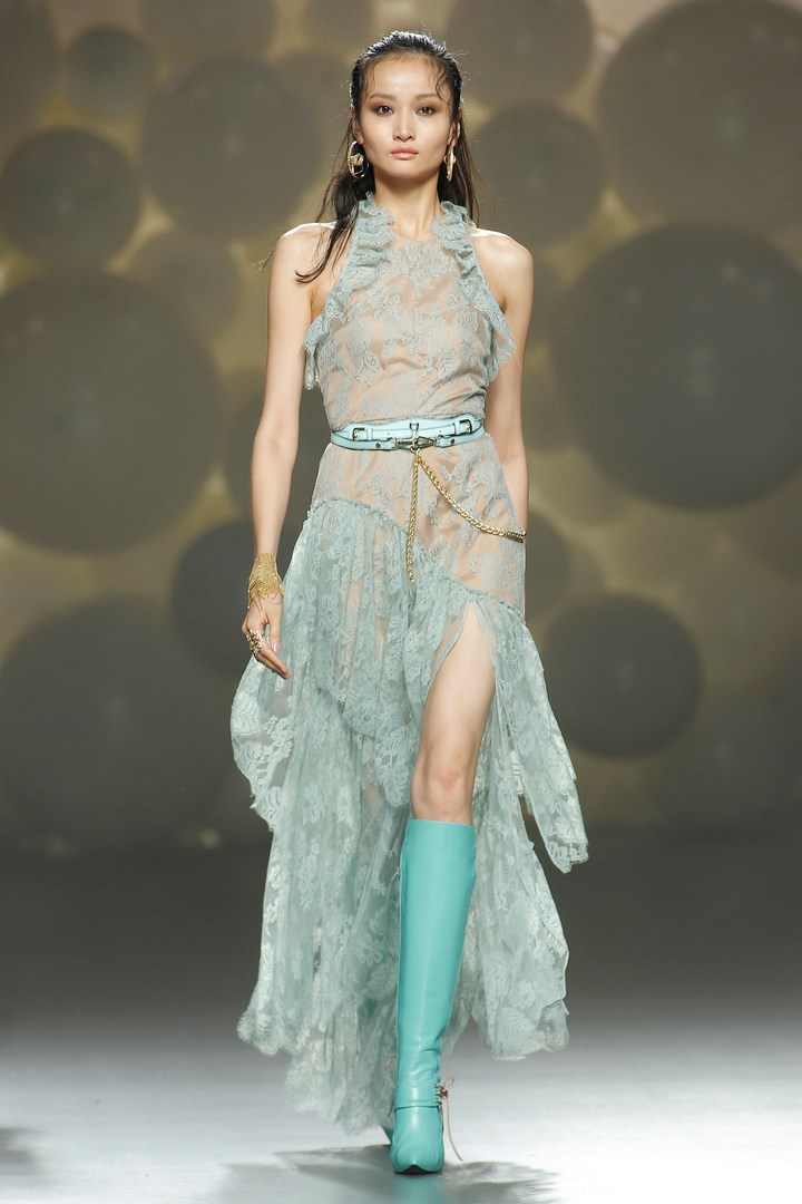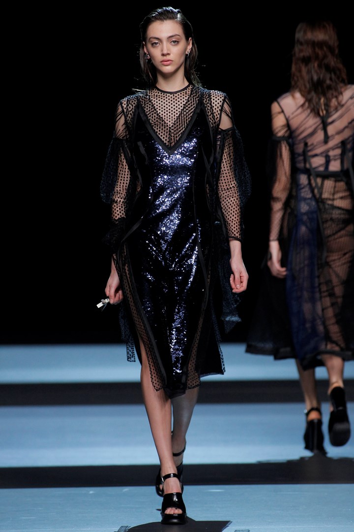 Juan Vidal presents us with a transgressive "Linda". Sensual and daring, the collection takes its name from the porn star Linda Lovelace. Fetishism and films like "Young and Beautiful" and "Dressed to Kill" inspire the Alicante designer in a proposal that seeks to create confusion between right and wrong. Transparencies are protagonists in looks where sports garments sneak in, which are coated in gloss to acquire new meaning and for which the transition between day and night is diluted with a dark chromatic range.