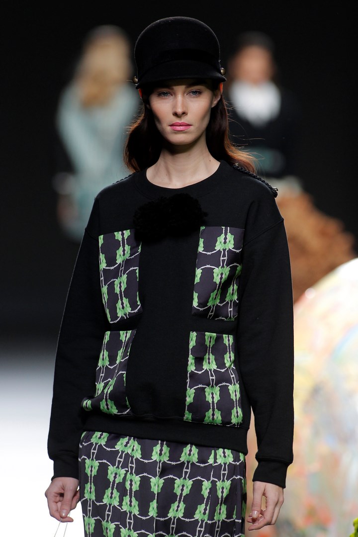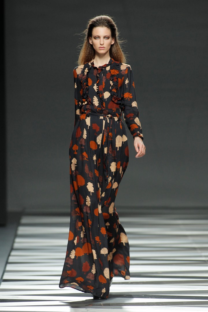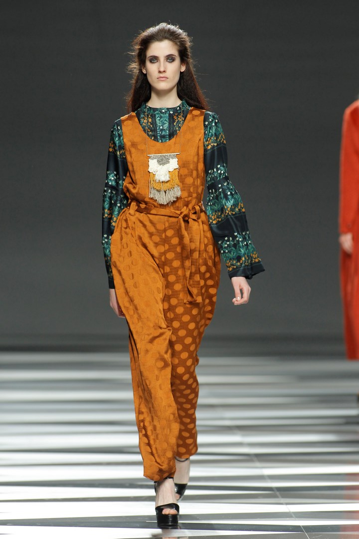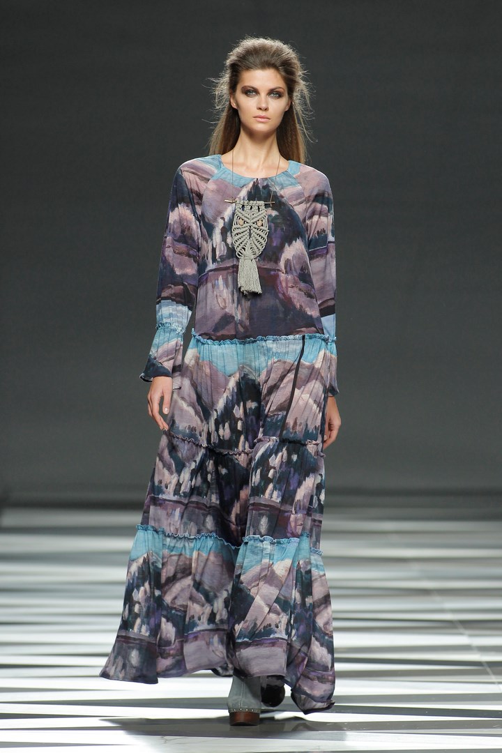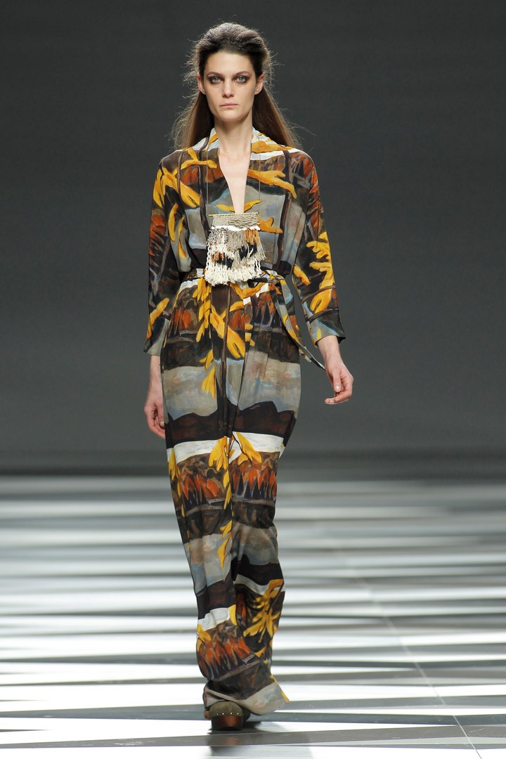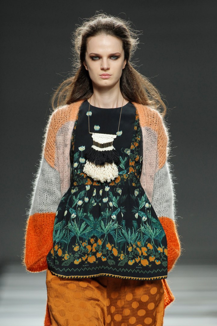 Ailanto is inspired by the paintings of Canadian Lawren Harris. Landscape painting is the starting point for a collection in which forests, mountains, skies and lakes are reflected in the fabric prints. The Muñoz brothers’ winter is tinted in dark tones opposed to bright colours such as turquoise, ocher or violet. Ailanto garments denote a taste for craftsmanship. Folk style dresses with elaborate bodices, patchwork and details of ruffles are key to a proposal drawn up in rich materials such as alpaca, mohair and silk.