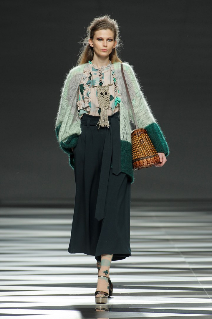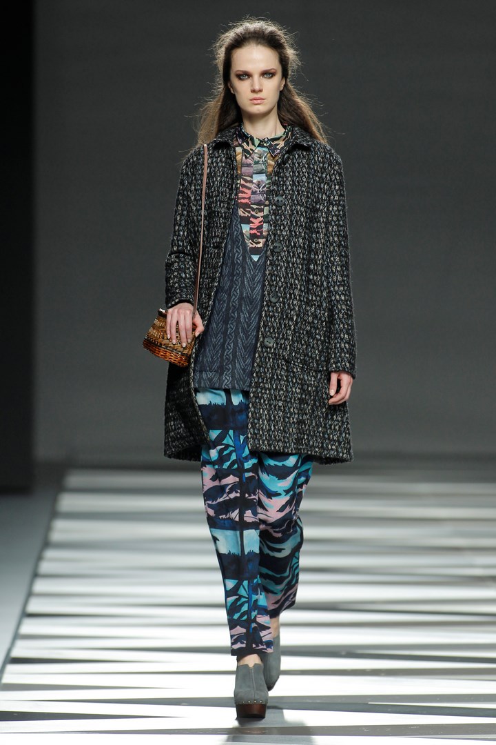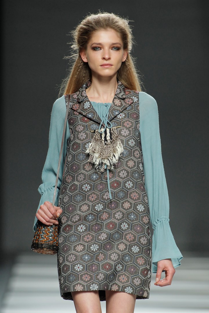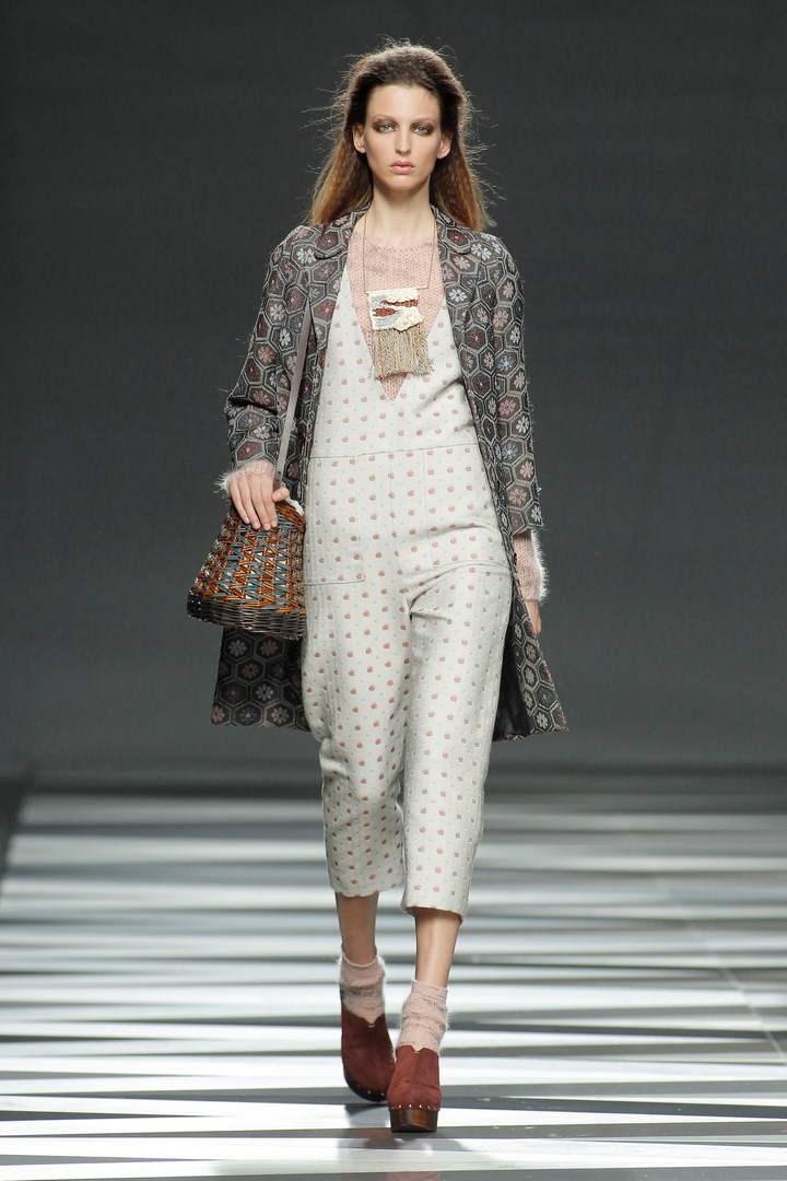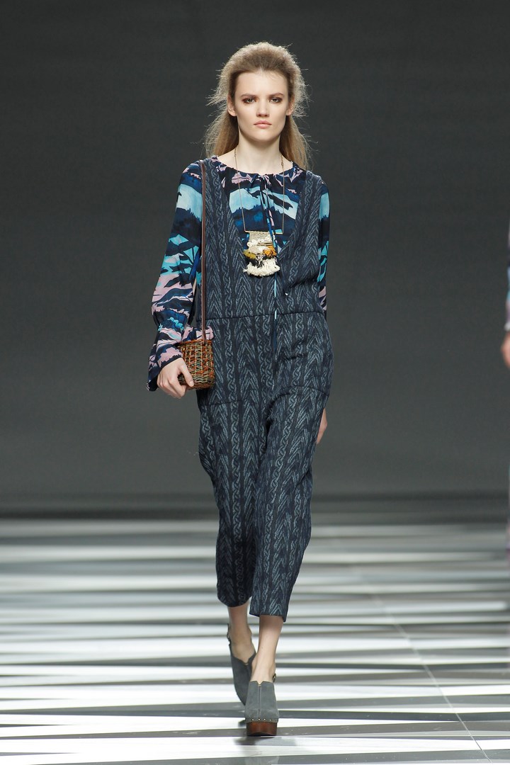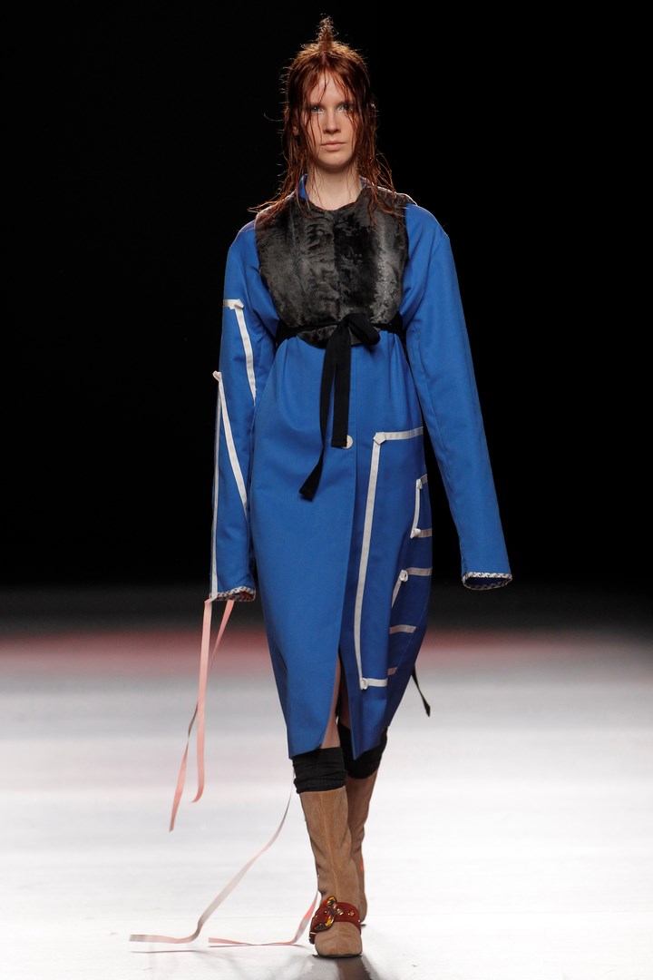 Ailanto is inspired by the paintings of Canadian Lawren Harris. Landscape painting is the starting point for a collection in which forests, mountains, skies and lakes are reflected in the fabric prints. The Muñoz brothers’ winter is tinted in dark tones opposed to bright colours such as turquoise, ocher or violet. Ailanto garments denote a taste for craftsmanship. Folk style dresses with elaborate bodices, patchwork and details of ruffles are key to a proposal drawn up in rich materials such as alpaca, mohair and silk.