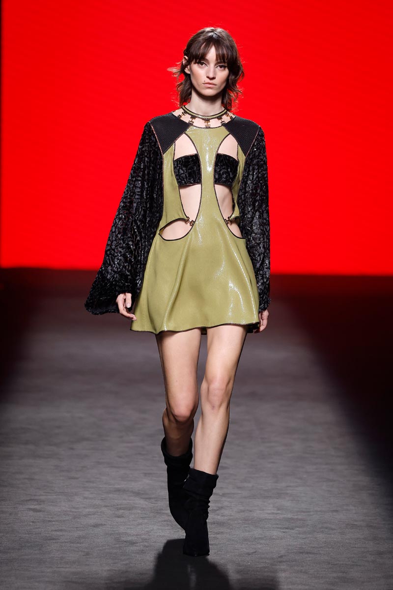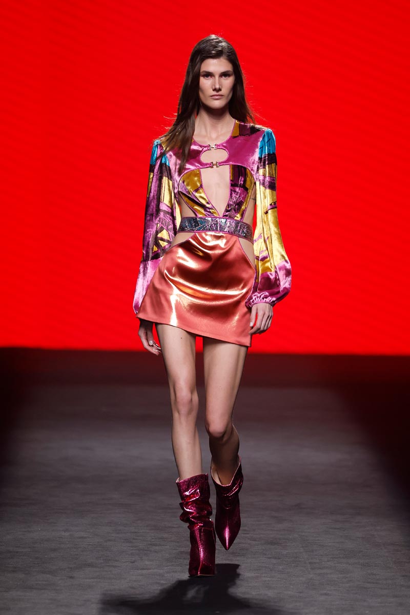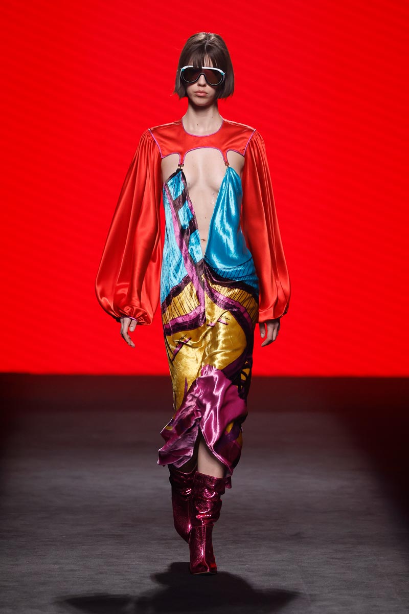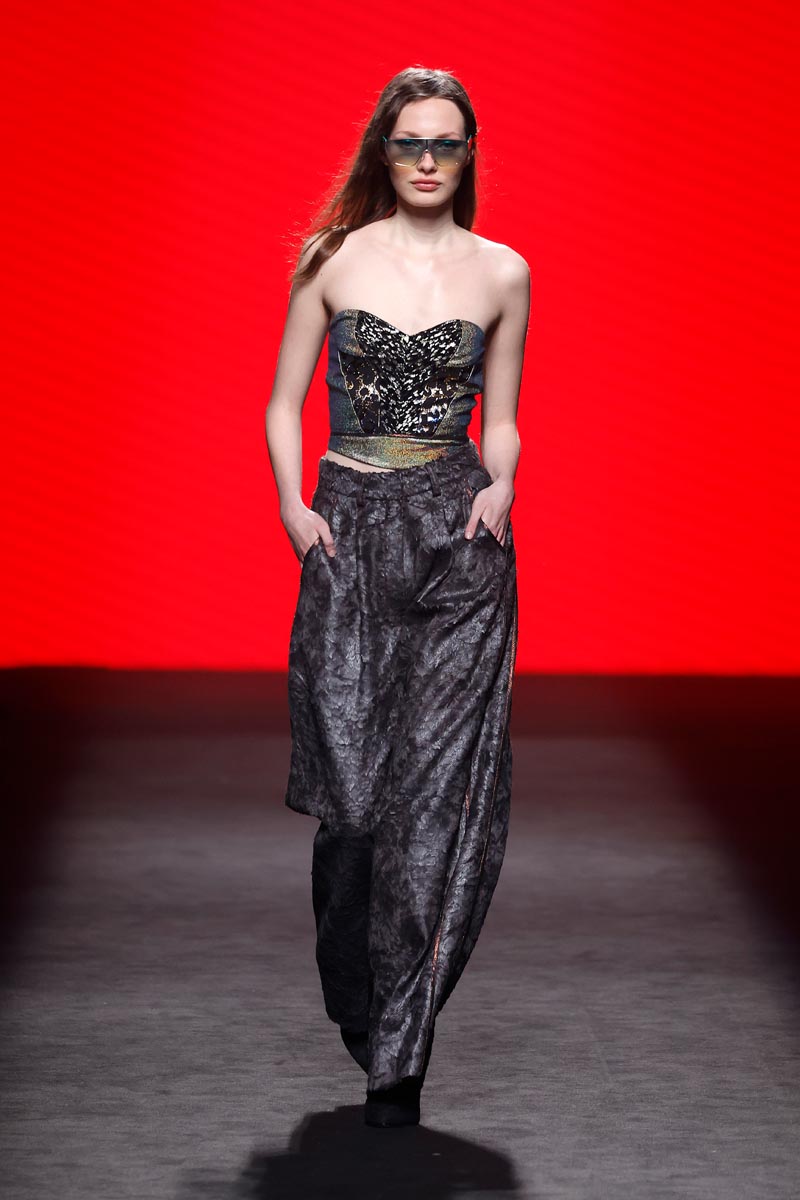 The fashion designer proposes oversized metallic jackets, dresses with openings and asymmetries, oversized trousers and miniskirts combined with experimental tops and ankle boots or high boots.