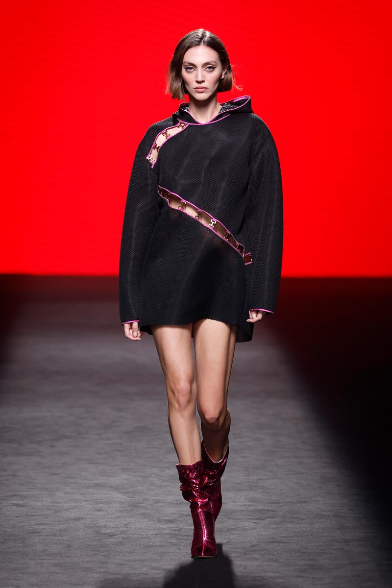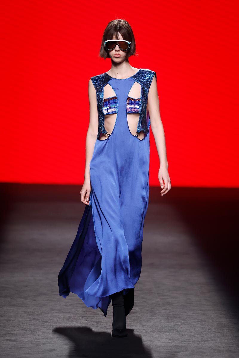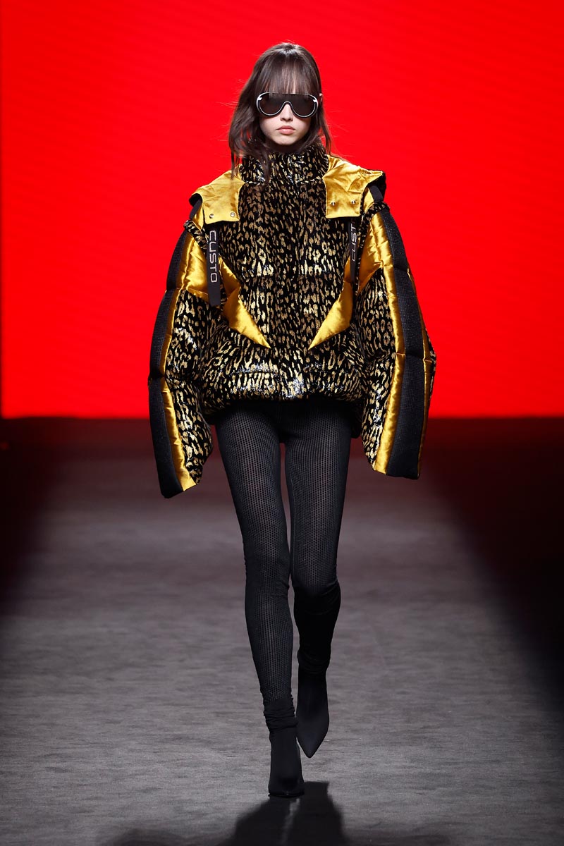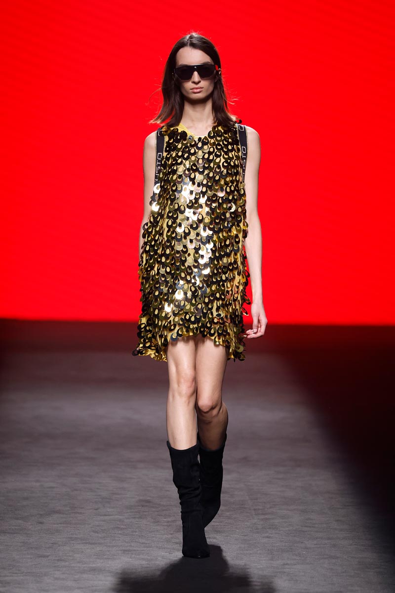 The fashion designer proposes oversized metallic jackets, dresses with openings and asymmetries, oversized trousers and miniskirts combined with experimental tops and ankle boots or high boots.
