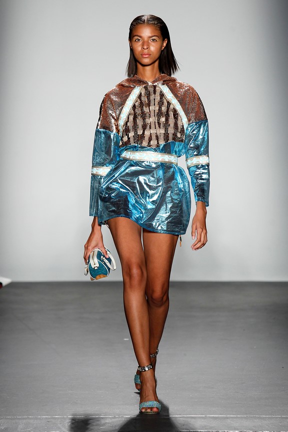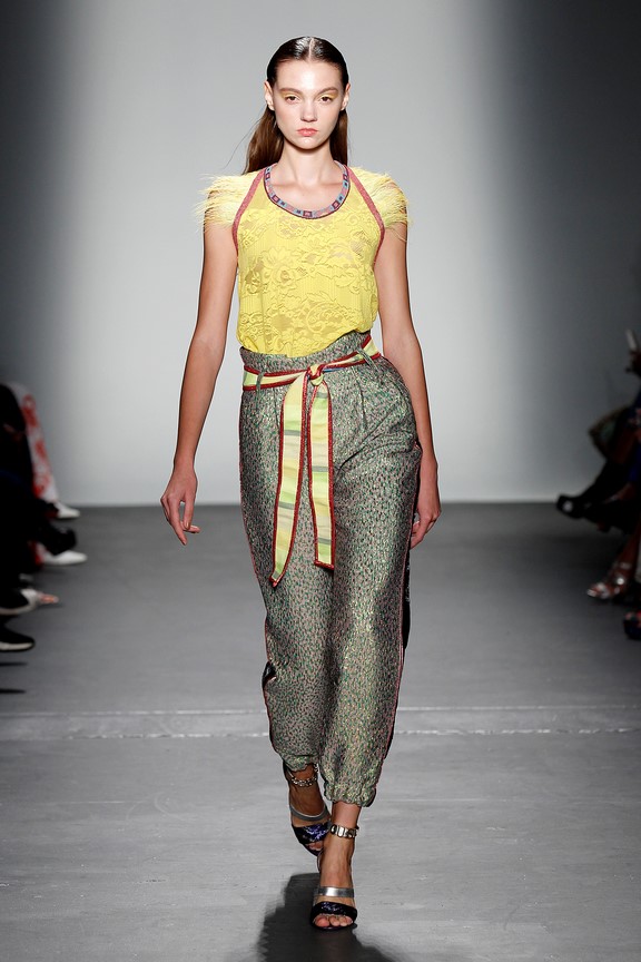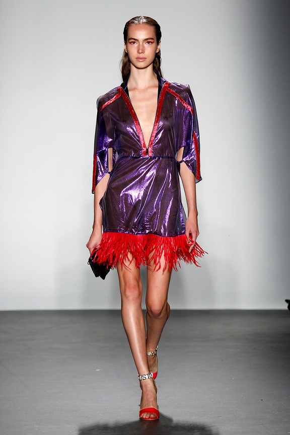 Custo Barcelona’s proposal is highly emotional and honours female strength through experimental lines and volumes. The woman’s body can be seen through cuts and windows, created with subtly placed strips, as well as short and long sets that fill the collection for spring-summer 2020 with contrasts.