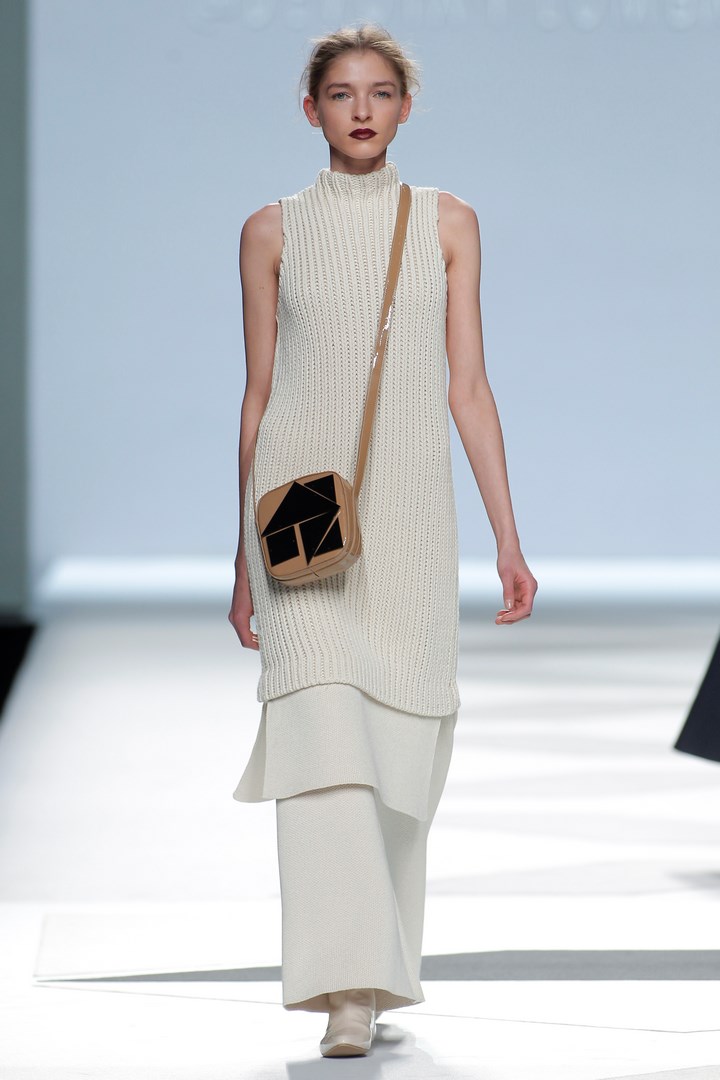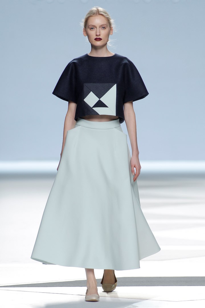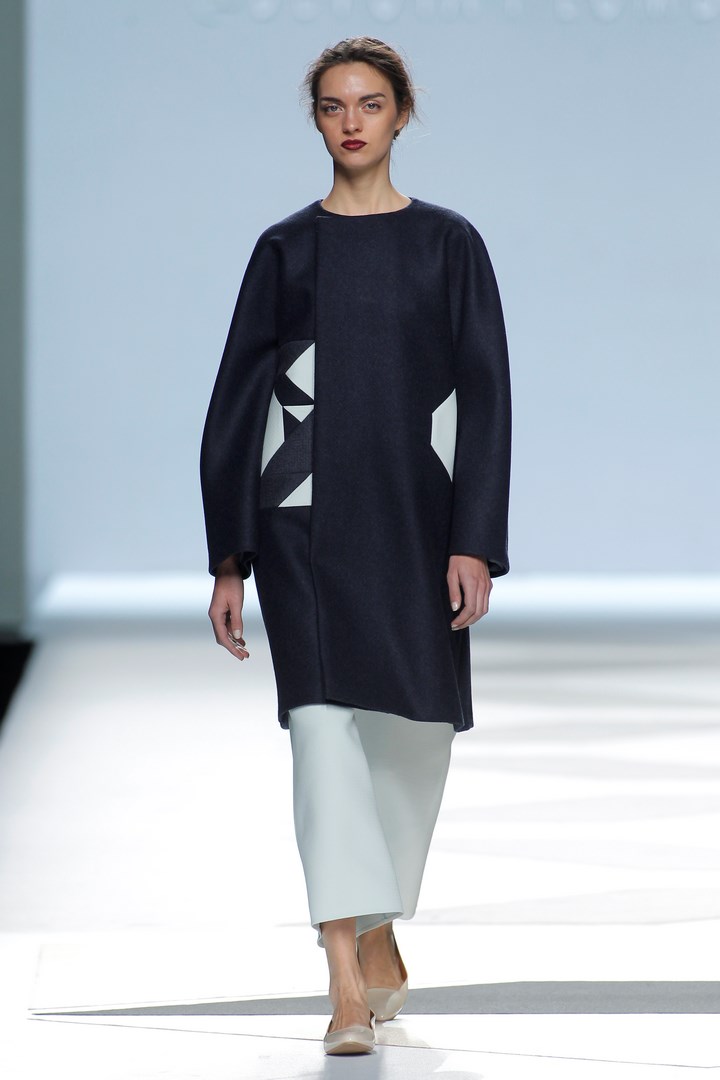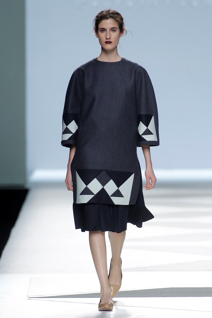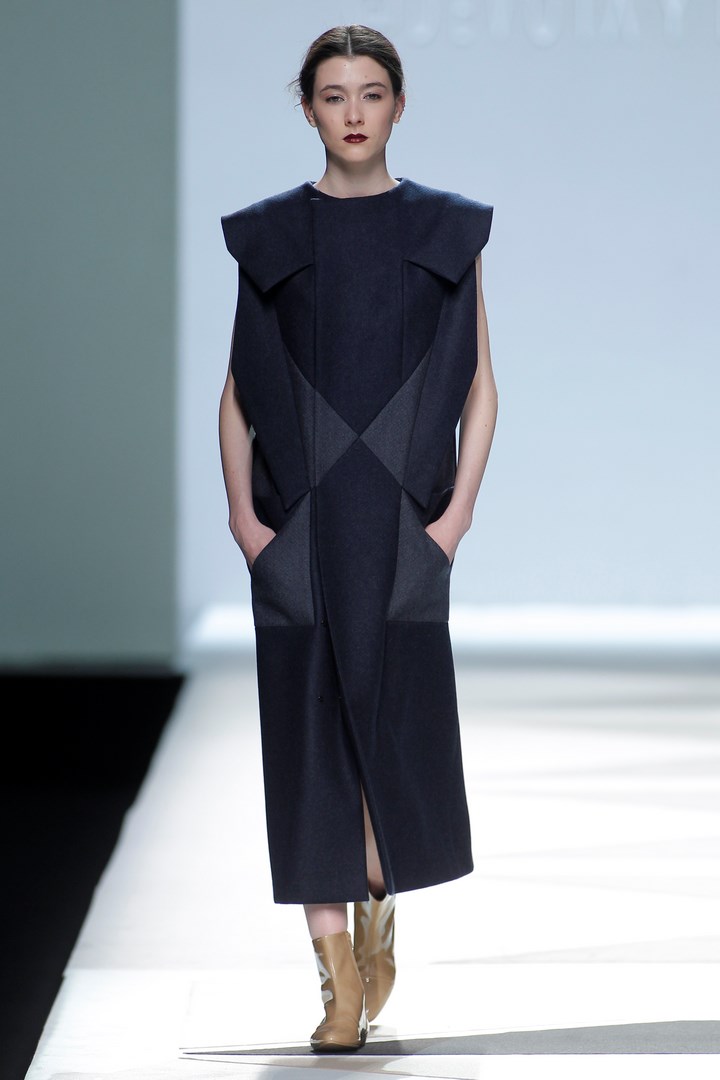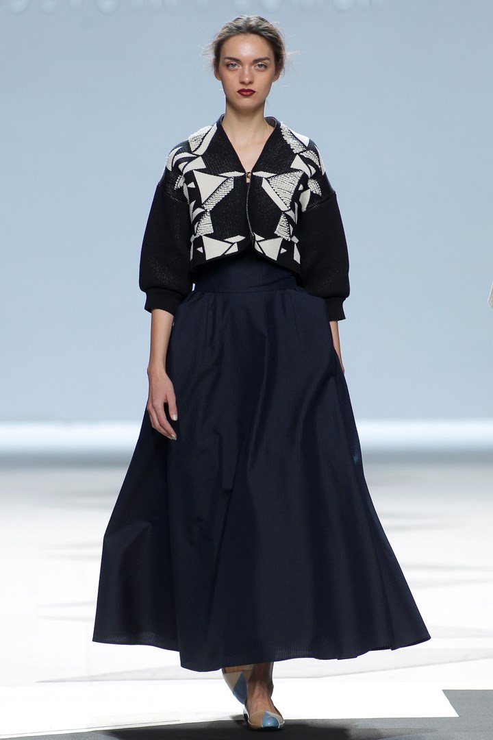Devota & Lomba showed on the runway his collection “Tangram”. Clean lines and geometric shapes are key to a proposal where the Basque designer tells us about deconstruction through his garments, with ample flared skirts and applications that come together piece by piece just like a game of tangram. Thick knitwear becomes one of the star bets by Devota & Lomba for next season. Ice, dark blue, black and cream are the tones that colour a collection constructed in an architectural manner.