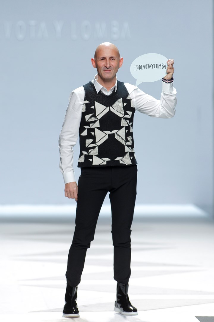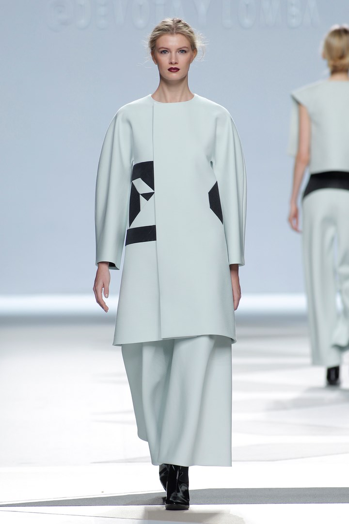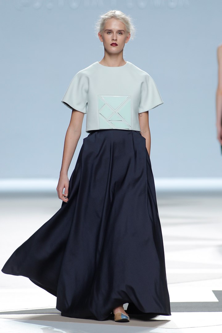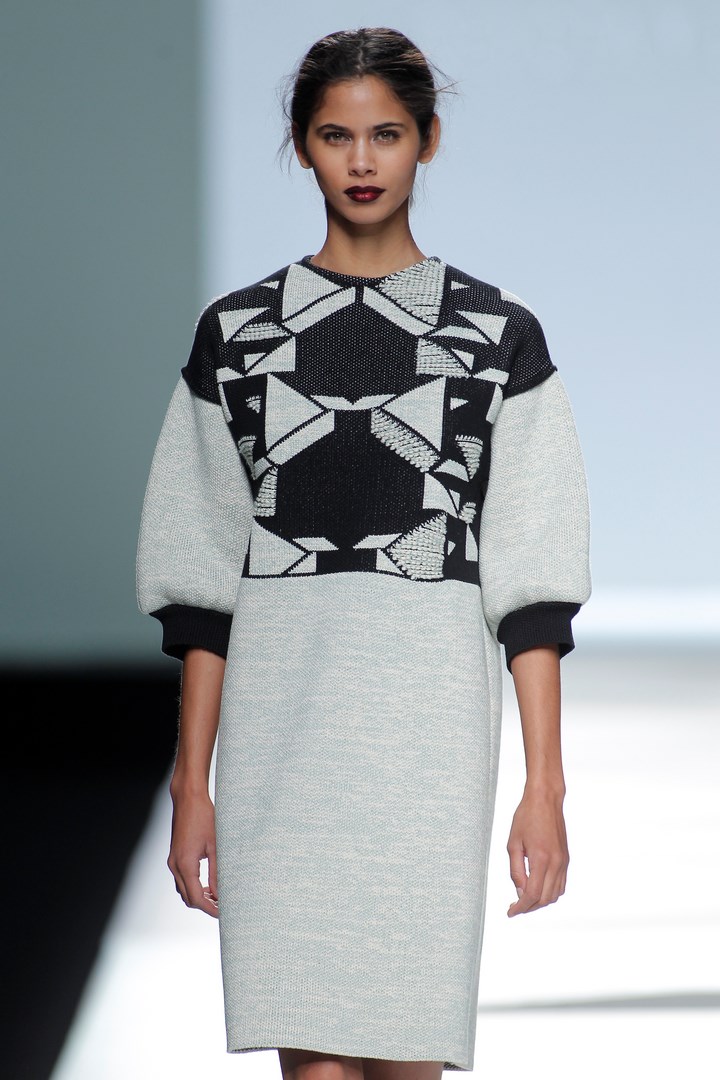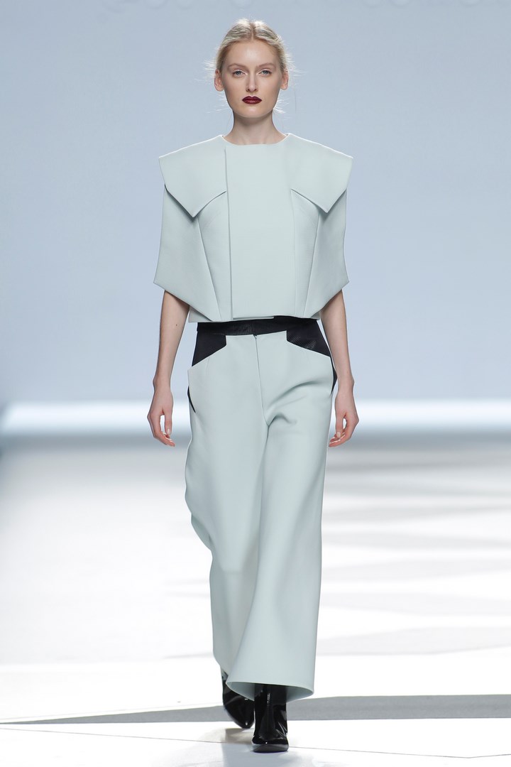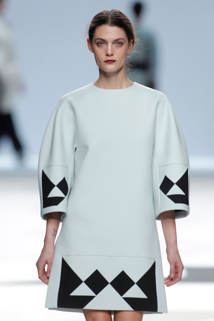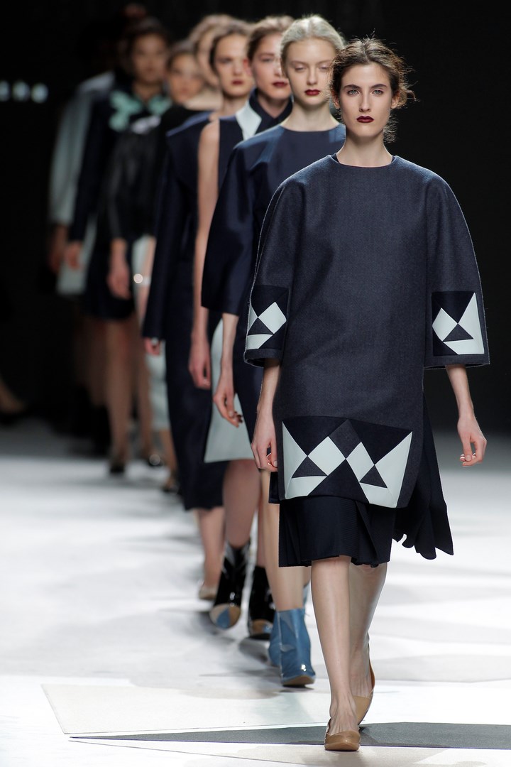 Devota & Lomba showed on the runway his collection “Tangram”. Clean lines and geometric shapes are key to a proposal where the Basque designer tells us about deconstruction through his garments, with ample flared skirts and applications that come together piece by piece just like a game of tangram. Thick knitwear becomes one of the star bets by Devota & Lomba for next season. Ice, dark blue, black and cream are the tones that colour a collection constructed in an architectural manner.