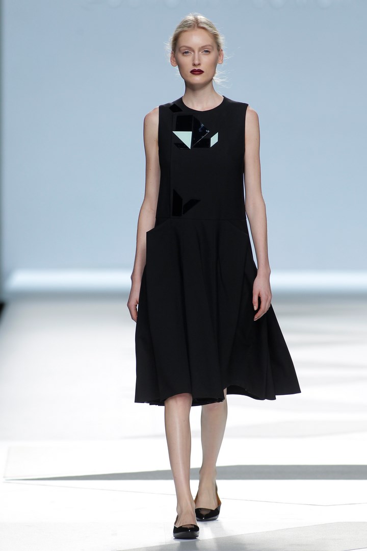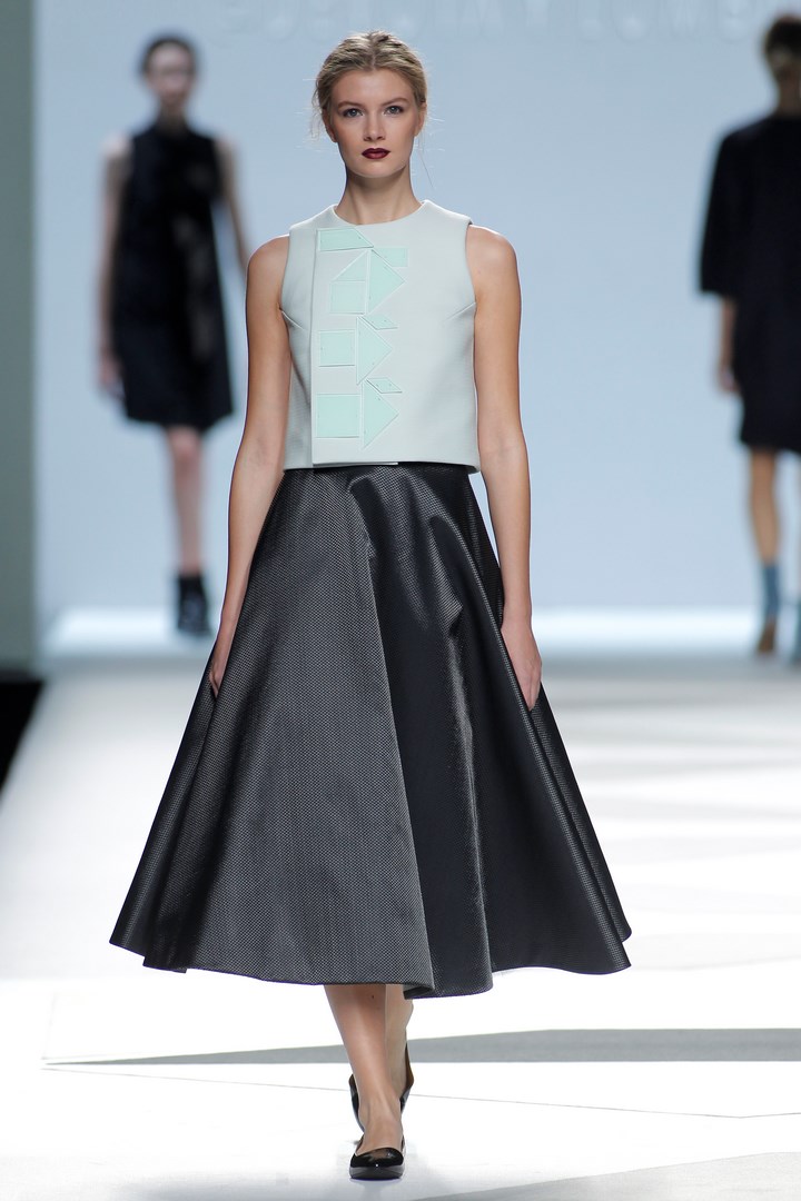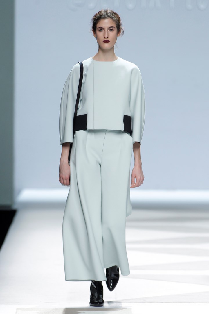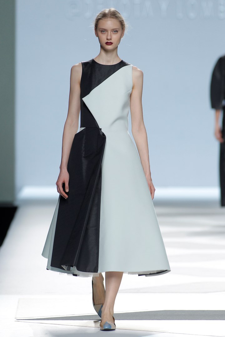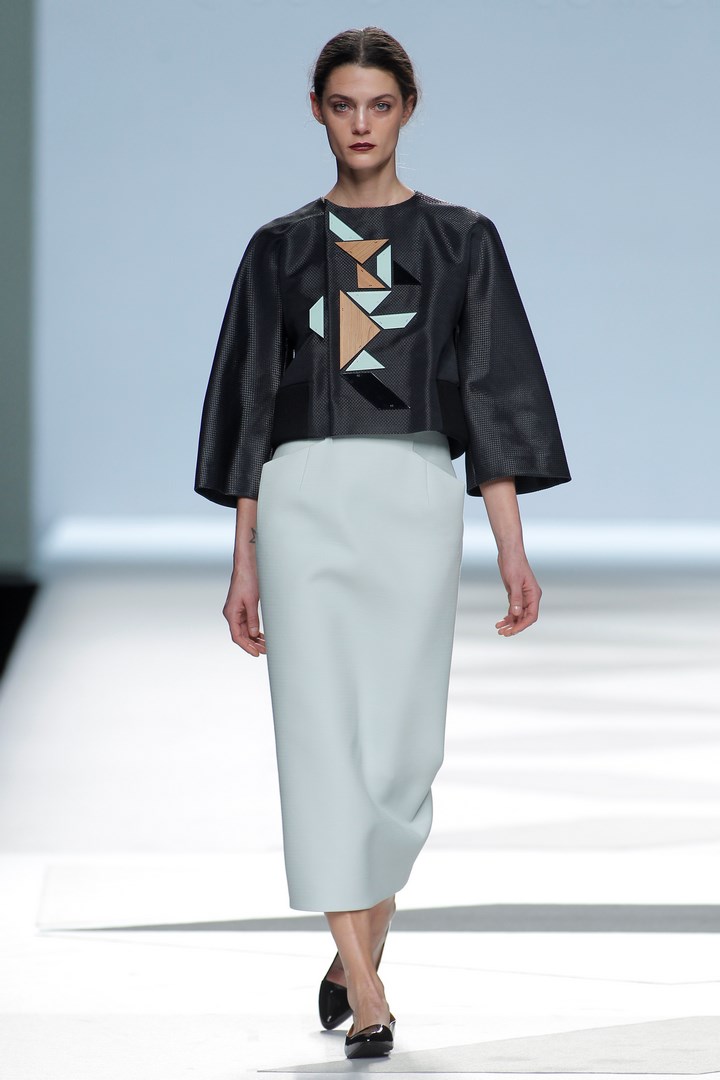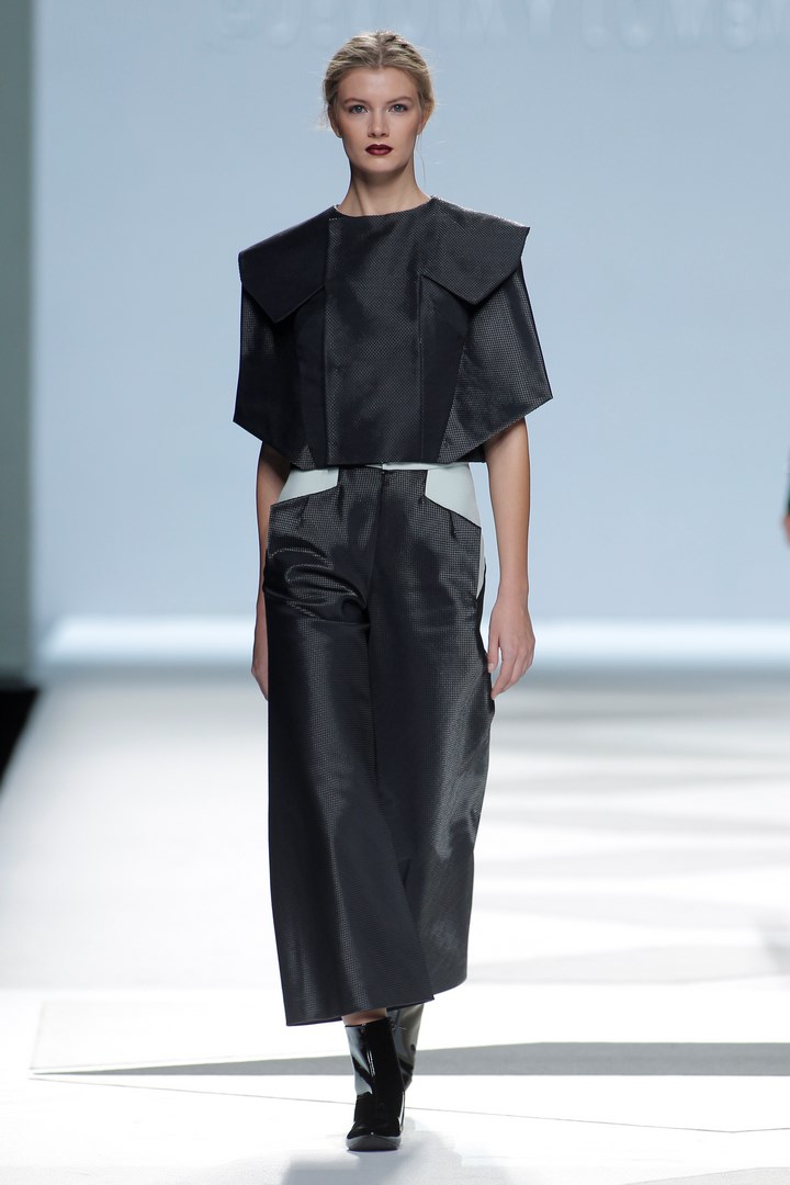 Devota & Lomba showed on the runway his collection “Tangram”. Clean lines and geometric shapes are key to a proposal where the Basque designer tells us about deconstruction through his garments, with ample flared skirts and applications that come together piece by piece just like a game of tangram. Thick knitwear becomes one of the star bets by Devota & Lomba for next season. Ice, dark blue, black and cream are the tones that colour a collection constructed in an architectural manner.