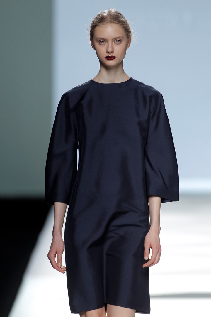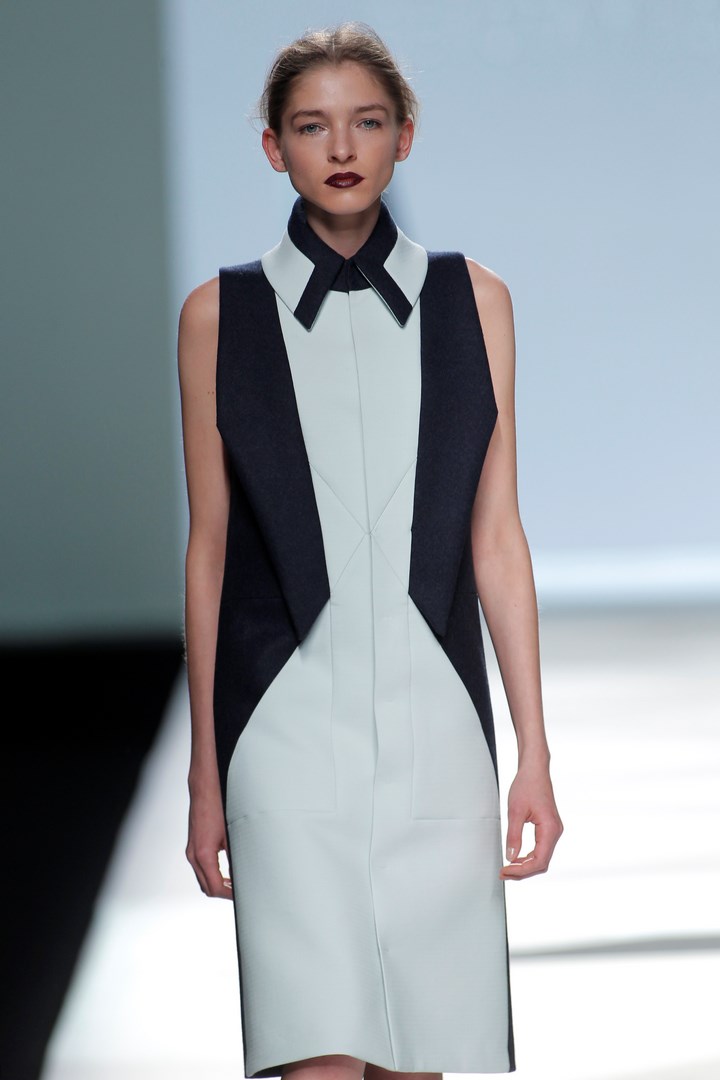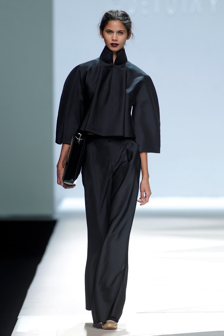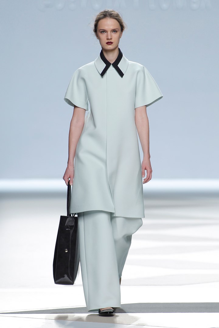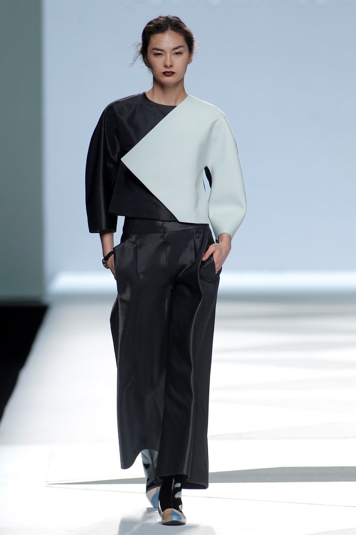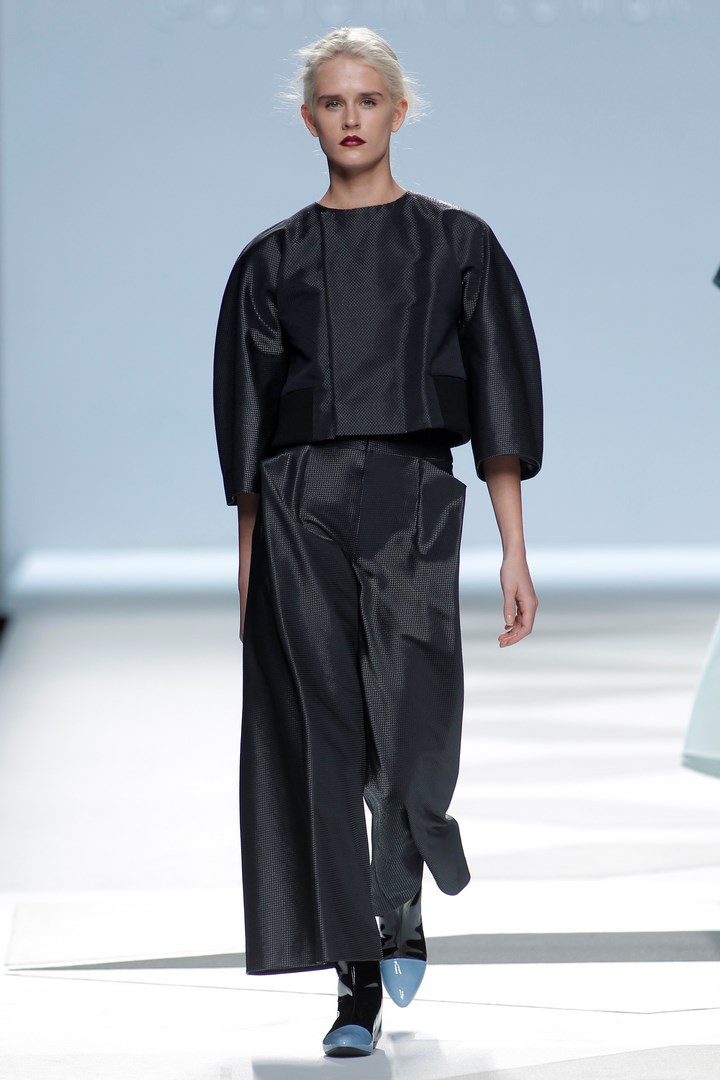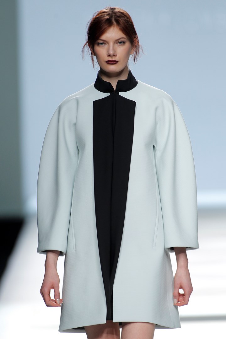 Devota & Lomba showed on the runway his collection “Tangram”. Clean lines and geometric shapes are key to a proposal where the Basque designer tells us about deconstruction through his garments, with ample flared skirts and applications that come together piece by piece just like a game of tangram. Thick knitwear becomes one of the star bets by Devota & Lomba for next season. Ice, dark blue, black and cream are the tones that colour a collection constructed in an architectural manner.
