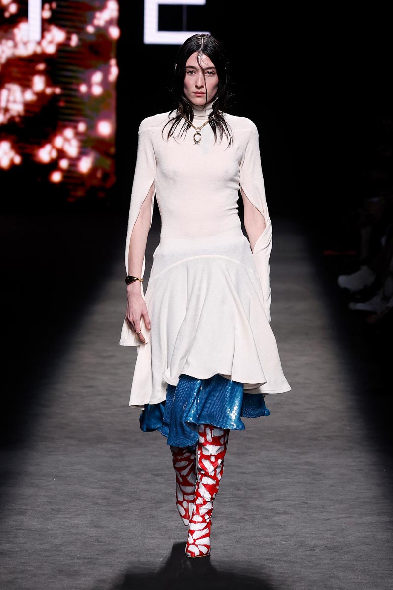 The designer proposes a wide range of recycled fabrics, and finishes ranging from sequins to lace, combining together satin, dots and twills. The chromatic range, where bright red, green and blue tones predominate, combines perfectly between black and neutral colours. The collection’s main print recreates, in a contemporary and reinvented manner, the forms of distinctive classical Greece male sculptures.