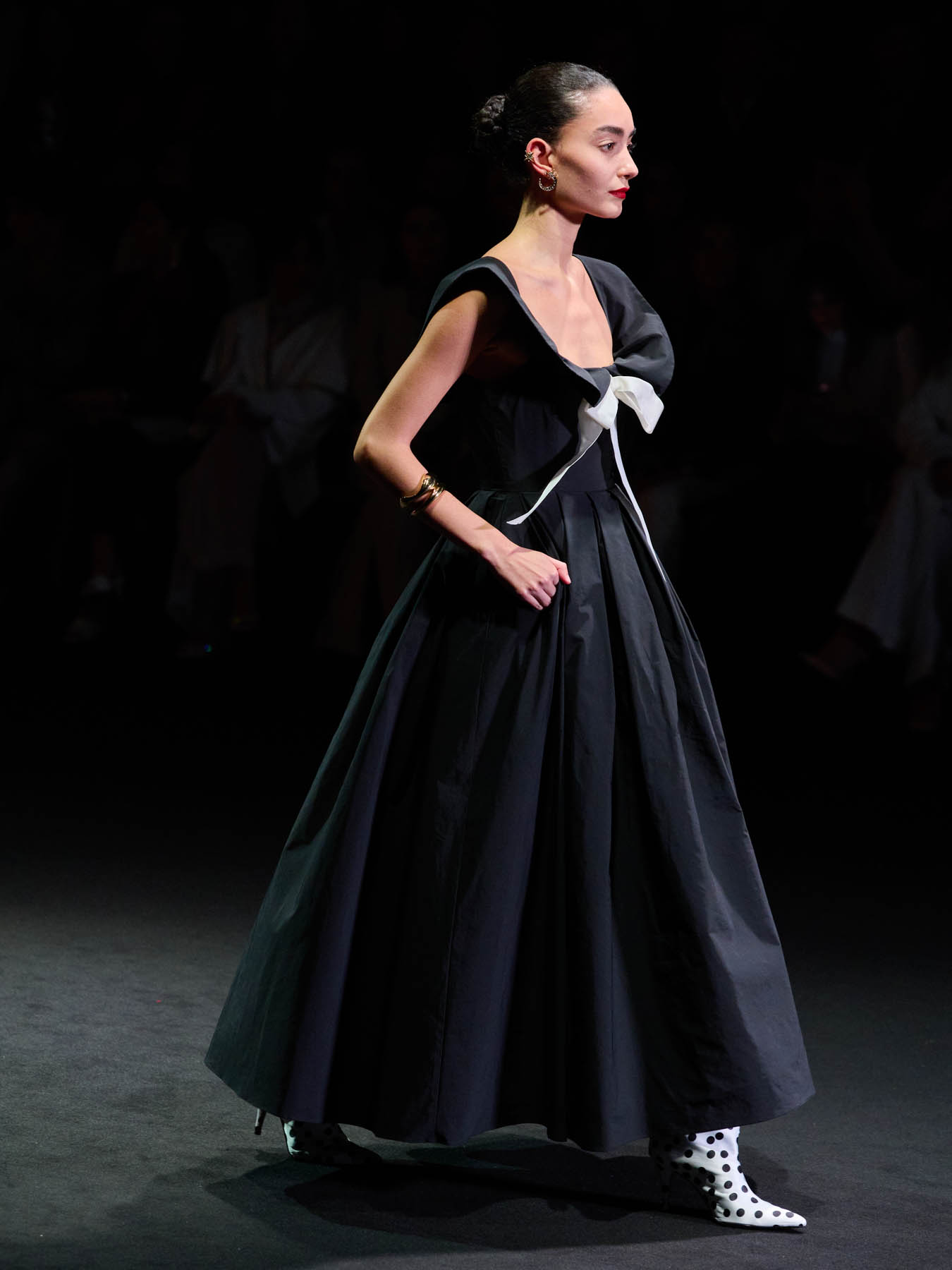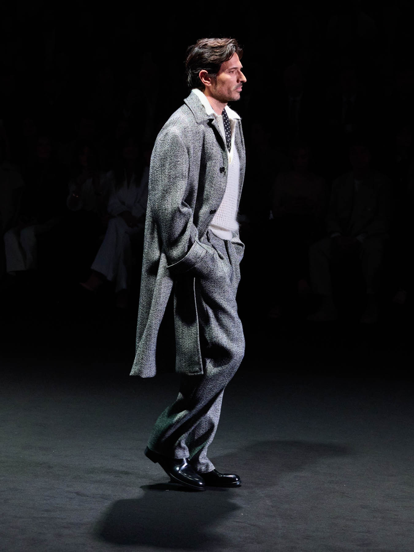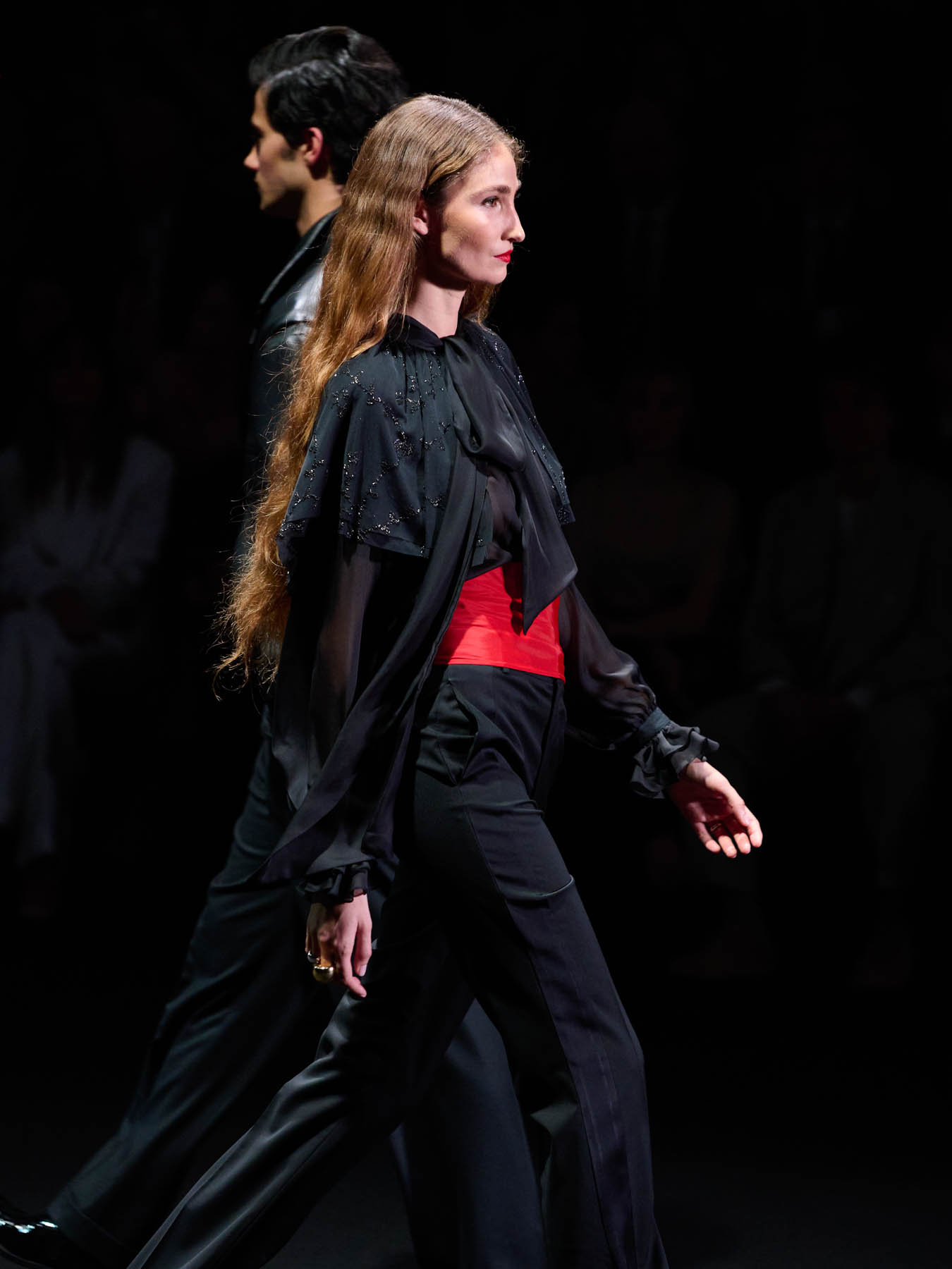 Contrast plays is also reflected in materials and textures, such as T-shirts that replace cotton with transparent wool, interchangeable collars and ties with stripes and polka dots as well as oversized sweaters accompanied by wide-draping skirts. The main fabrics include wool, silk, mohair and velvet, in a palette of black, burgundy and khaki, with flashes of light due to metallic finishes.