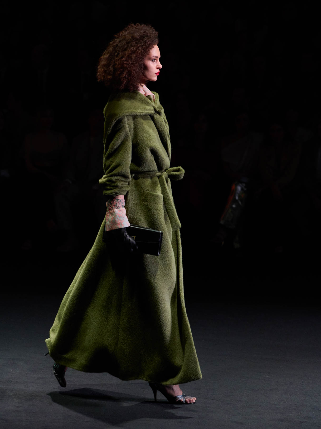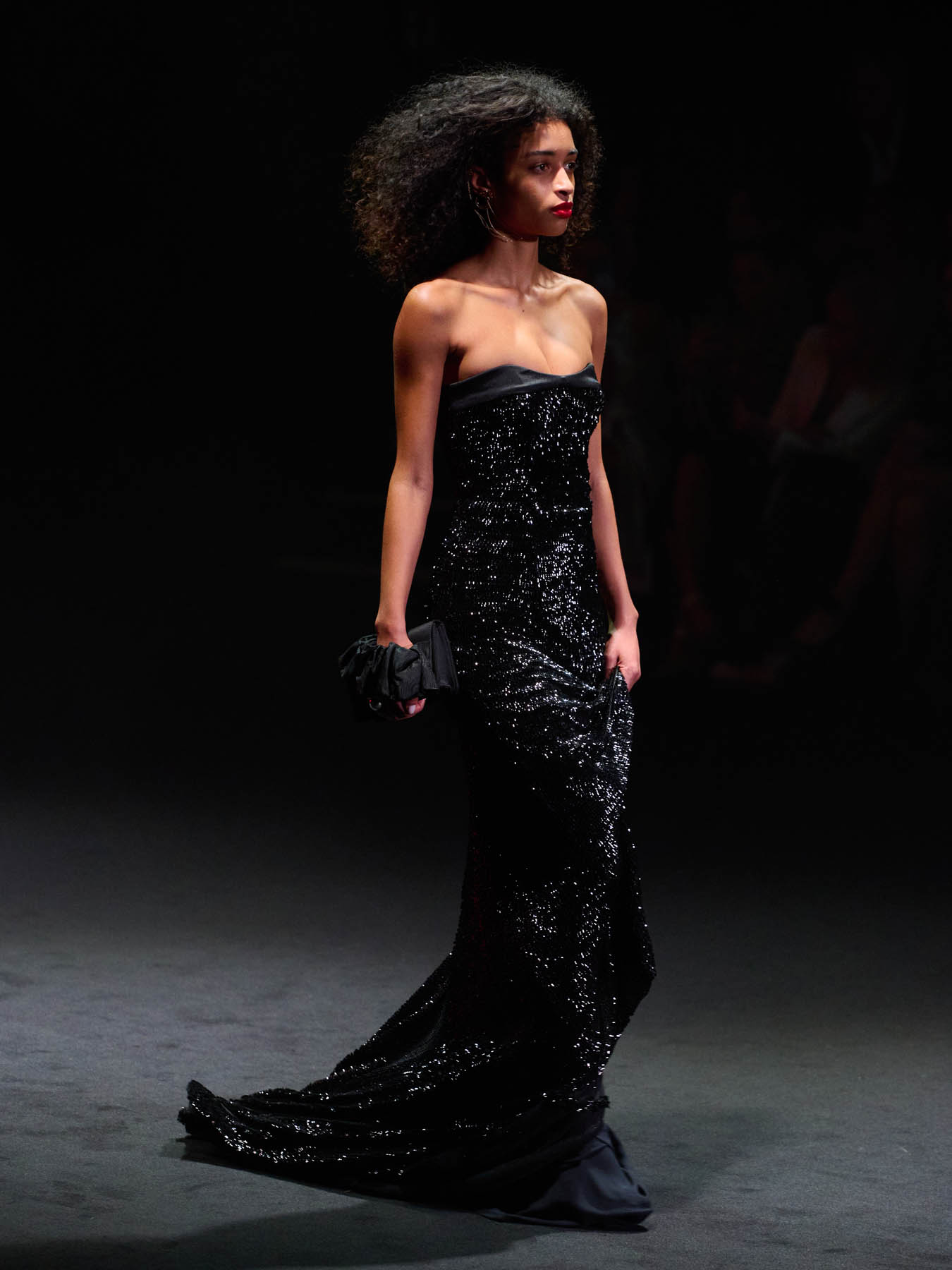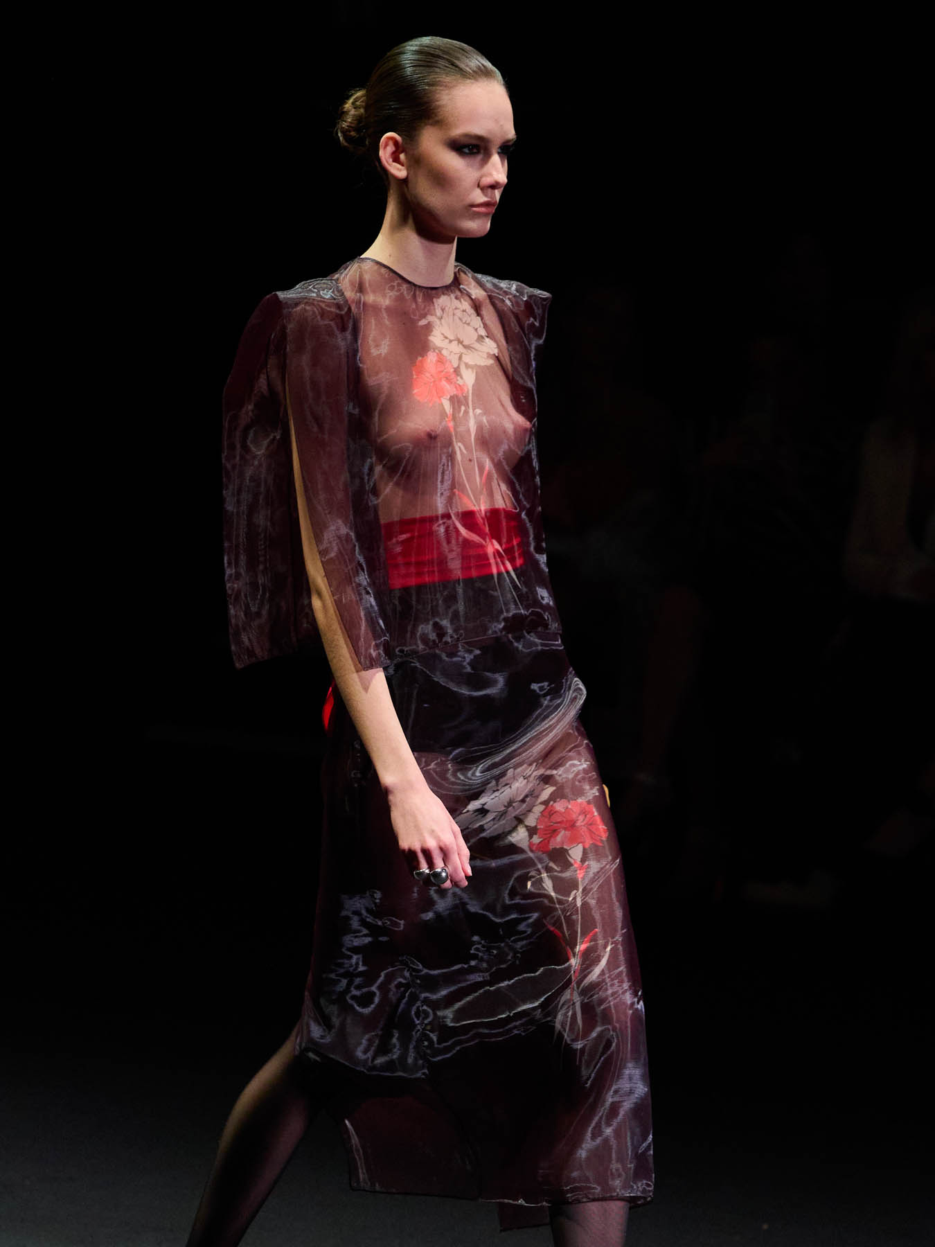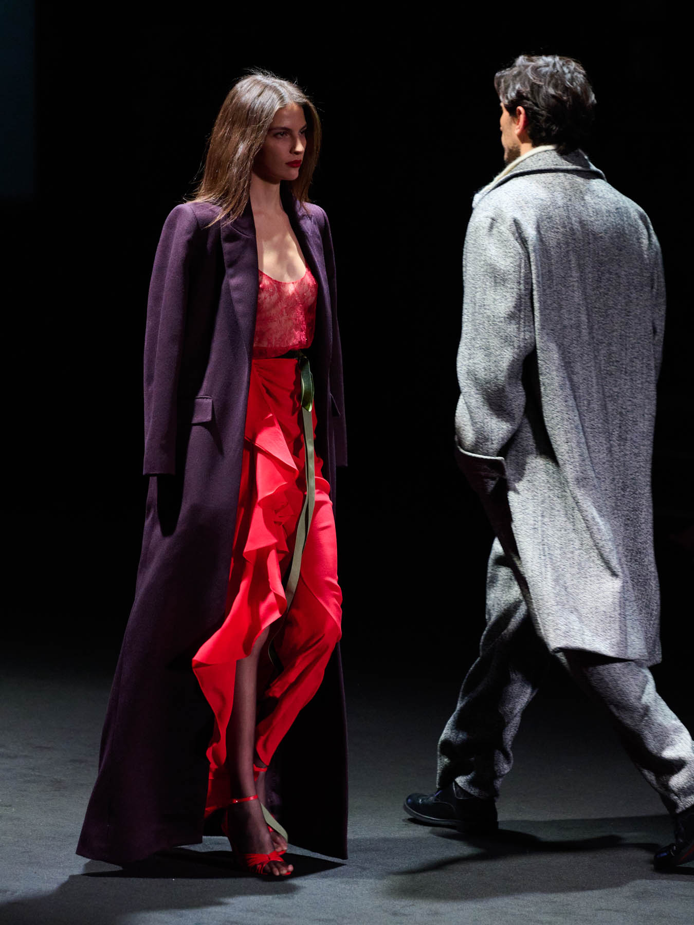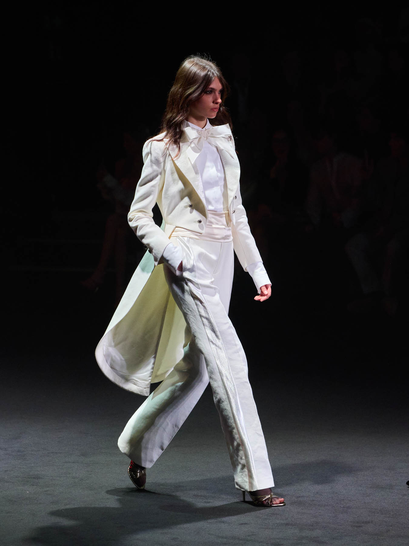 The codes of men’s tailoring are reinterpreted in feminine garments by combining tuxedos with straight, flared or drain-pipe trousers. Additionally, the collection gives way to the silhouette’s progressive feminisation through sketched garments with déshabillé or half-dressed designs.