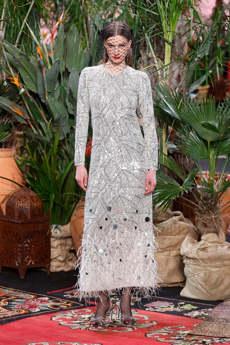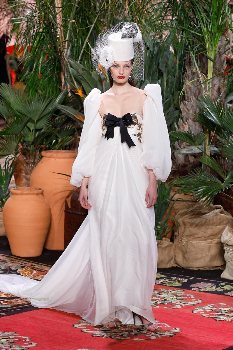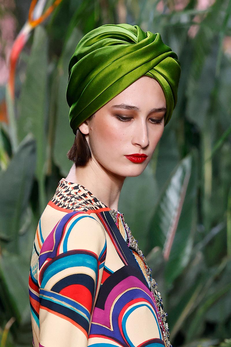 To complete his oriental proposal, the signature brand has created velvet sandals, patent leather pumps, as well as elegant rabbit felt turbans and hats in collaboration with milliner Conchitta.