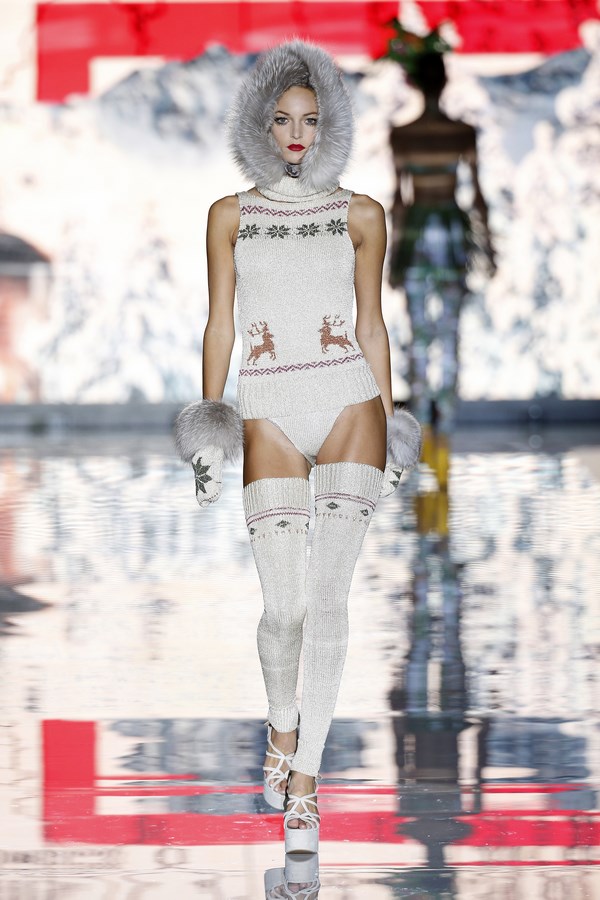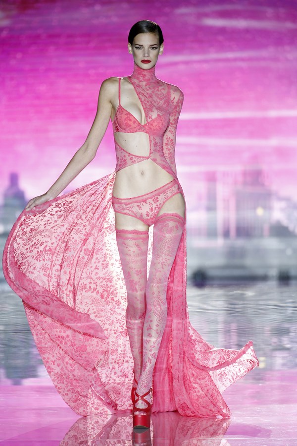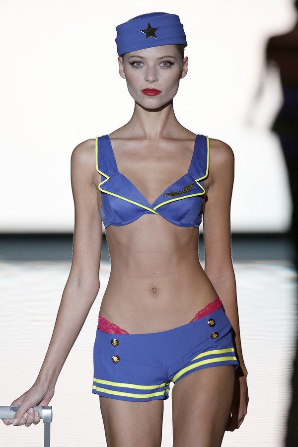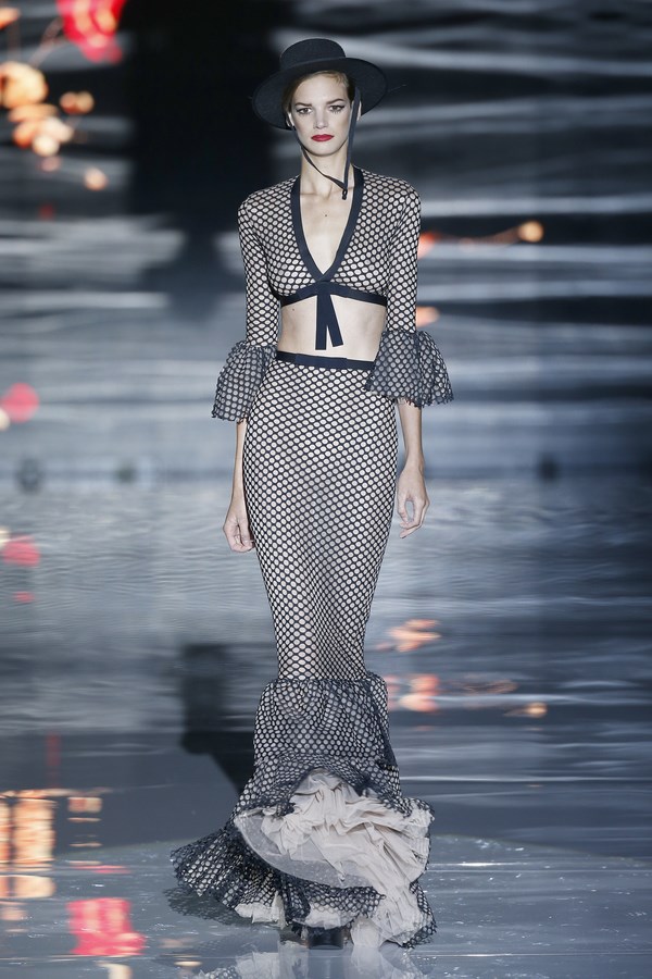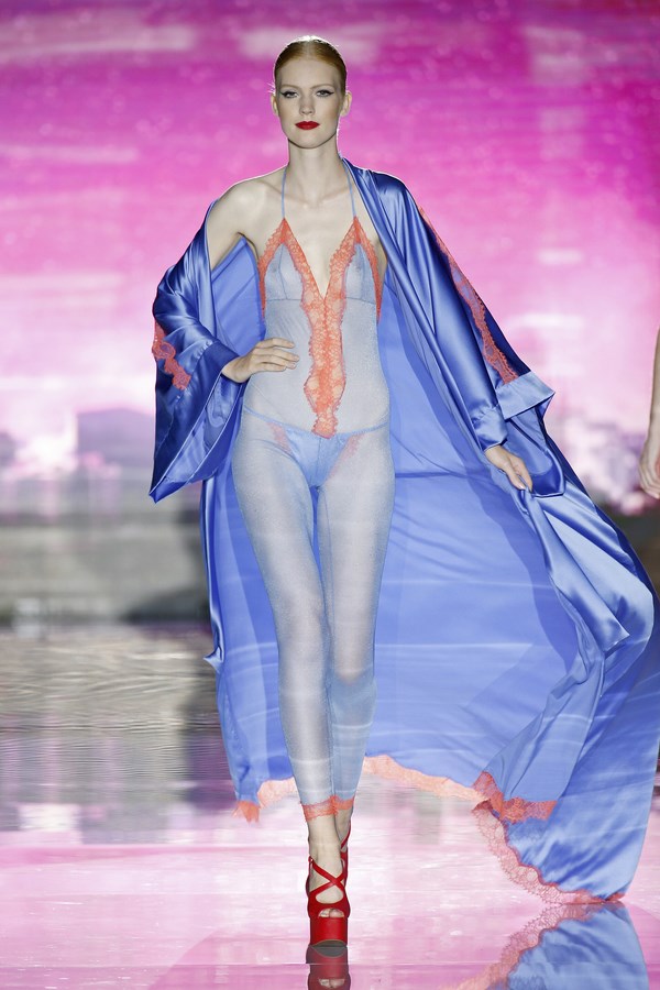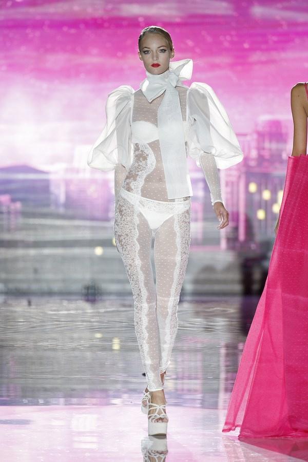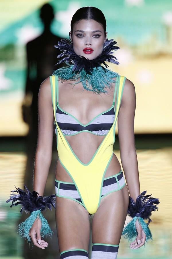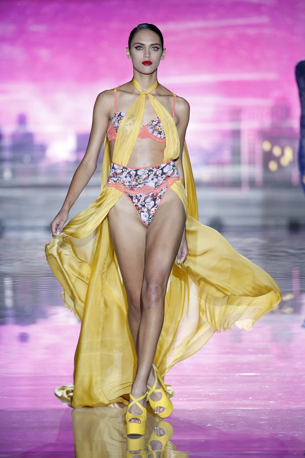 Andres Sarda placed on the runway a high-flying proposal. An imaginary journey that exudes creativity and highlights the know-how of a high-end lingerie label, pioneer in our country. A suggestive crew leads us towards an international beauty pageant interpreting, through pieces of lingerie and swimwear, the aesthetic codes of different cultures. Sailor stripes, floral prints and applications of rhinestones are dominant in the bikinis. Silk satins and lace trimmings rise as the absolute leaders of a seductive collection that places value in the female anatomy.