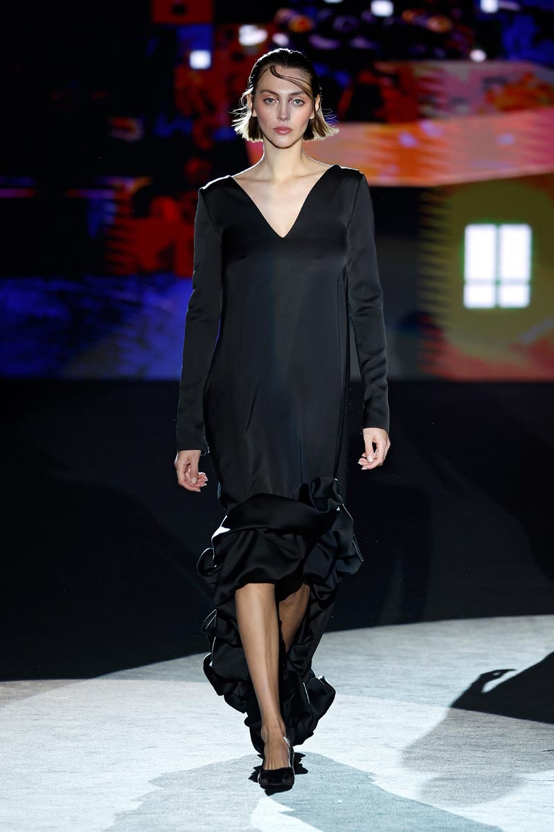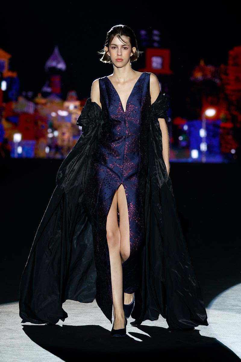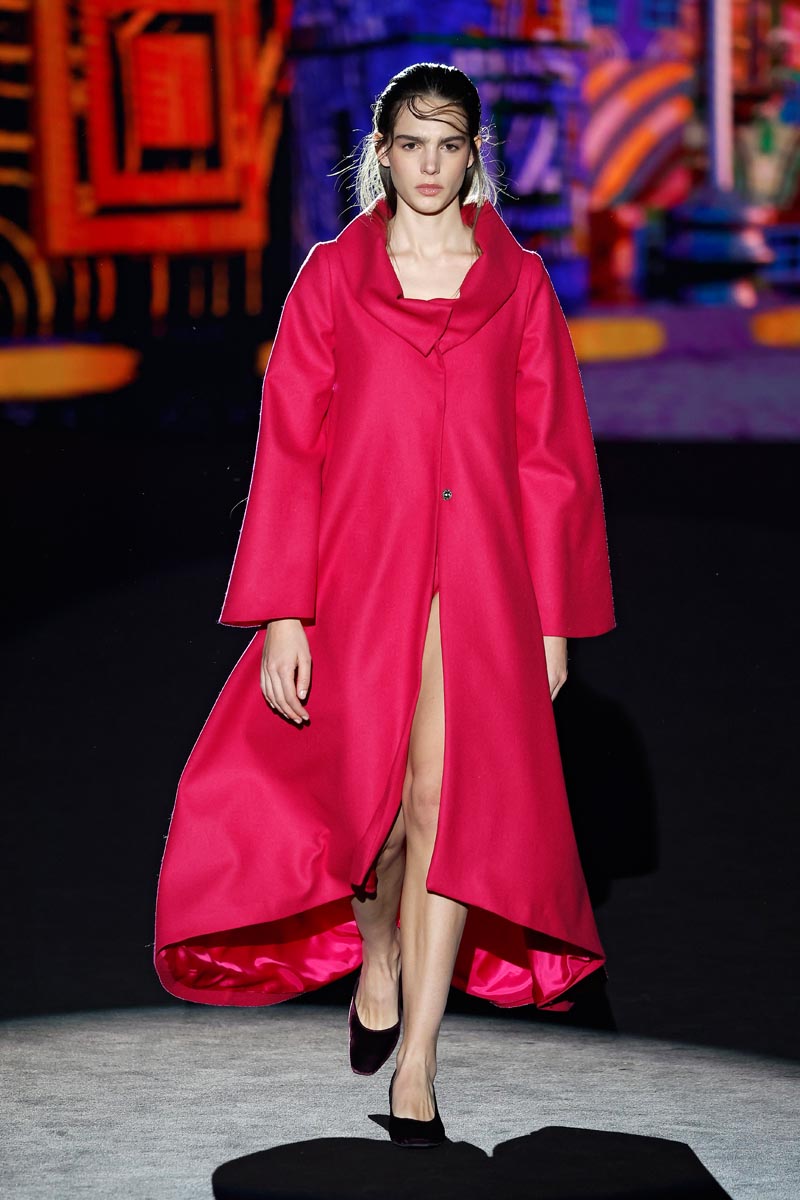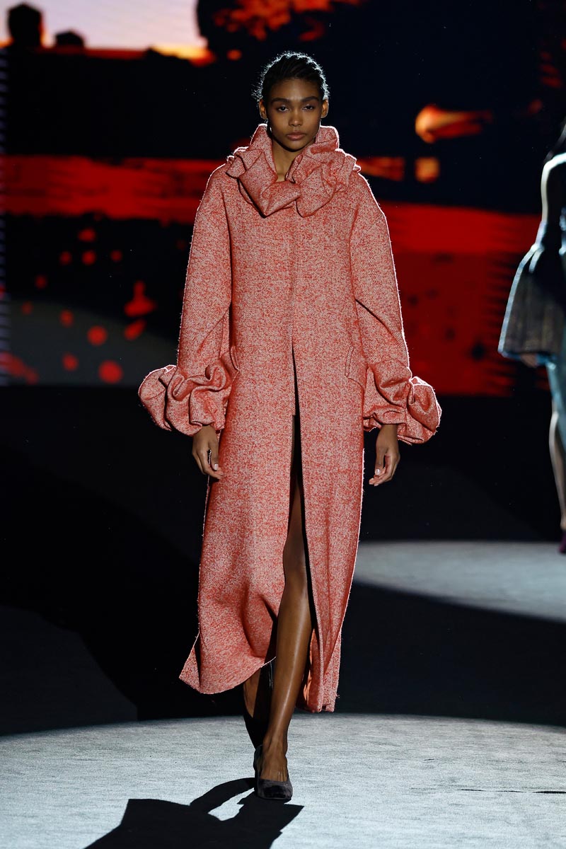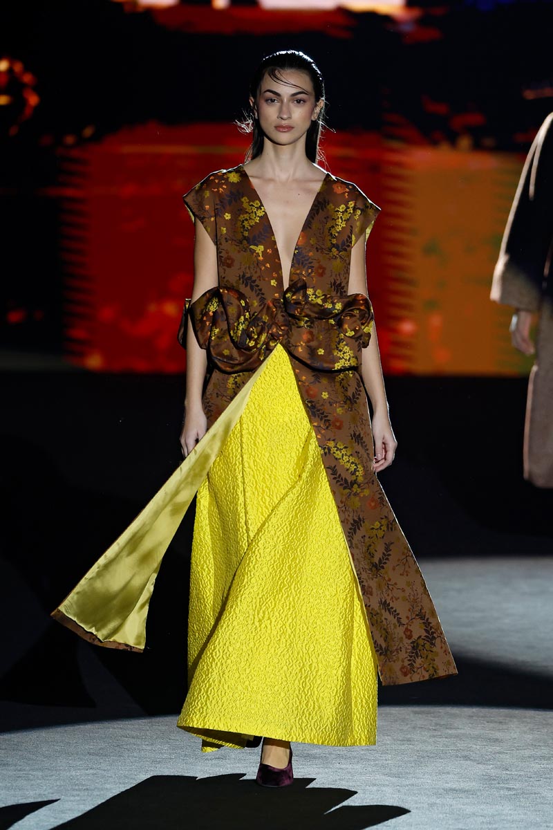 A collection made up of 25 looks narrated through three tempos, or compositions in continuous movement. The first part represents the morning with fabrics such as cloth or tweed in yellow and warm tones. The second tempo is made up of voluminous garments in contrast with more fitted pieces. Satin, taffeta and chiffon, in magenta and maroon tones, are added to tweed and cloth. Finally, the evening is present in the third movement with contrasting, dramatic volumes.