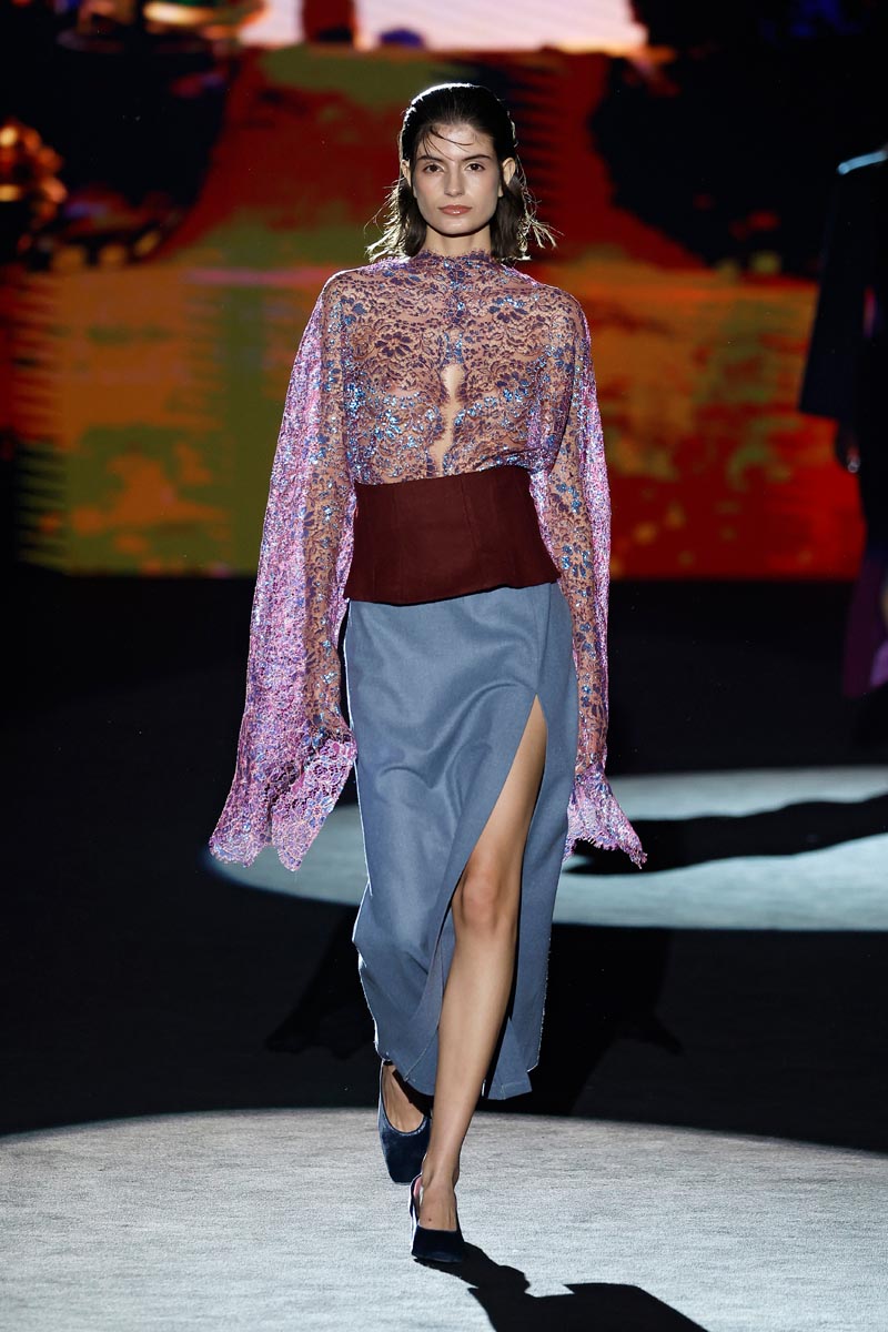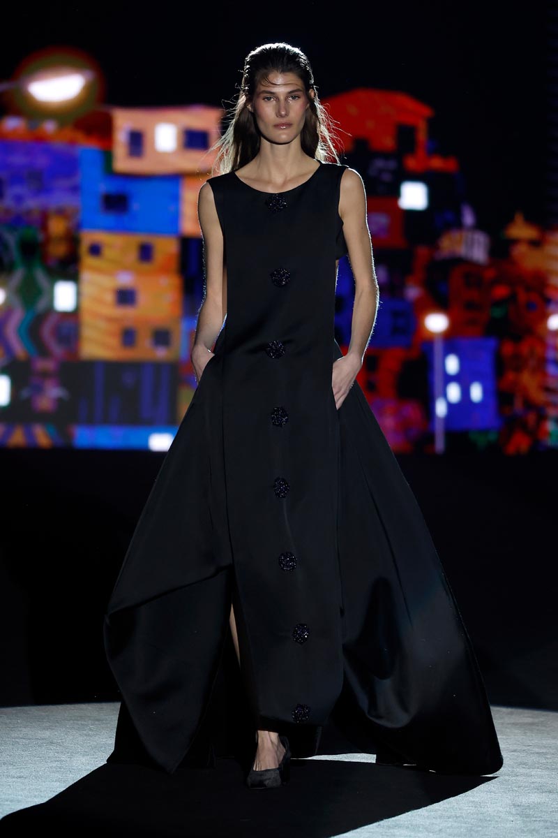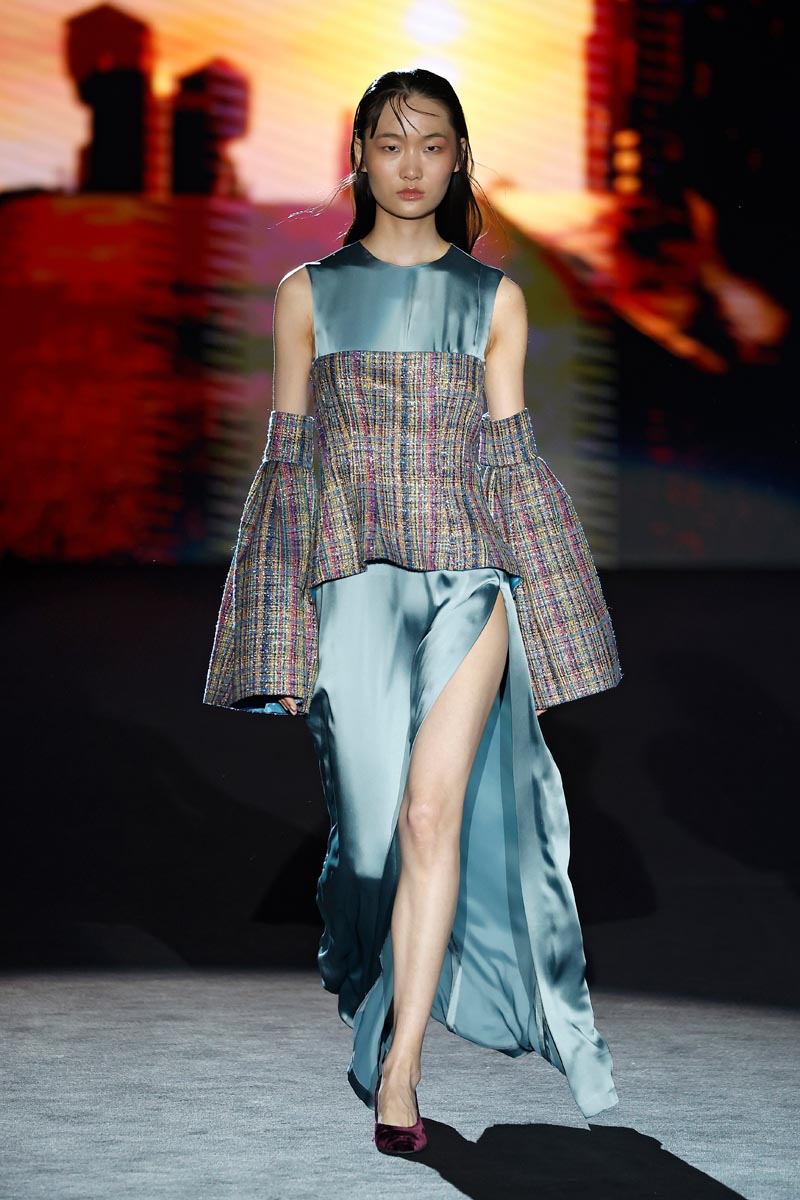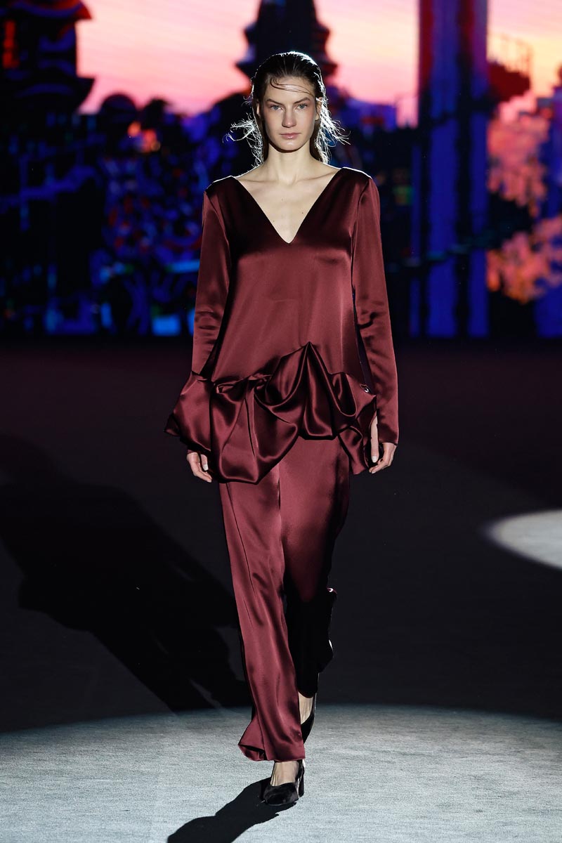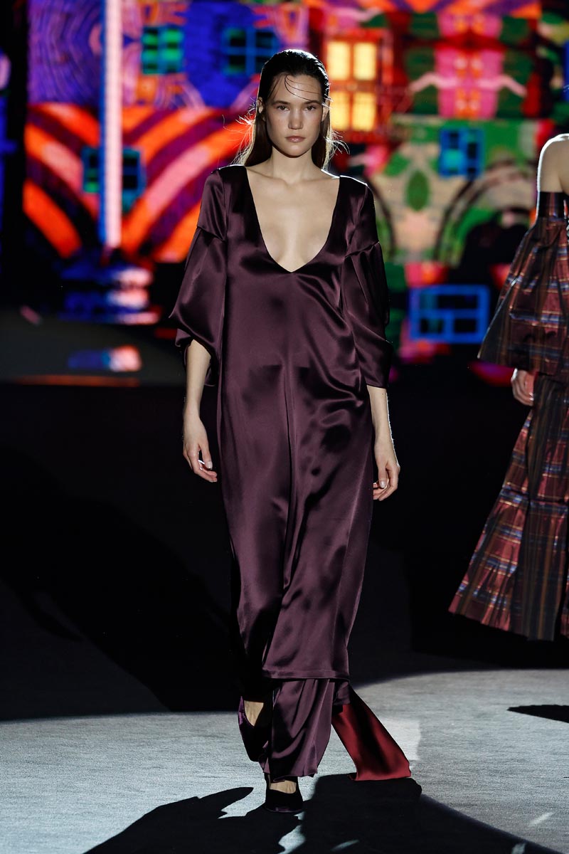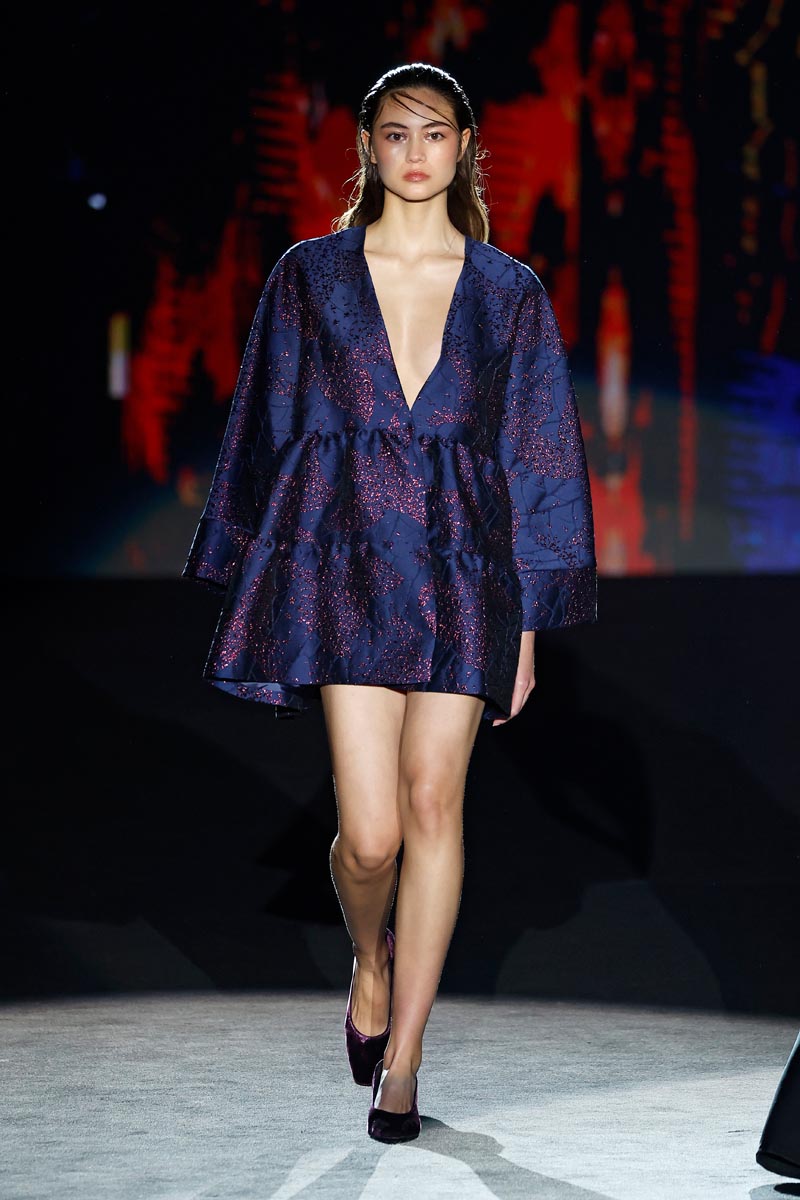 A collection made up of 25 looks narrated through three tempos, or compositions in continuous movement. The first part represents the morning with fabrics such as cloth or tweed in yellow and warm tones. The second tempo is made up of voluminous garments in contrast with more fitted pieces. Satin, taffeta and chiffon, in magenta and maroon tones, are added to tweed and cloth. Finally, the evening is present in the third movement with contrasting, dramatic volumes.