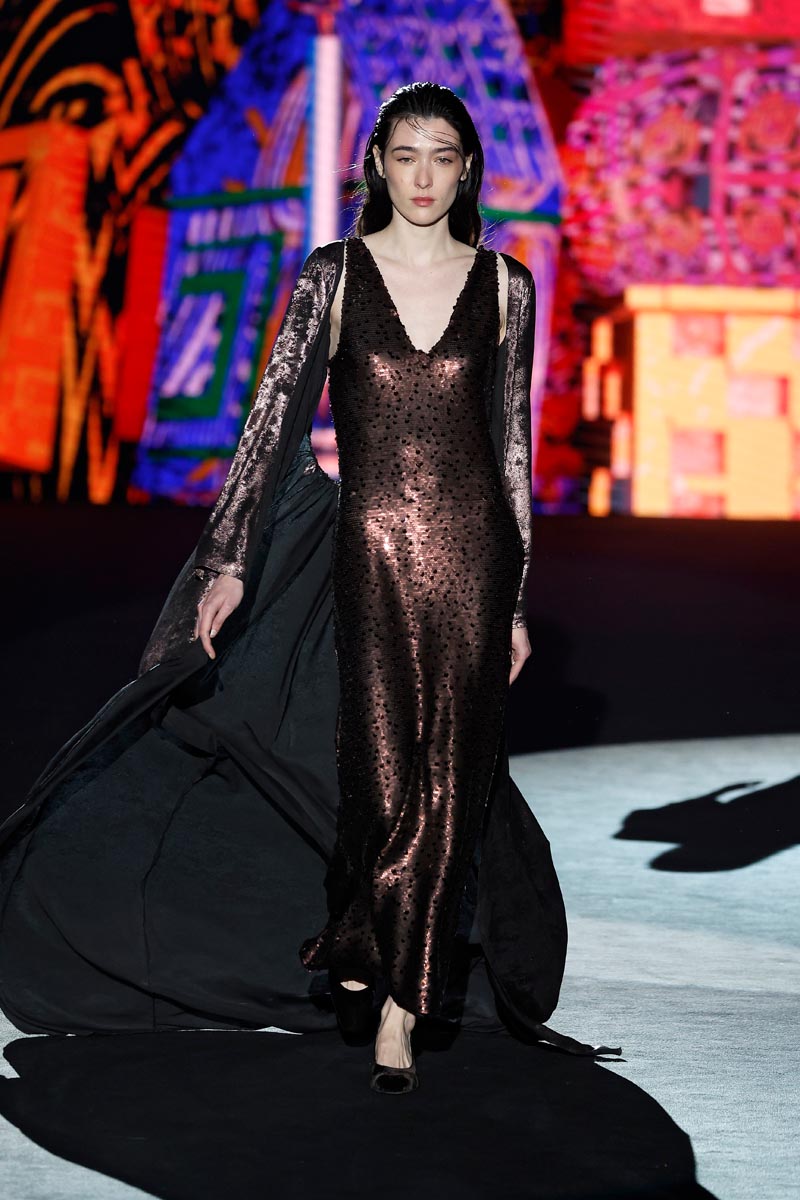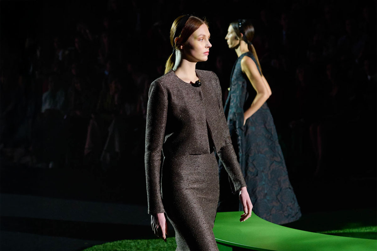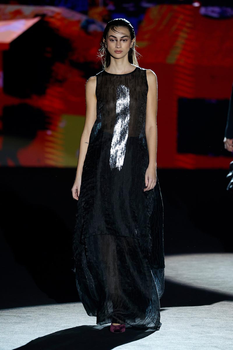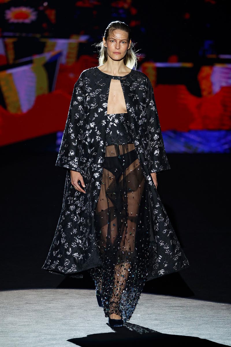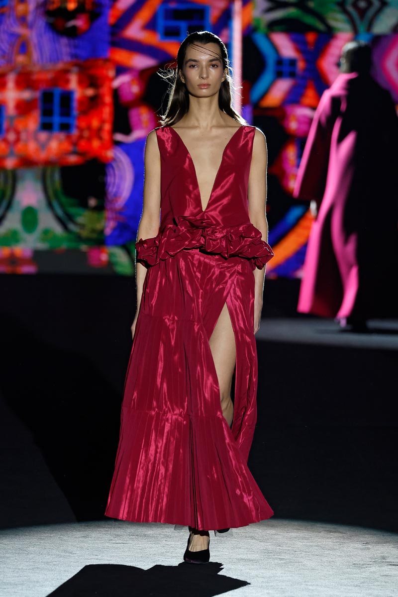 A collection made up of 25 looks narrated through three tempos, or compositions in continuous movement. The first part represents the morning with fabrics such as cloth or tweed in yellow and warm tones. The second tempo is made up of voluminous garments in contrast with more fitted pieces. Satin, taffeta and chiffon, in magenta and maroon tones, are added to tweed and cloth. Finally, the evening is present in the third movement with contrasting, dramatic volumes.