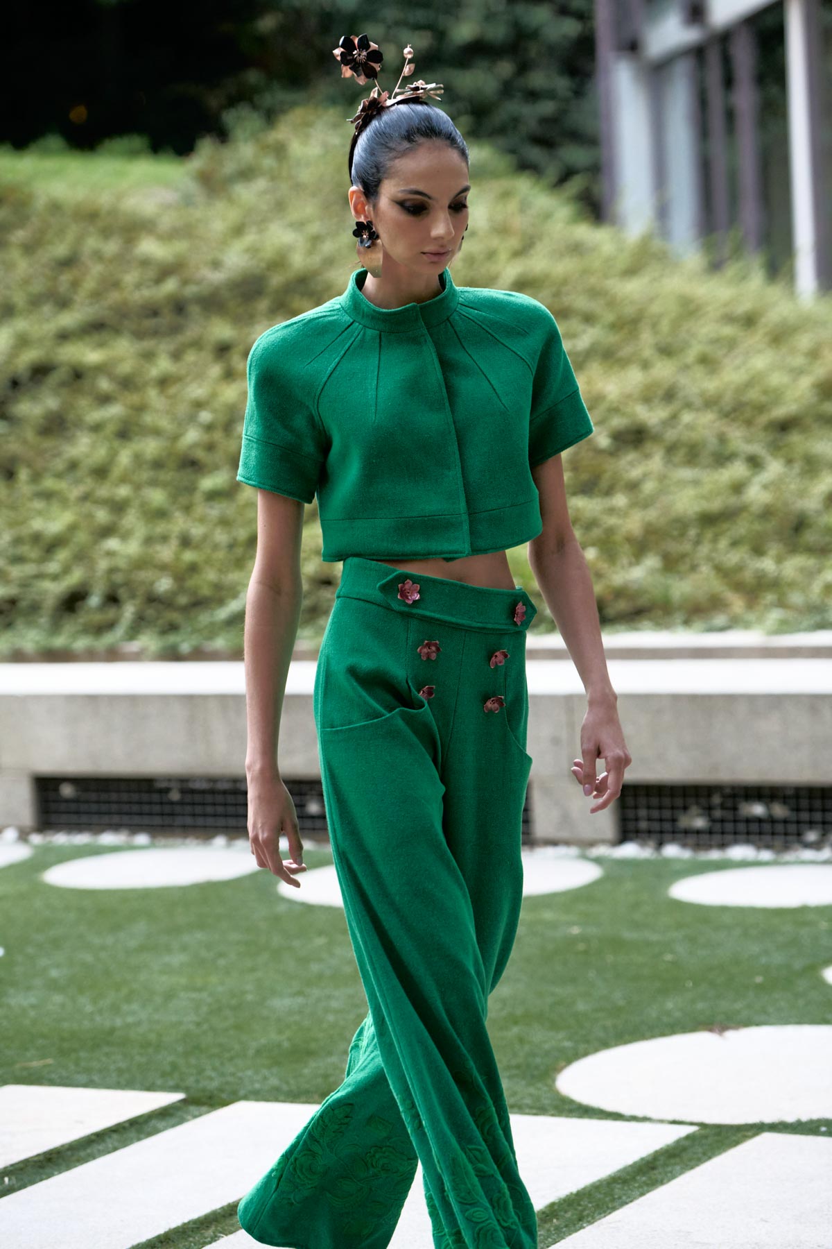 The fashion collection is complemented by the brand’s first jewelry line, created by Granada-based artisan María Soto, a descendant of a family of goldsmiths. Her pieces, crafted in vitrified copper, enamel, and gold from the Río Darro, extend the local tradition in a gesture of cultural continuity.