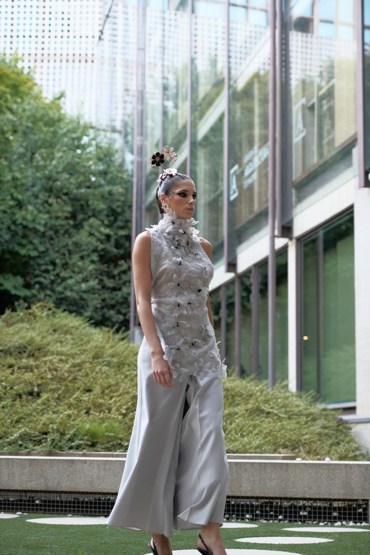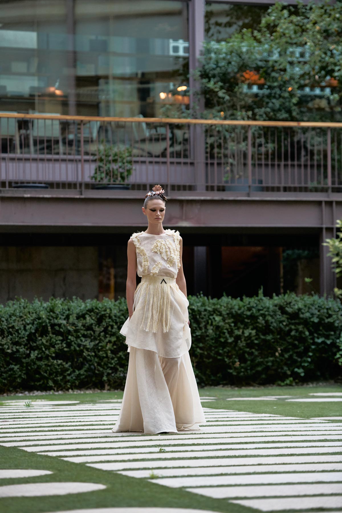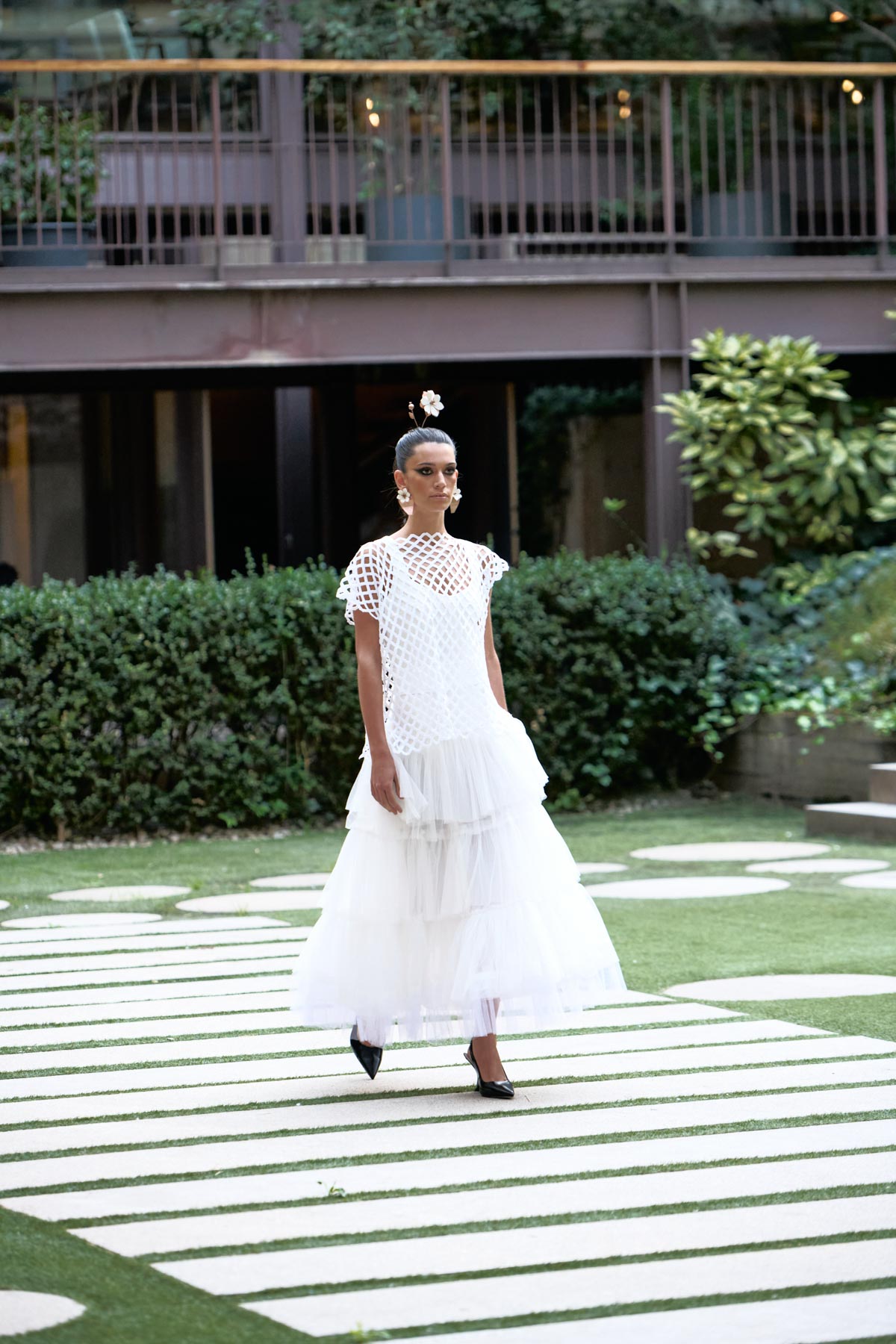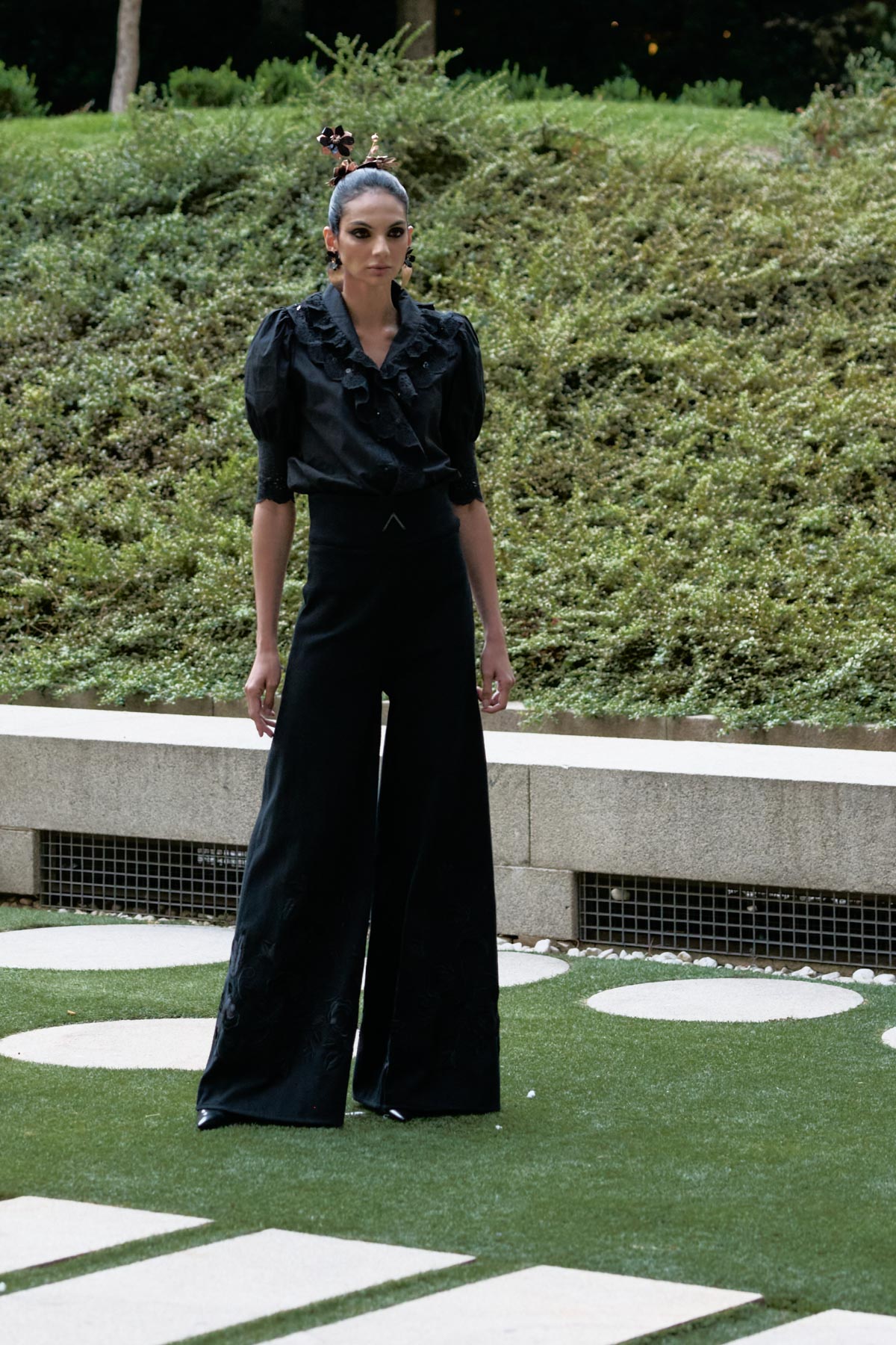 With this foundation, the silhouettes explore the flamenco aesthetic with unstructured, layered skirts, capes, waist-length cotton blouses, and voluminous sleeves that suggest dance movements. Fabrics—silk, embroidered tulle, cotton with metallic sequins, and recycled Alpujarra fabrics—are mixed with technical and metallic materials, creating contrasts between the ancestral and the urban. The handcrafted embroideries, inspired by traditional polka dots and mantilla patterns, are reduced to abstract lines, reinforcing the collection’s minimalist aesthetic.