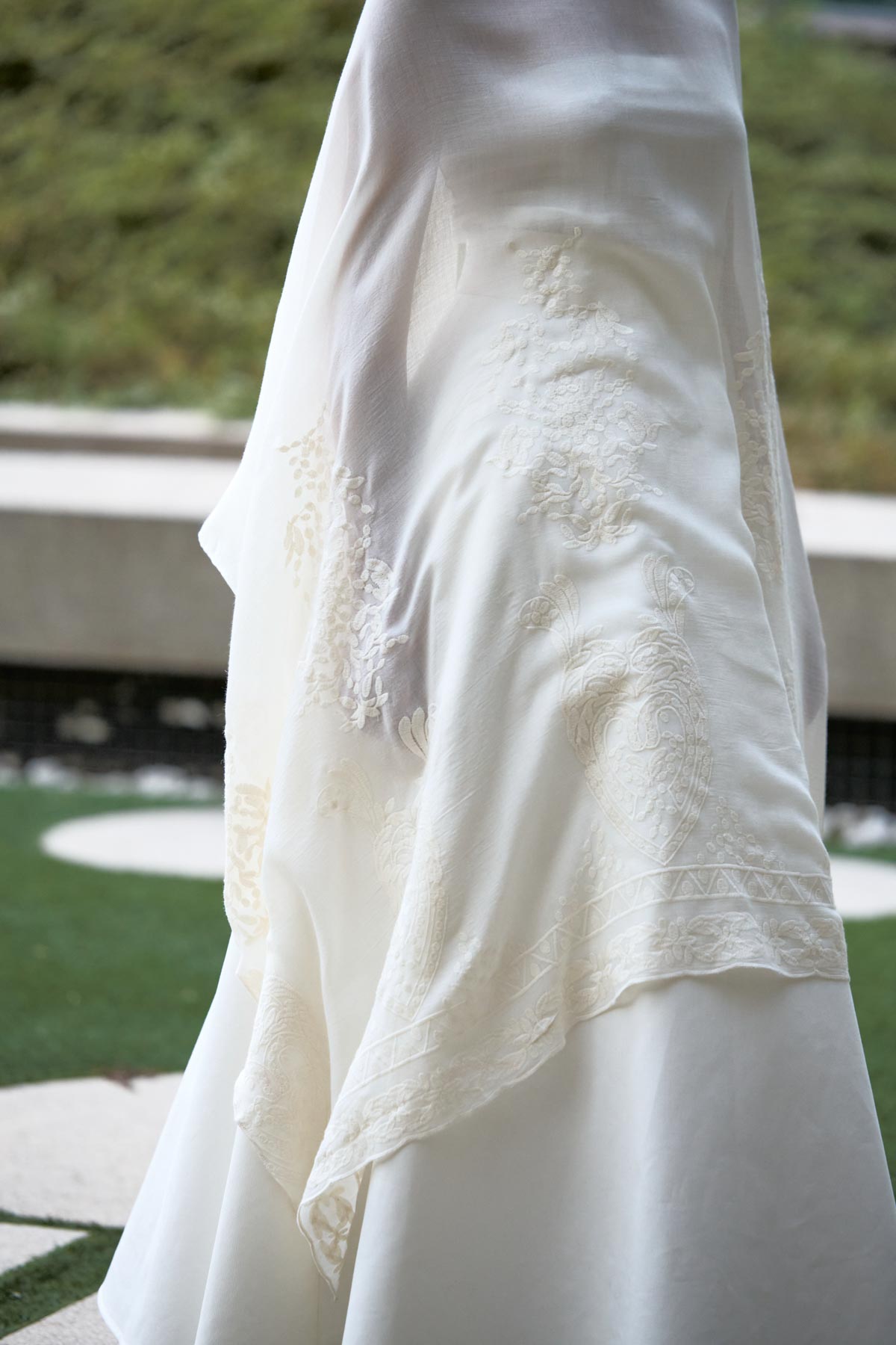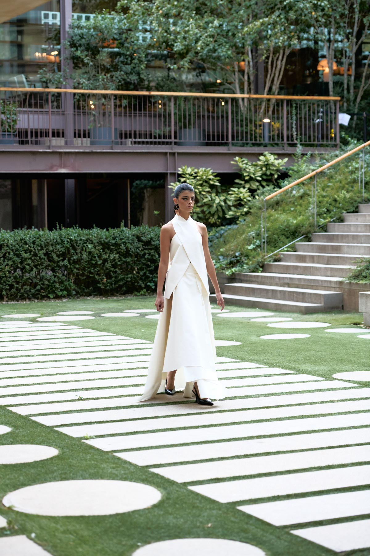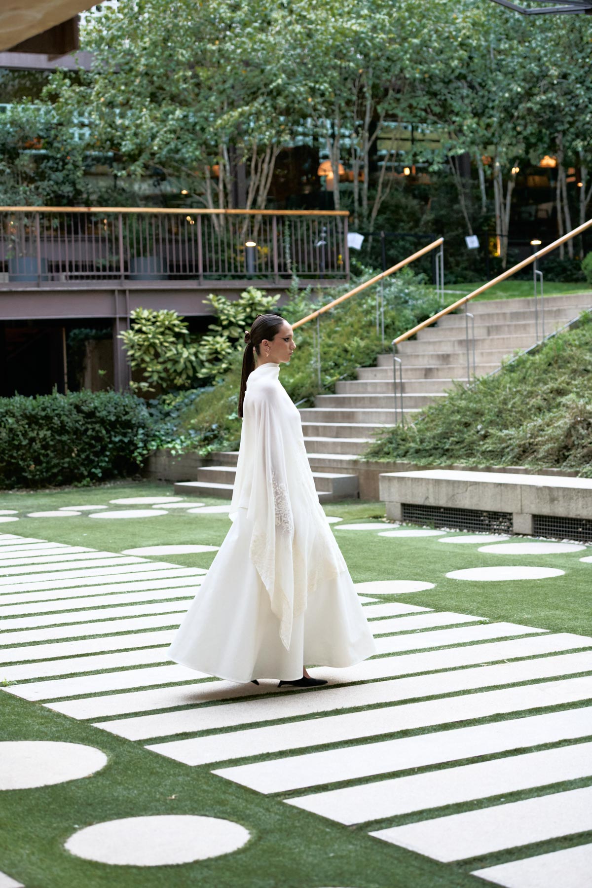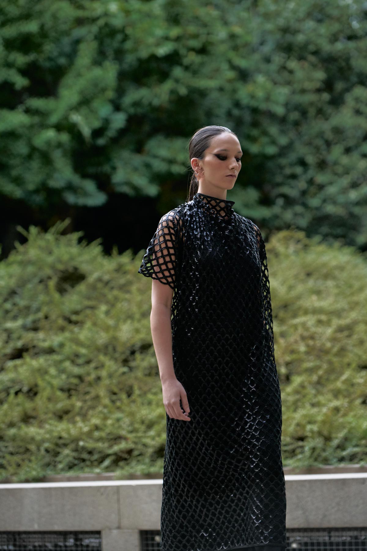 With this foundation, the silhouettes explore the flamenco aesthetic with unstructured, layered skirts, capes, waist-length cotton blouses, and voluminous sleeves that suggest dance movements. Fabrics—silk, embroidered tulle, cotton with metallic sequins, and recycled Alpujarra fabrics—are mixed with technical and metallic materials, creating contrasts between the ancestral and the urban. The handcrafted embroideries, inspired by traditional polka dots and mantilla patterns, are reduced to abstract lines, reinforcing the collection’s minimalist aesthetic.
