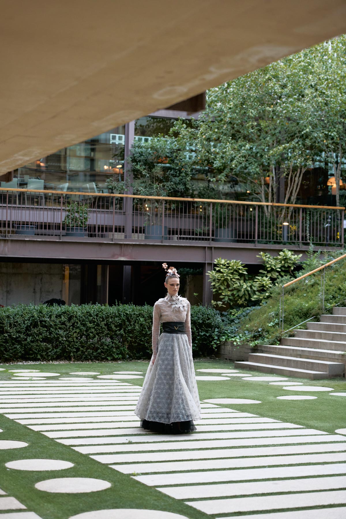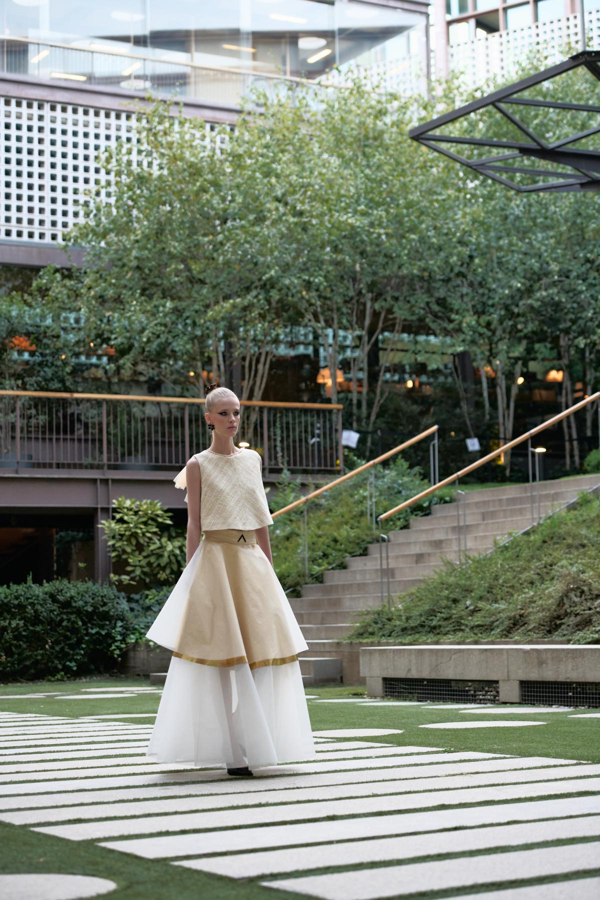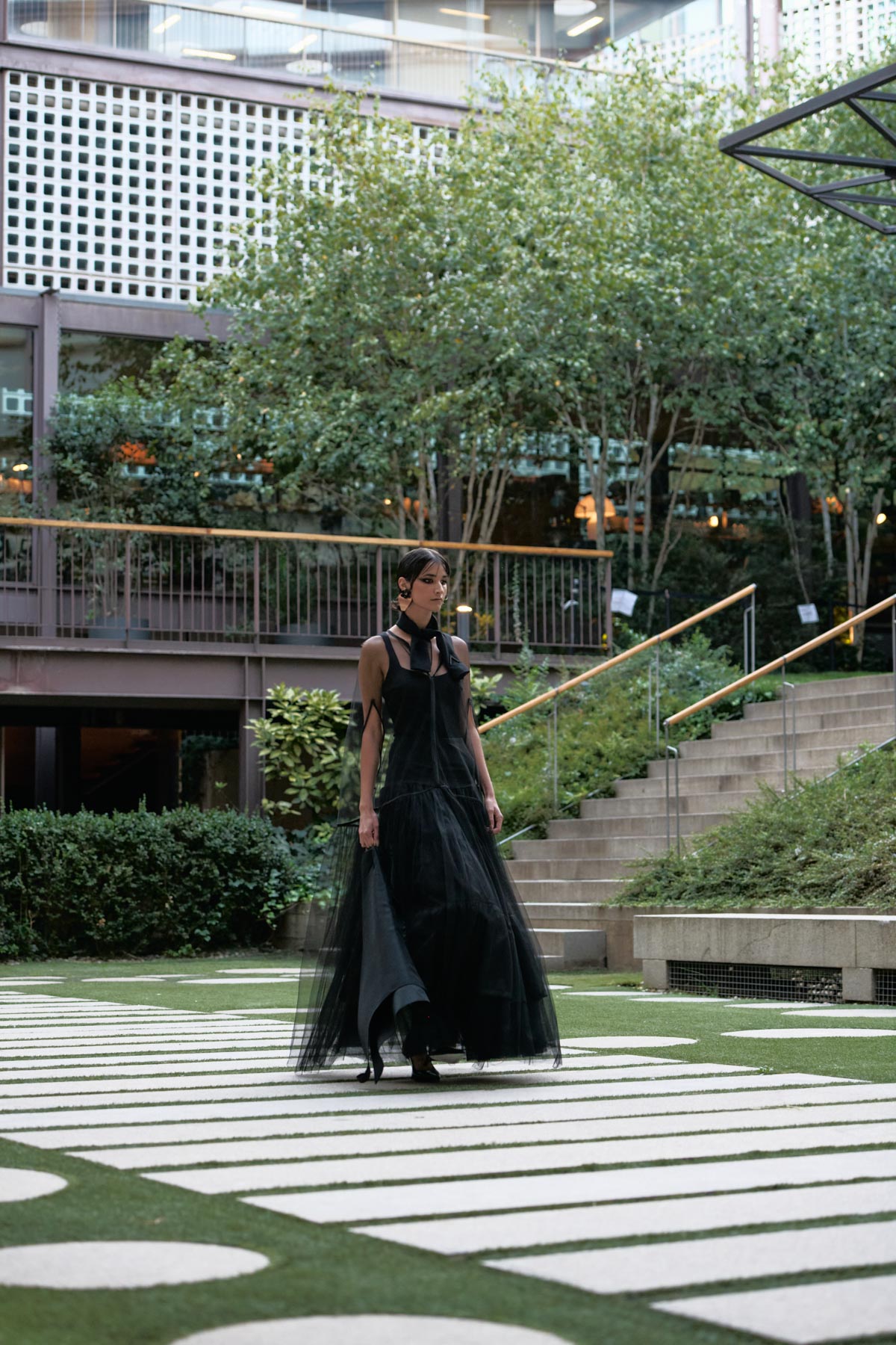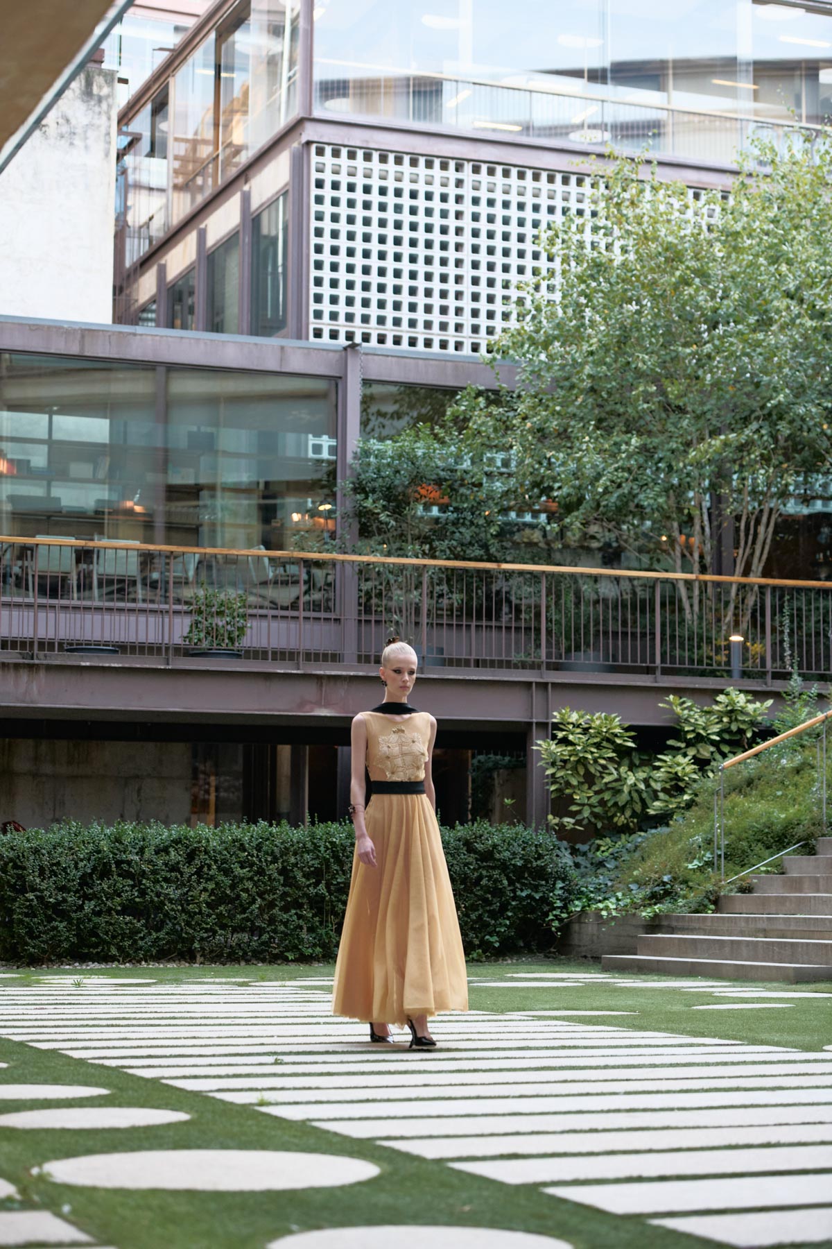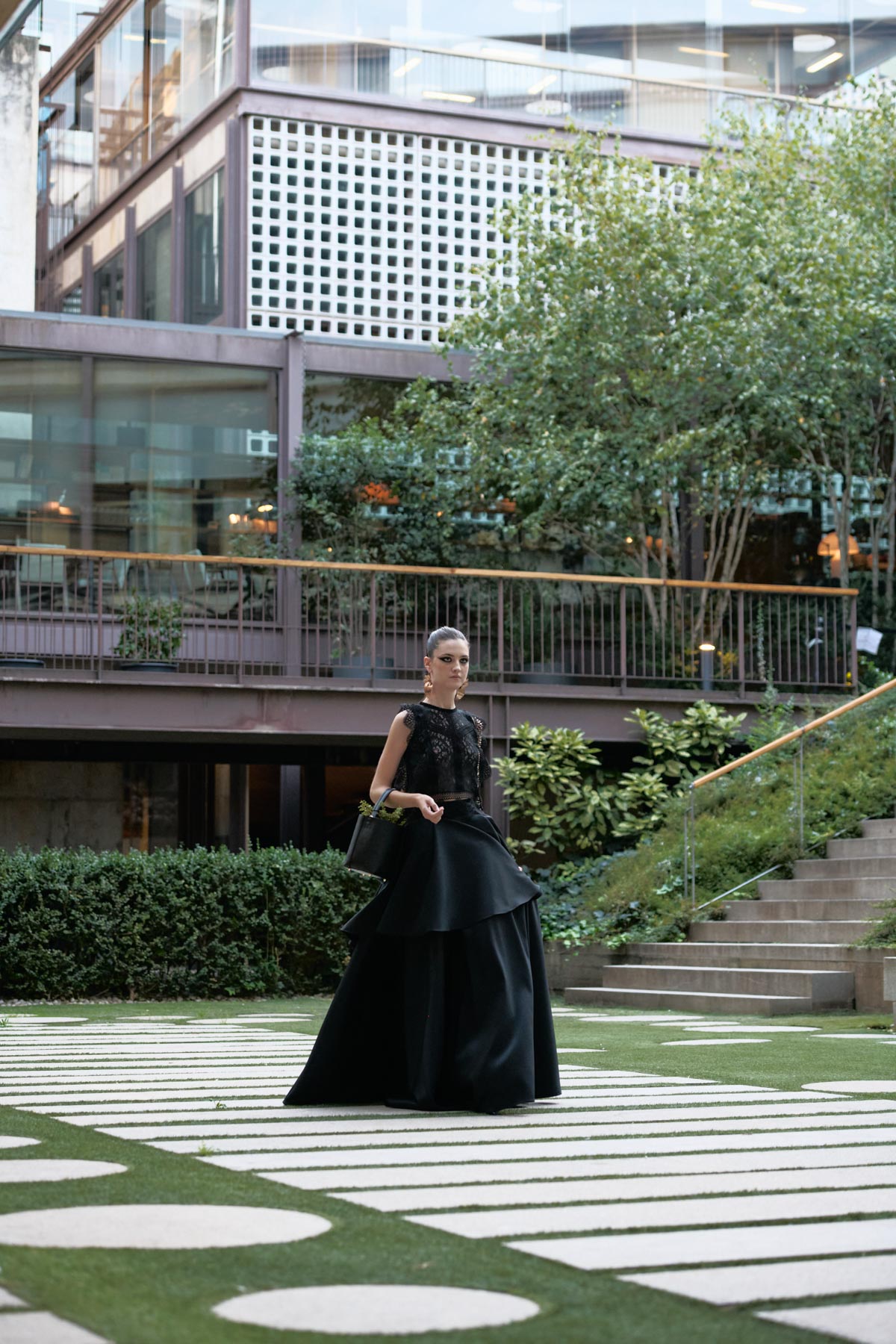 With this foundation, the silhouettes explore the flamenco aesthetic with unstructured, layered skirts, capes, waist-length cotton blouses, and voluminous sleeves that suggest dance movements. Fabrics—silk, embroidered tulle, cotton with metallic sequins, and recycled Alpujarra fabrics—are mixed with technical and metallic materials, creating contrasts between the ancestral and the urban. The handcrafted embroideries, inspired by traditional polka dots and mantilla patterns, are reduced to abstract lines, reinforcing the collection’s minimalist aesthetic.