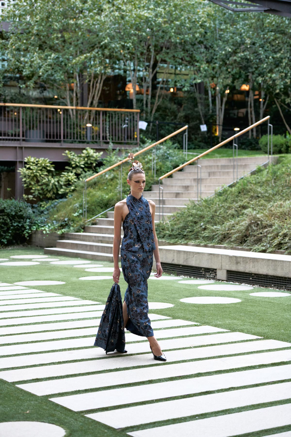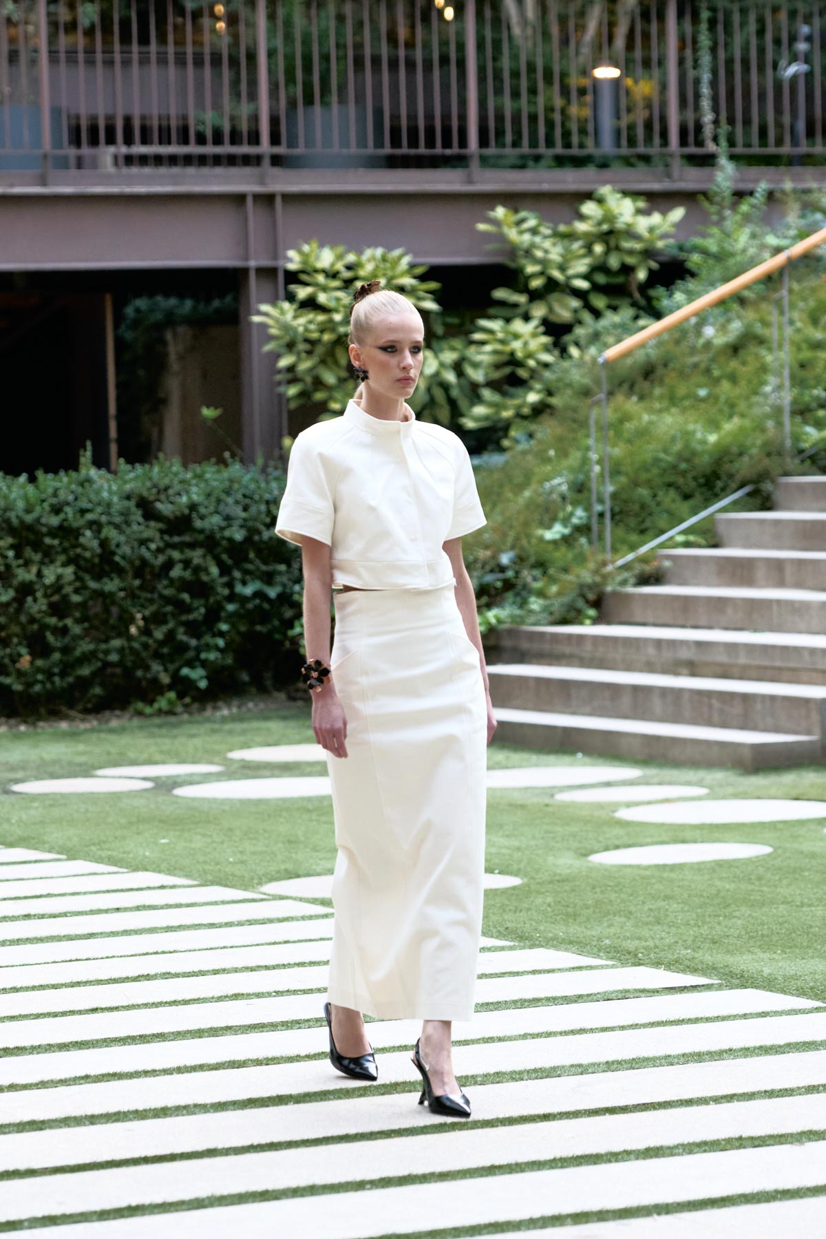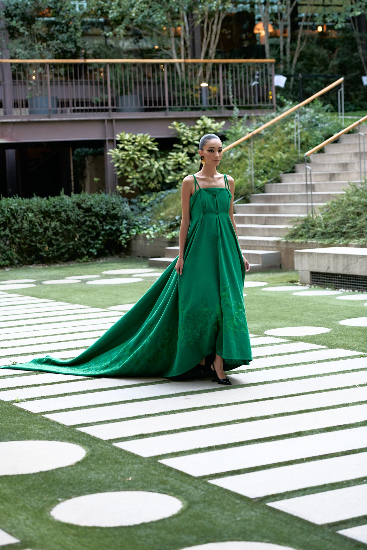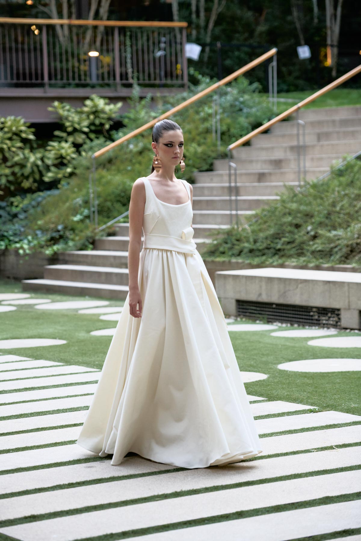 With this foundation, the silhouettes explore the flamenco aesthetic with unstructured, layered skirts, capes, waist-length cotton blouses, and voluminous sleeves that suggest dance movements. Fabrics—silk, embroidered tulle, cotton with metallic sequins, and recycled Alpujarra fabrics—are mixed with technical and metallic materials, creating contrasts between the ancestral and the urban. The handcrafted embroideries, inspired by traditional polka dots and mantilla patterns, are reduced to abstract lines, reinforcing the collection’s minimalist aesthetic.